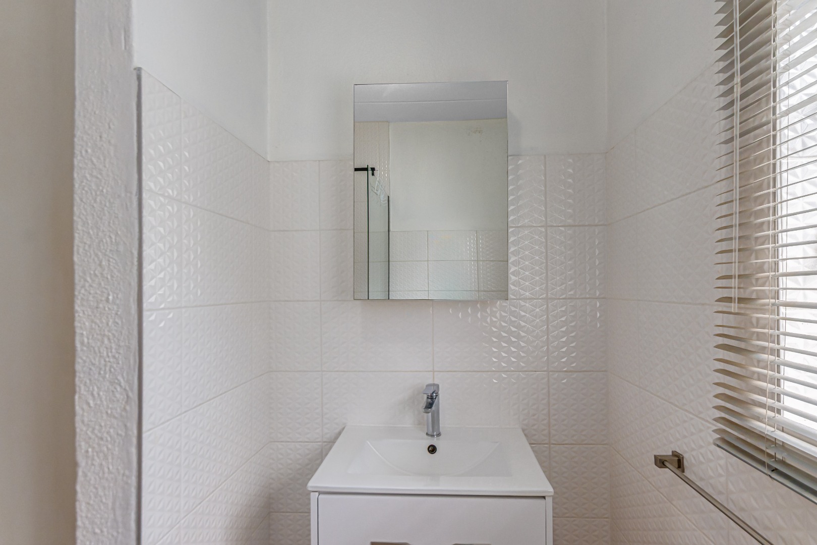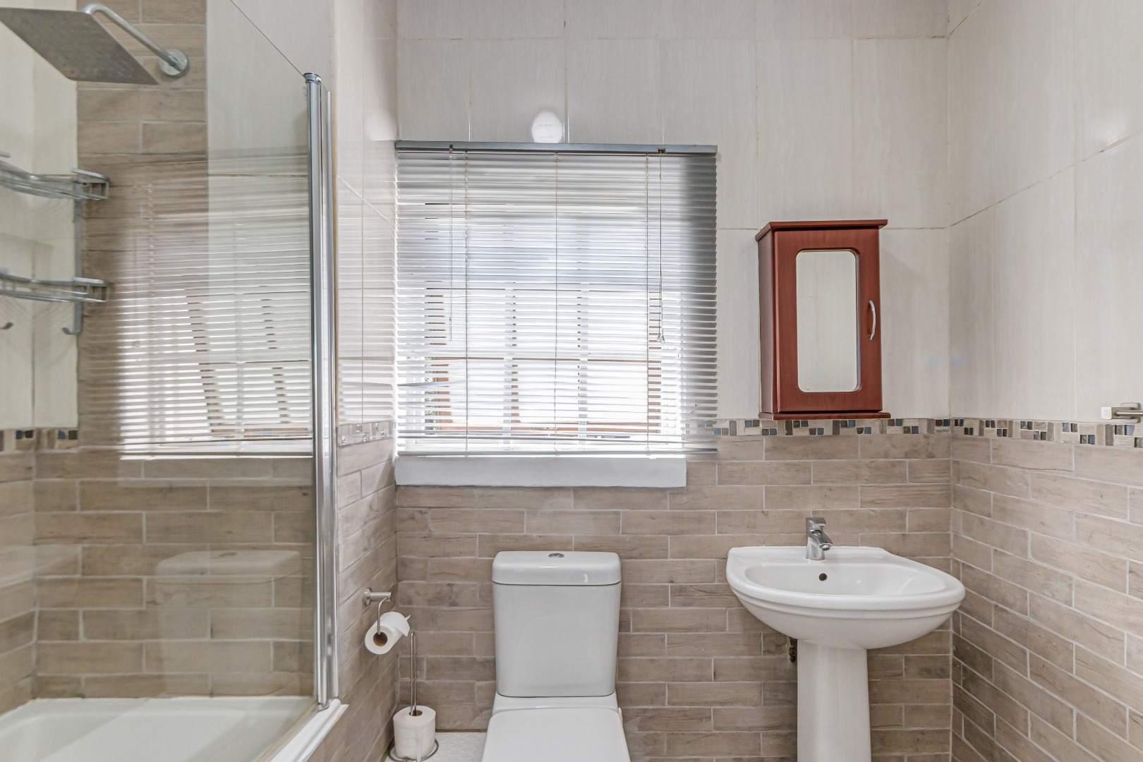 The property includes two well-proportioned bedrooms and two bathrooms, one of which boasts a shower-over-bath with a modern rainfall showerhead and full tiling for easy maintenance. Built-in cupboards offer practical storage solutions.