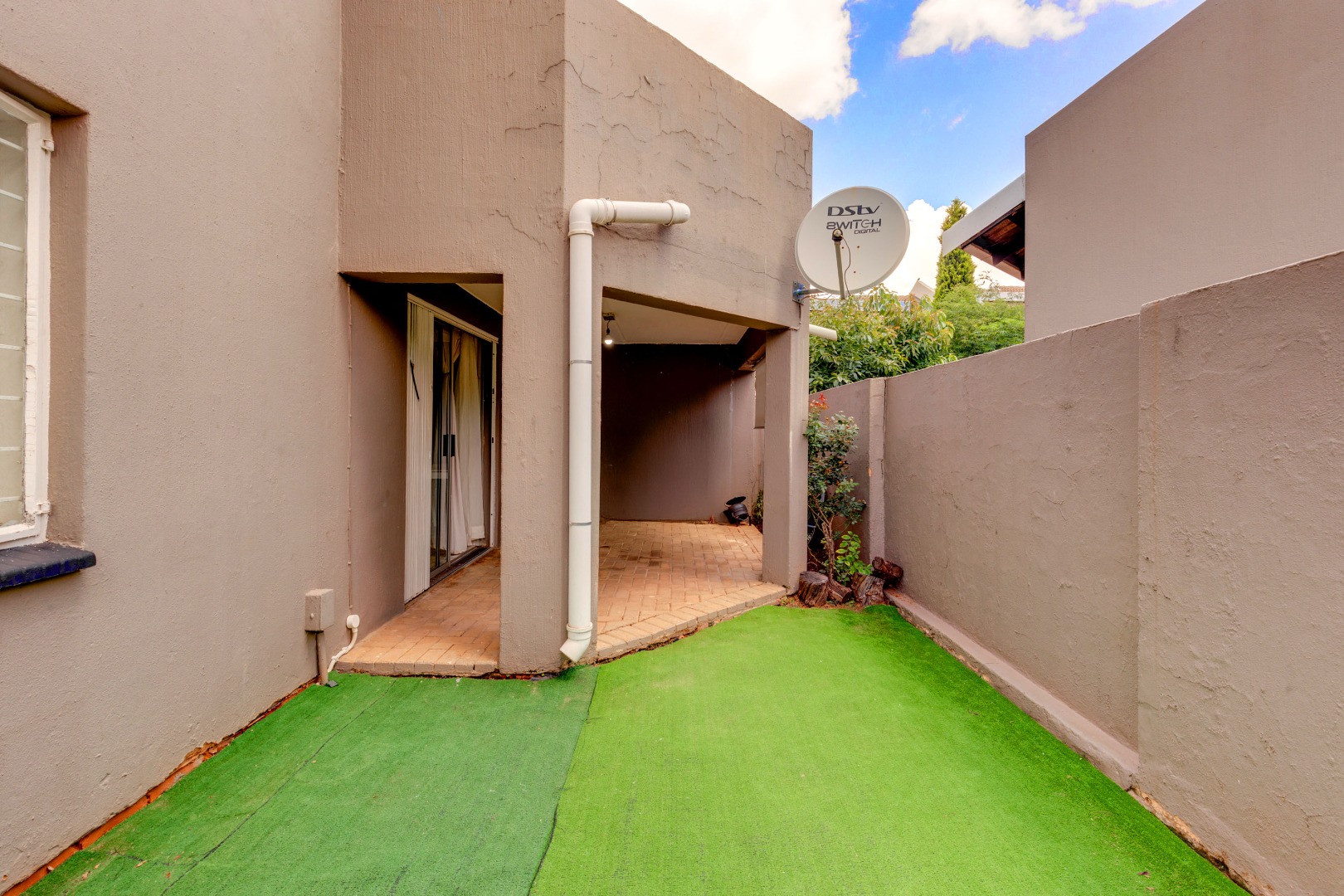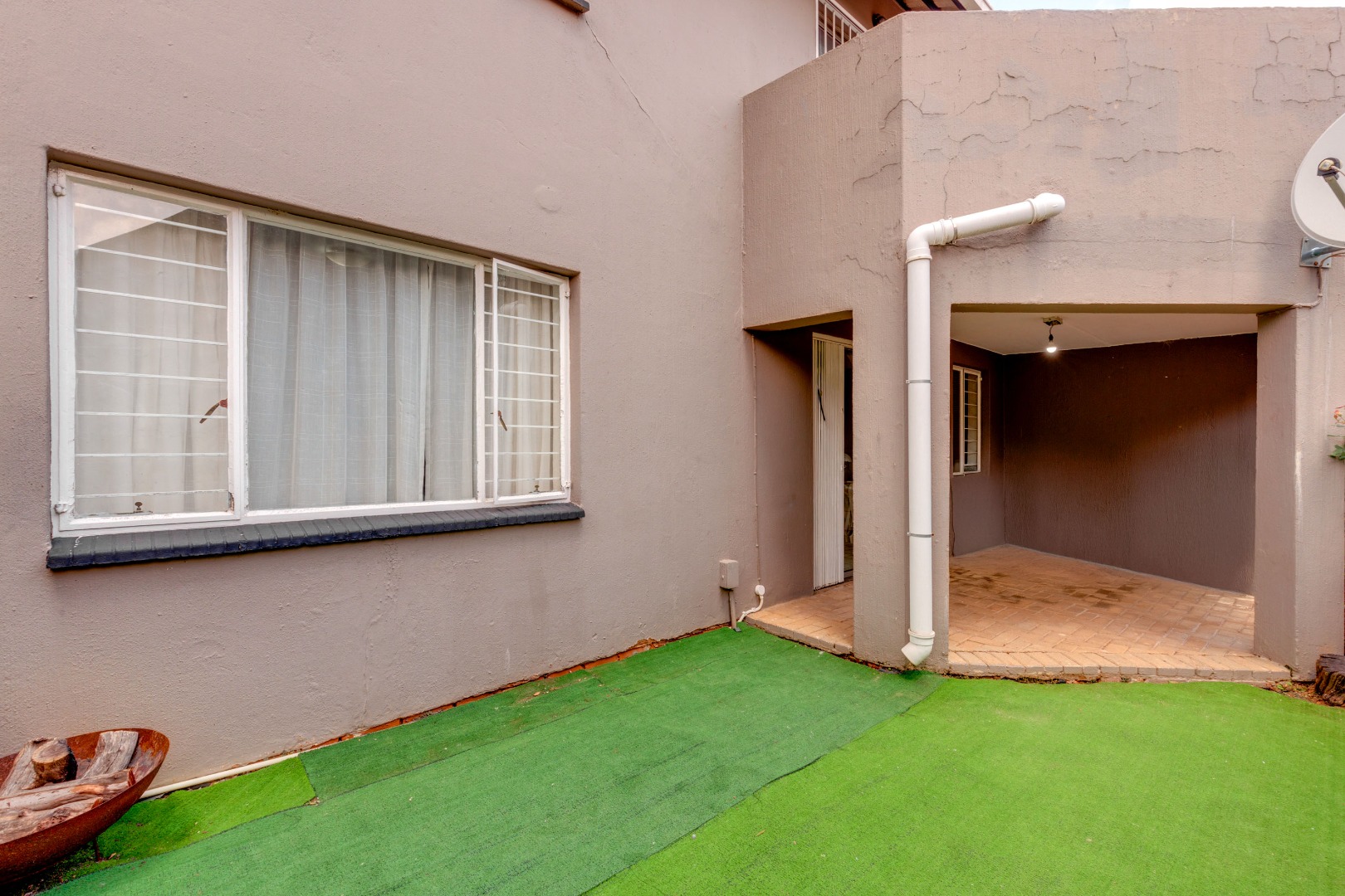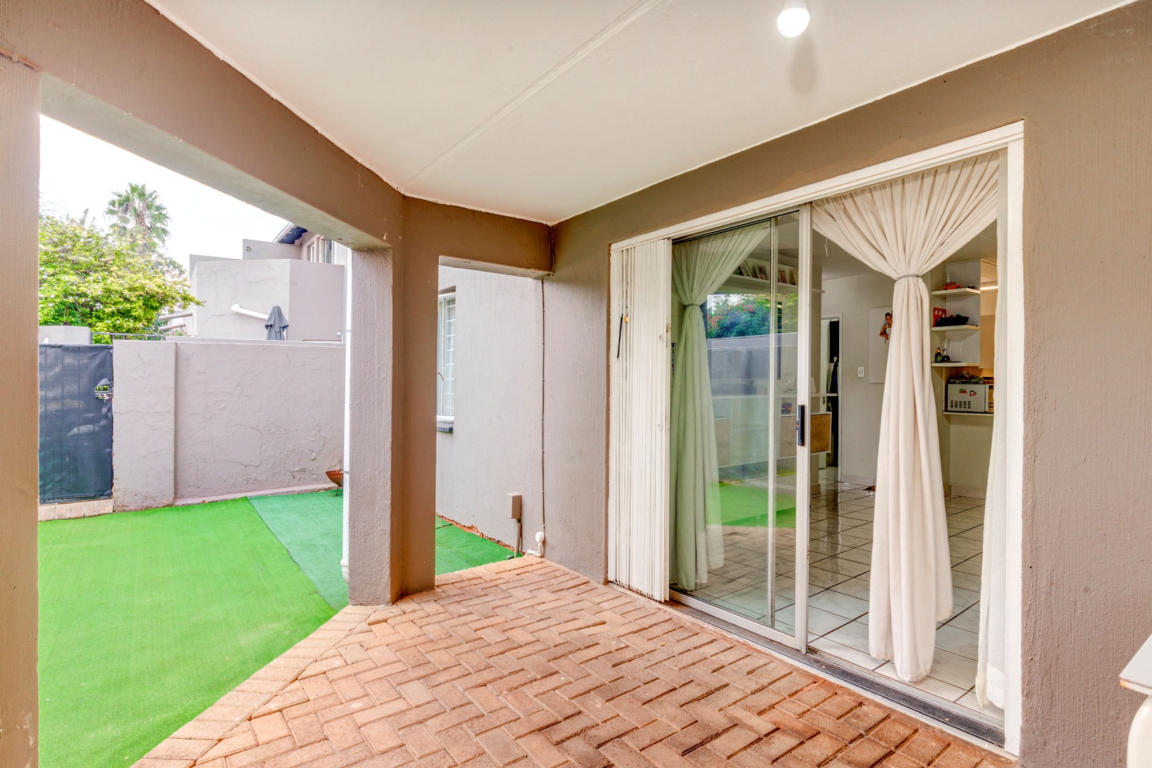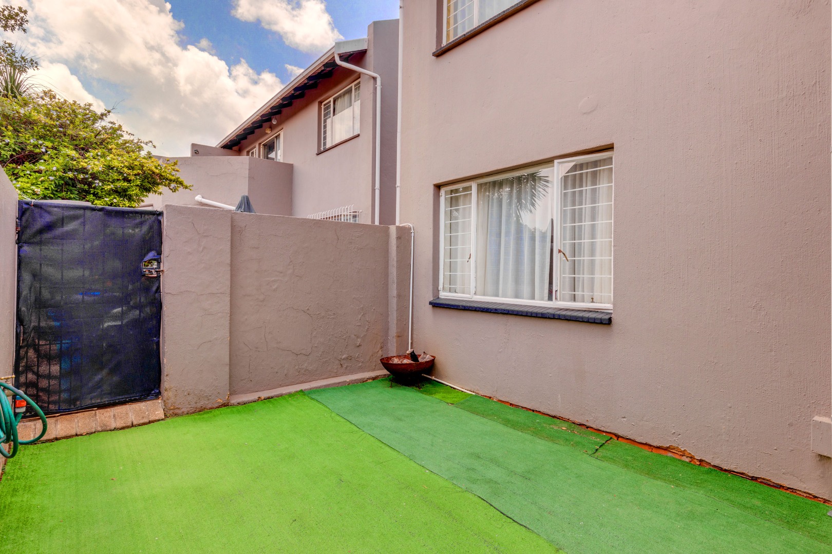 As you step outside, you are greeted by a charming, covered patio area that leads to a private garden with astroturf, a serene spot perfect for relaxation or hosting friends and family. The complex is also pet-friendly for up to two small to medium pets.