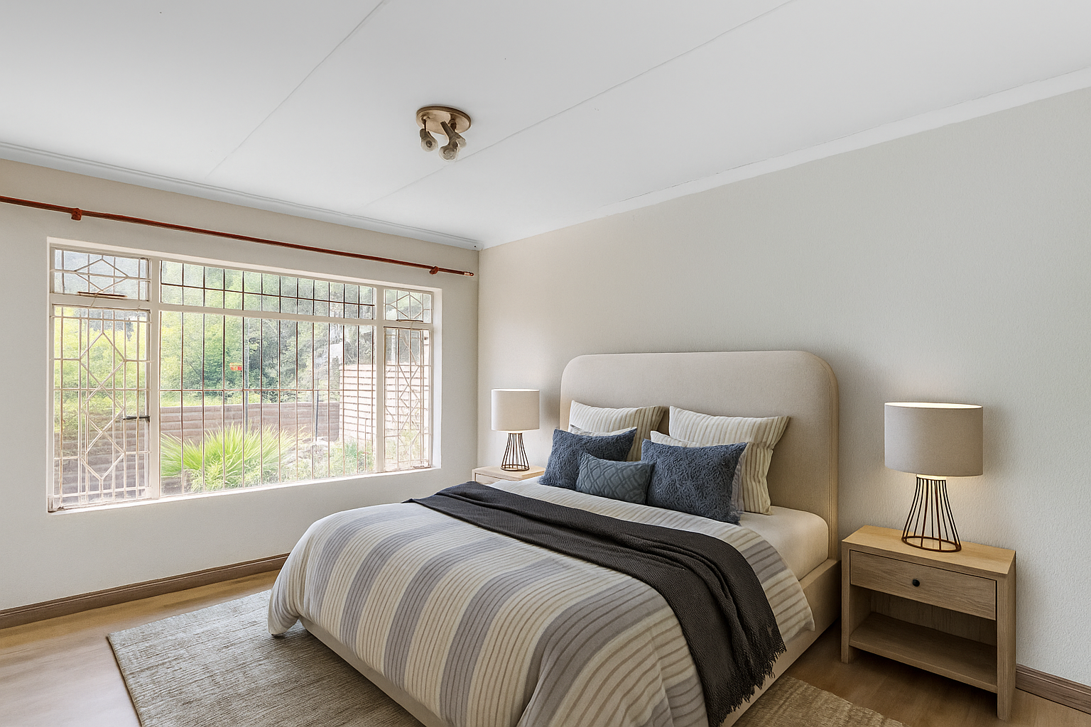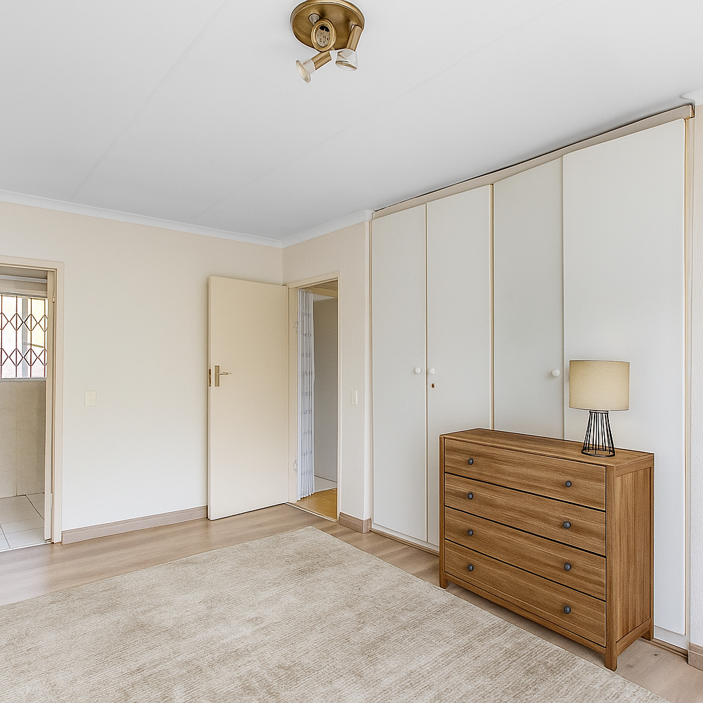 The home comprises two well-proportioned bedrooms, ensuring privacy and comfort. The main bedroom benefits from an en-suite bathroom, while a second bathroom serves the additional bedroom and guests. Both bedrooms feature newly installed wood-look laminate flooring and neutral wall colours, offering a versatile canvas for personalisation. Large windows, fitted with burglar bars for enhanced security, allow ample natural light.