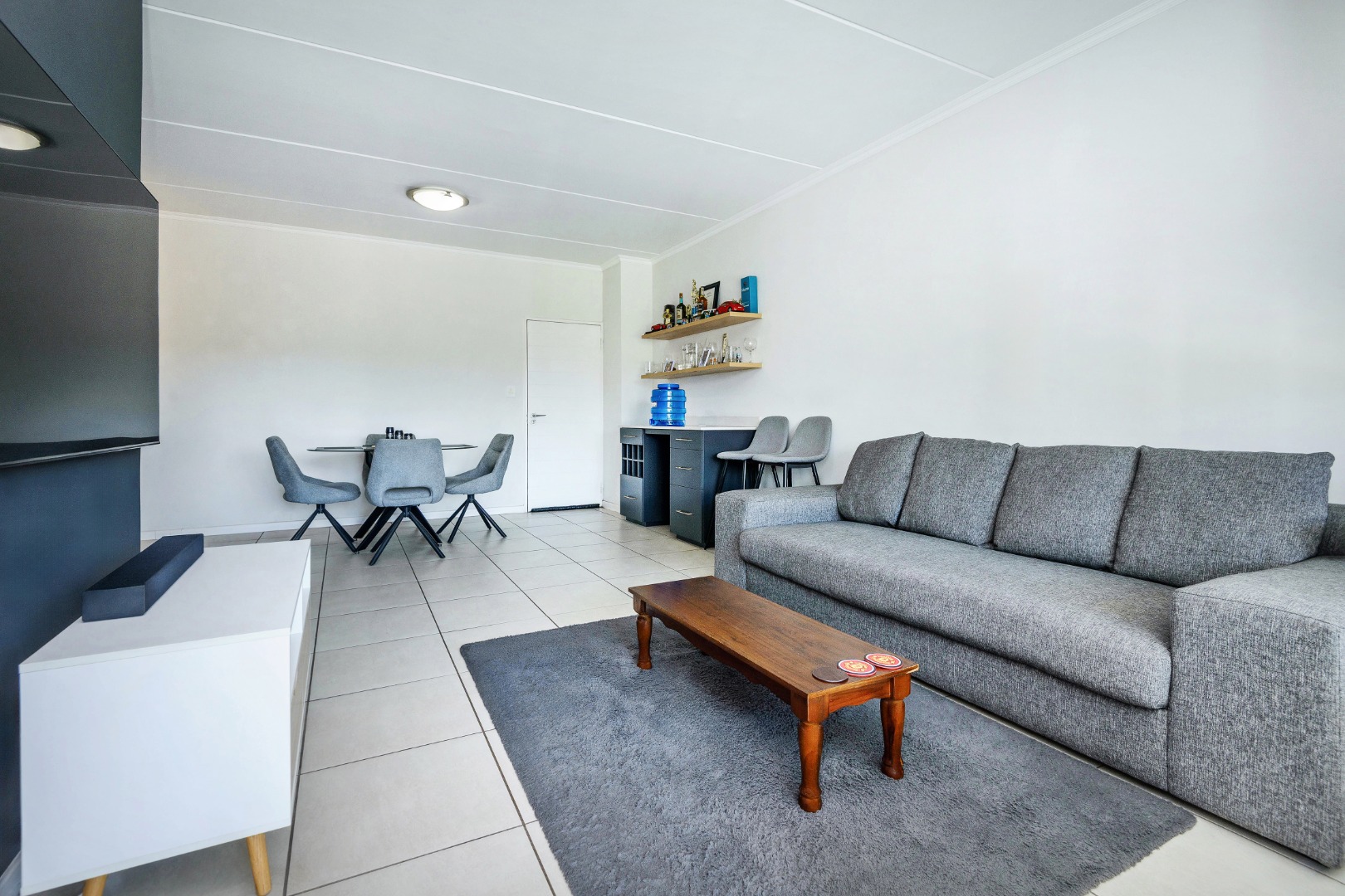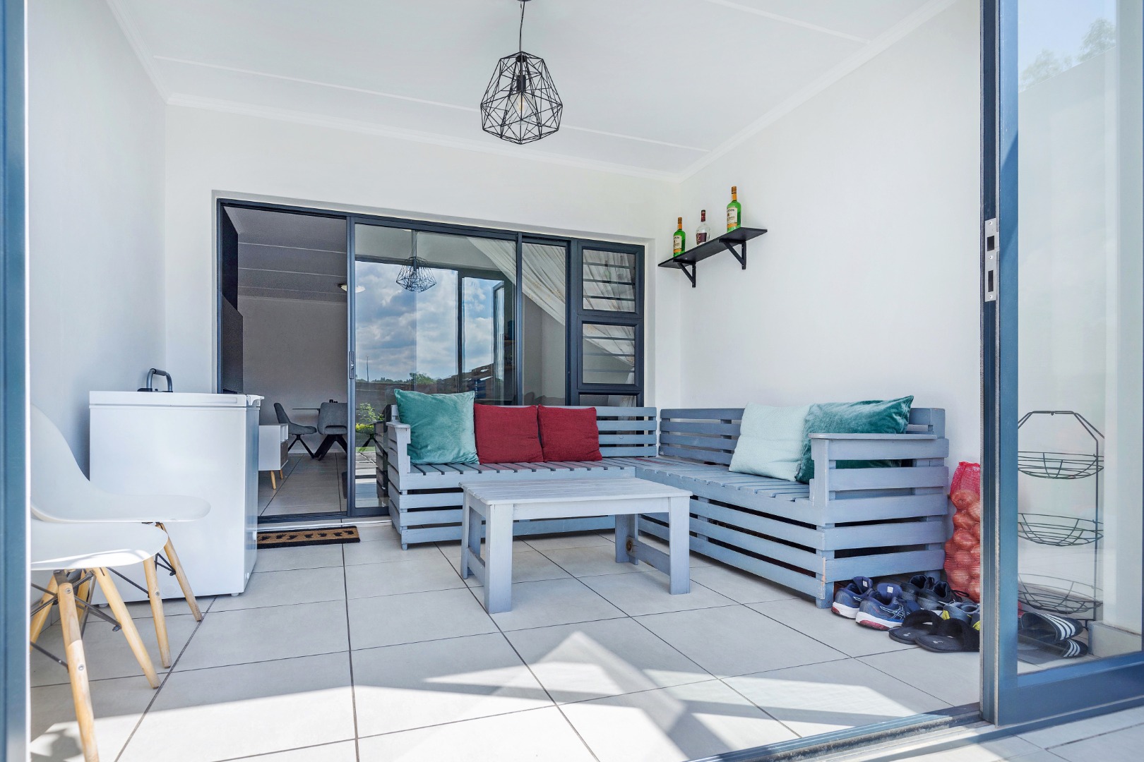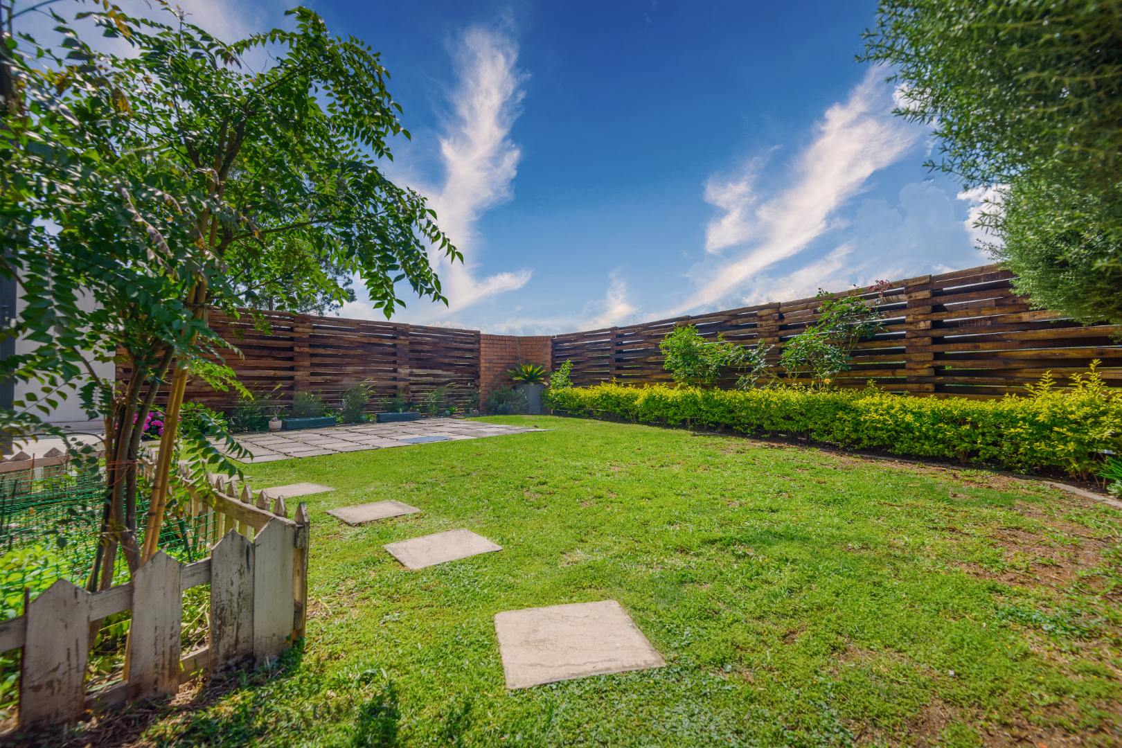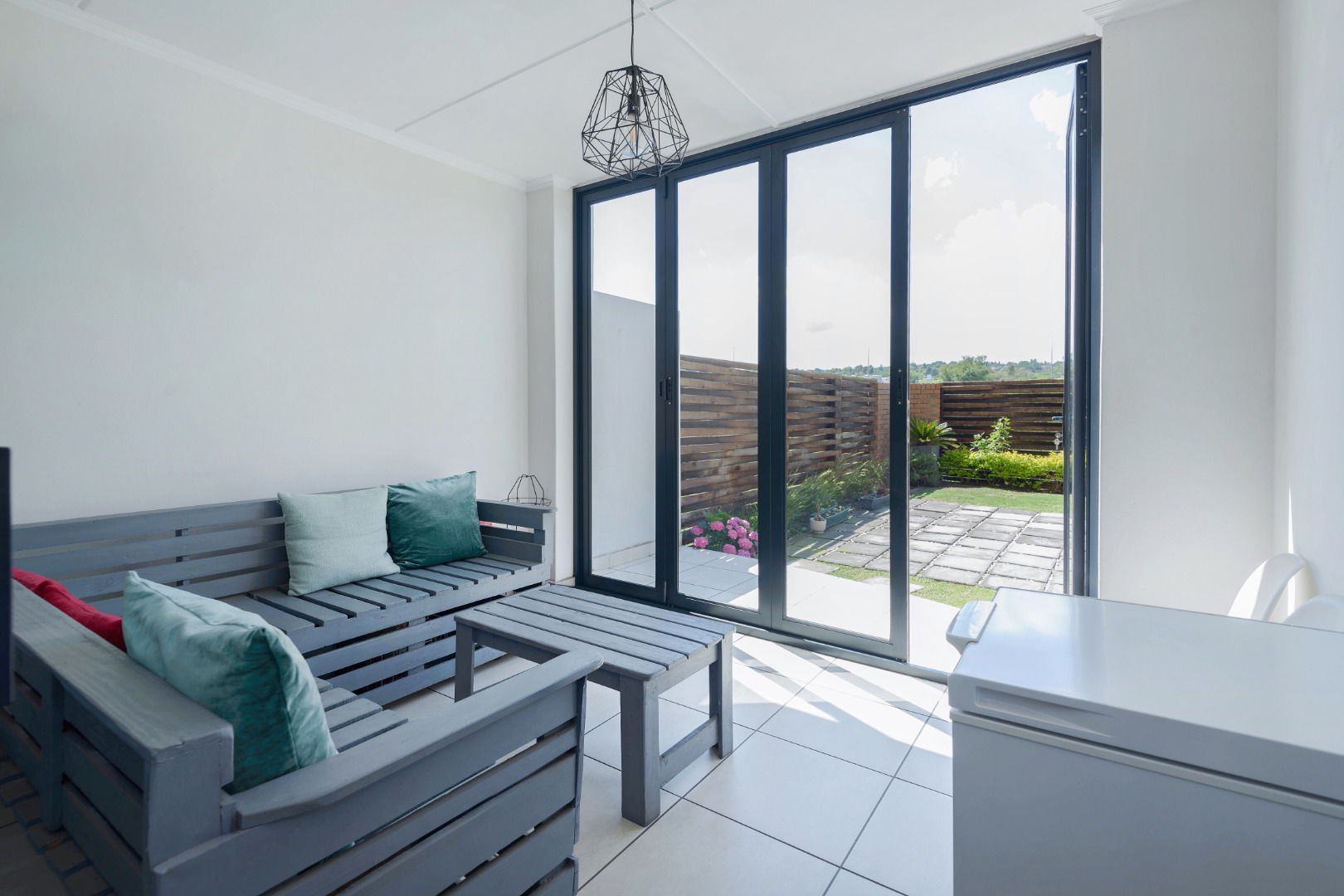 The living area opens through large sliding doors to a private patio and garden—perfect for entertaining, relaxing, or creating a safe outdoor play space for children or pets.