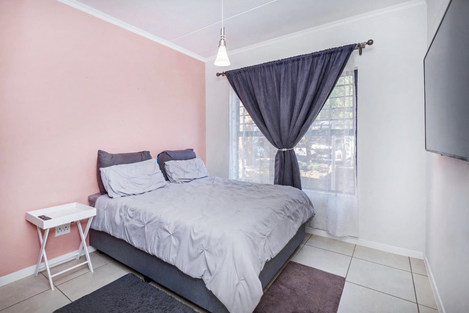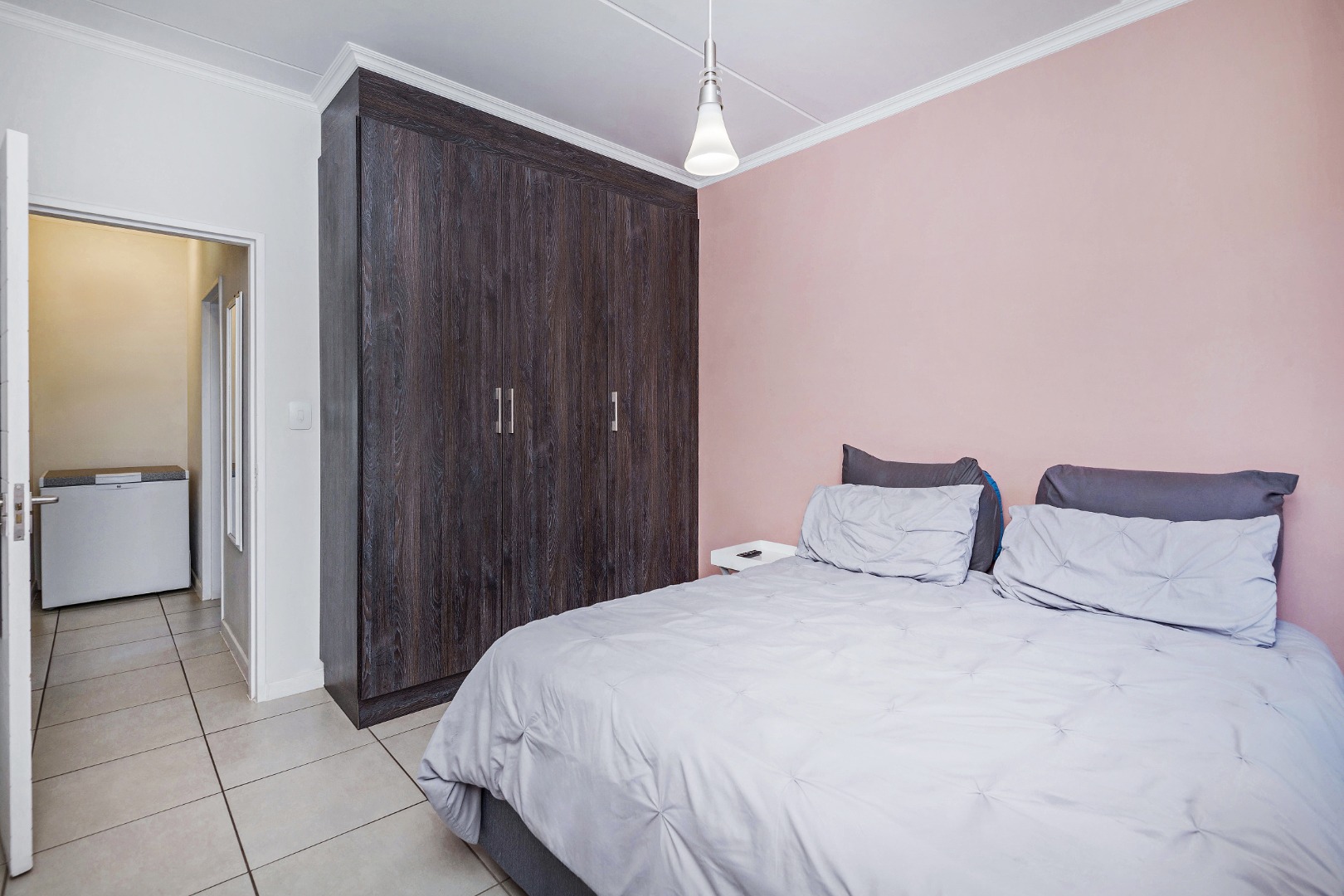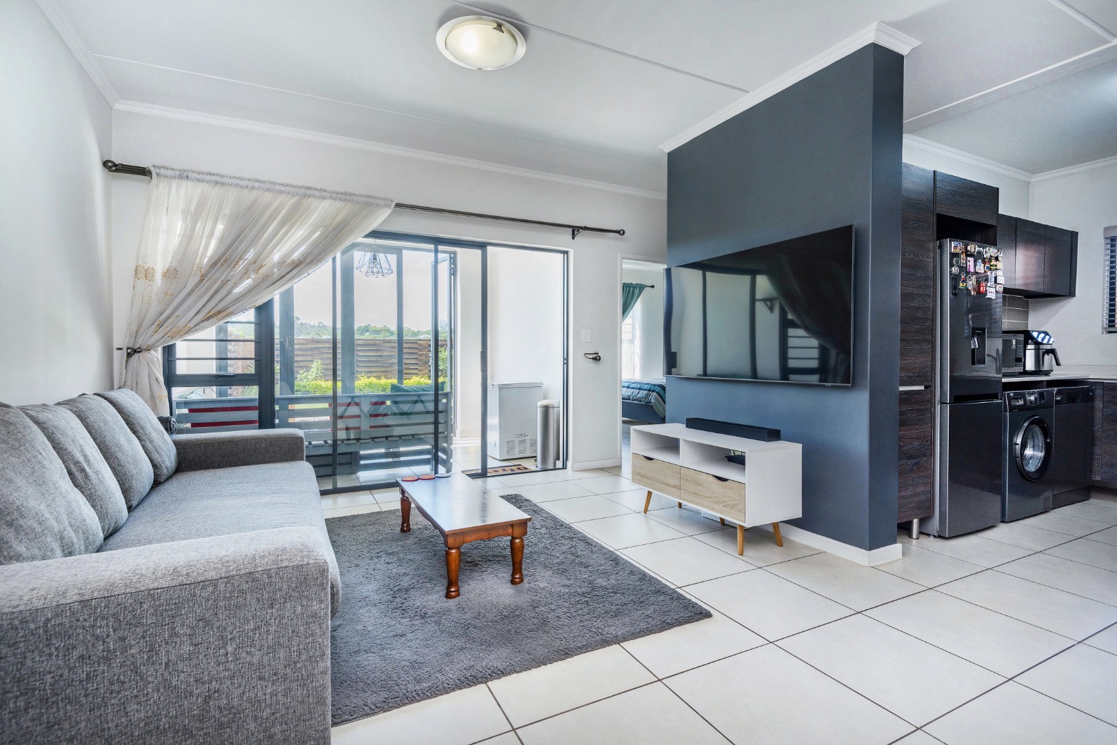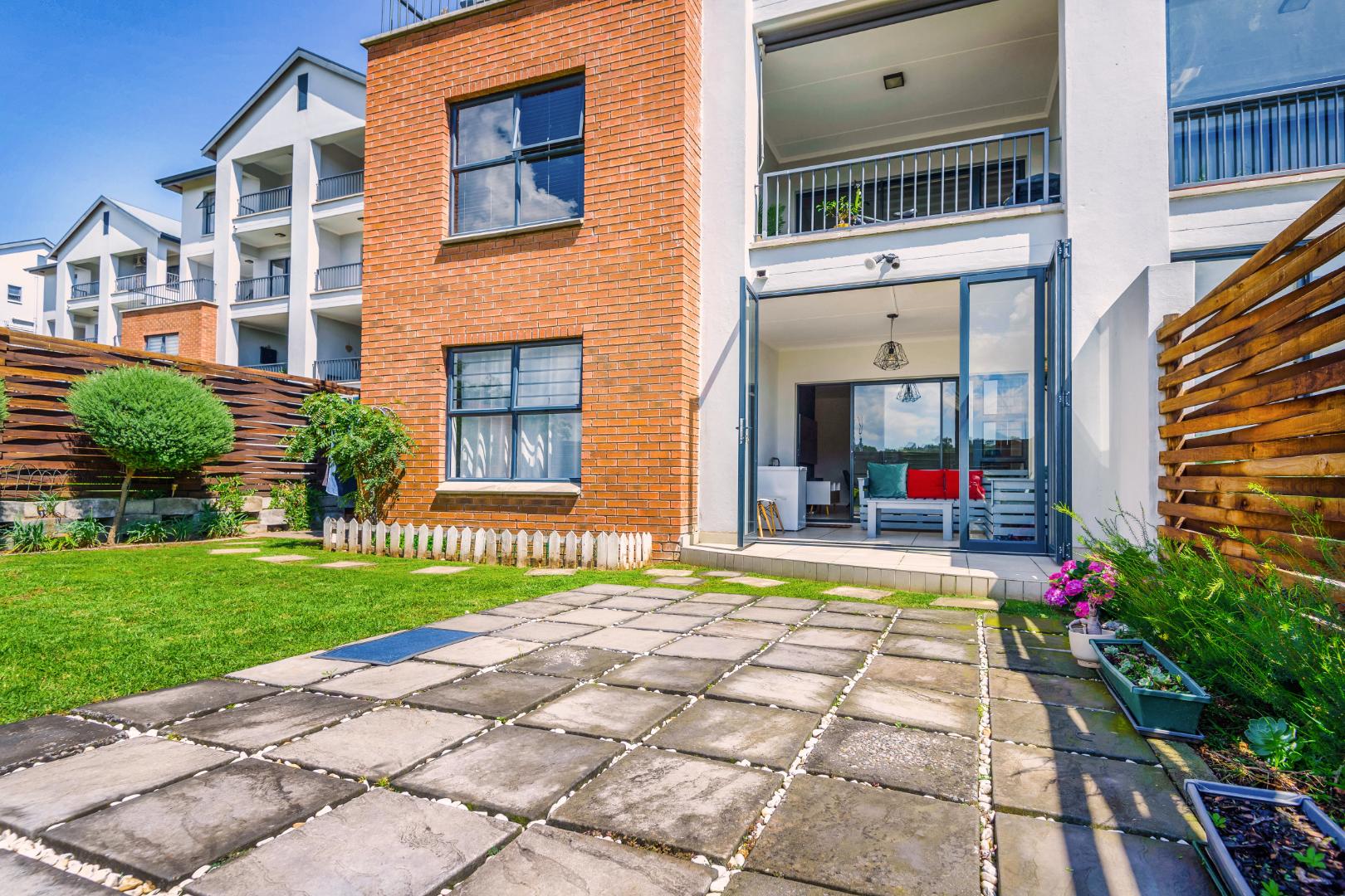 The living area opens through large sliding doors to a private patio and garden—perfect for entertaining, relaxing, or creating a safe outdoor play space for children or pets.