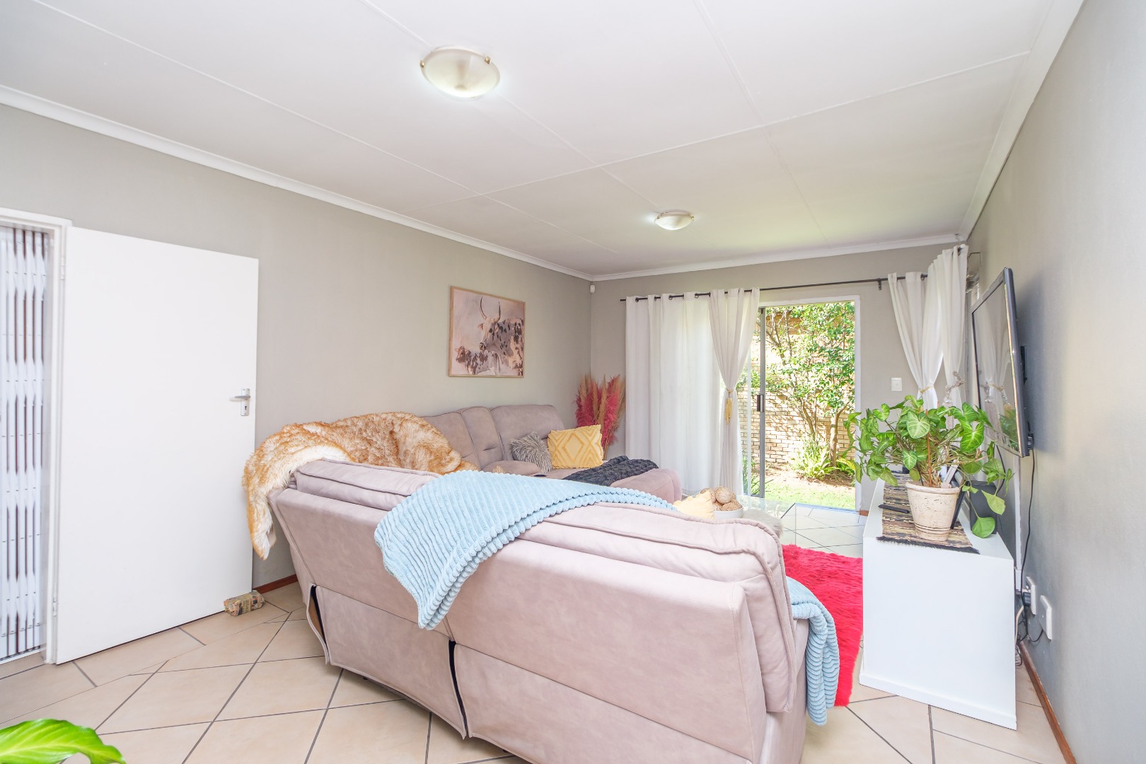The living area opens out to a spacious garden, ideal for relaxing, entertaining, and enjoying outdoor living.