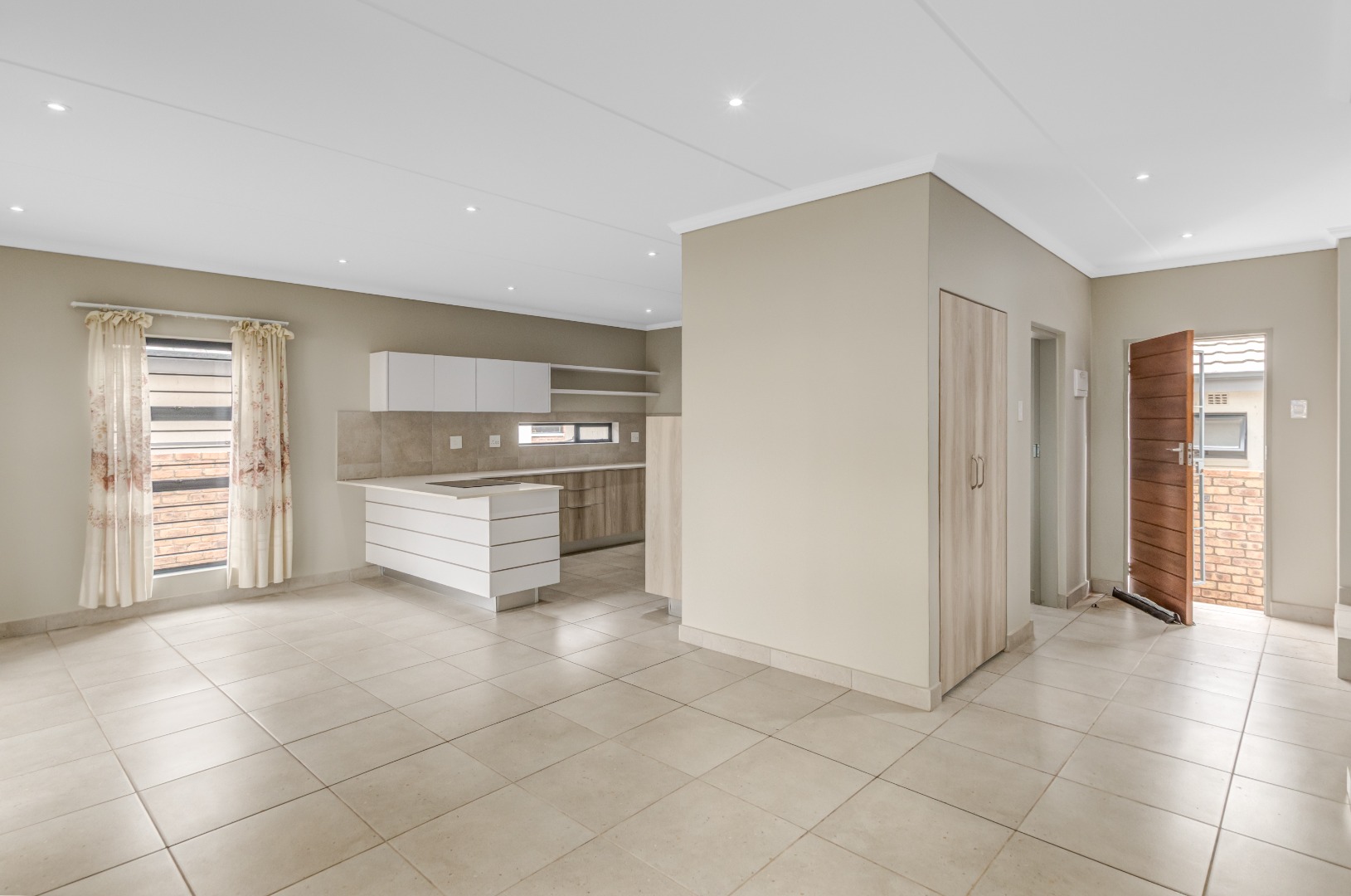 Step inside to an inviting open-plan living area, featuring neutral-toned walls, elegant tiled flooring, and modern recessed lighting. The heart of the home is a sleek kitchen, complete with an island, integrated hob and oven, light-toned cabinetry, and ample counter space, including a convenient pantry. Open plan dining room and a comfortable lounge provide versatile spaces for relaxation and entertaining. The property also includes a guest toilet and a dedicated laundry area for added convenience.