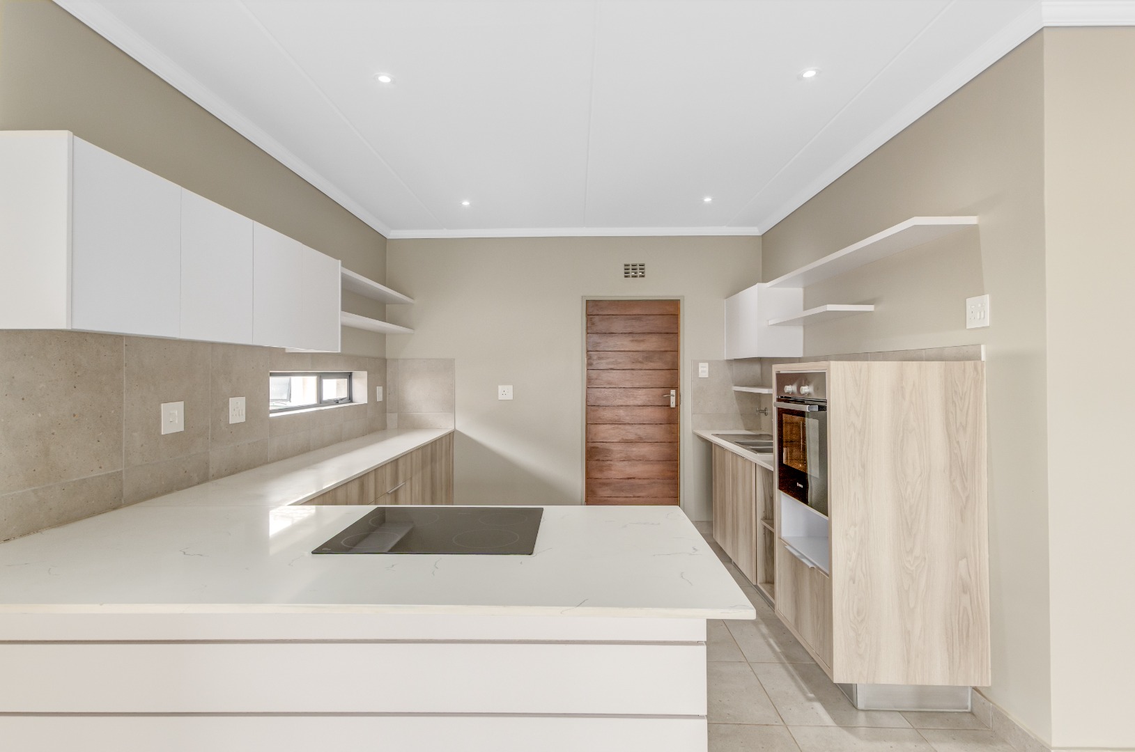 Step inside to an inviting open-plan living area, featuring neutral-toned walls, elegant tiled flooring, and modern recessed lighting. The heart of the home is a sleek kitchen, complete with an island, integrated hob and oven, light-toned cabinetry, and ample counter space, including a convenient pantry. Open plan dining room and a comfortable lounge provide versatile spaces for relaxation and entertaining. The property also includes a guest toilet and a dedicated laundry area for added convenience.