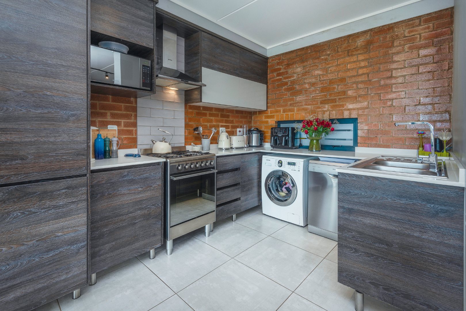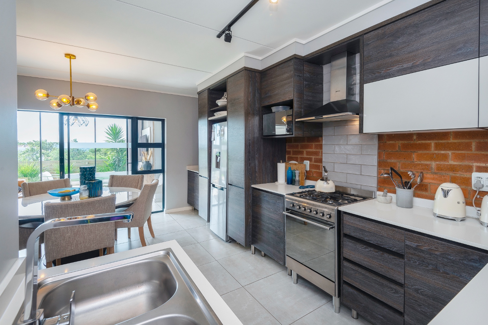A modern gourmet kitchen with high end finishes features a gas stove, soft-close cupboards, a Smeg stove, and more.
