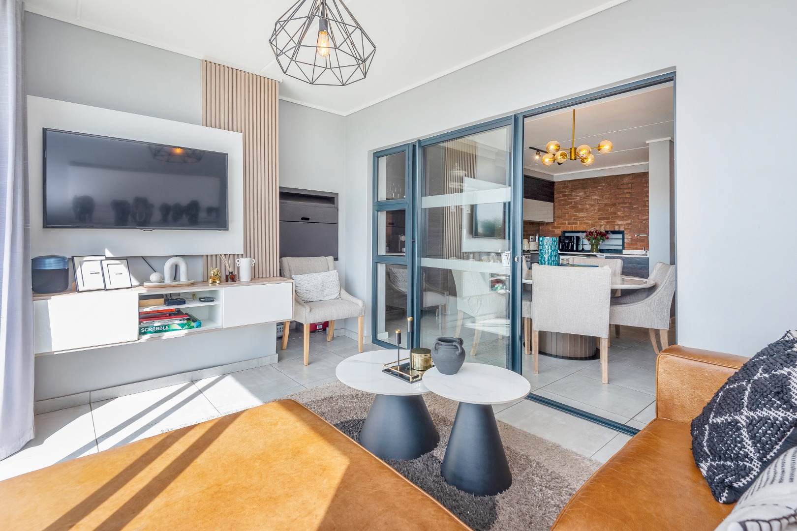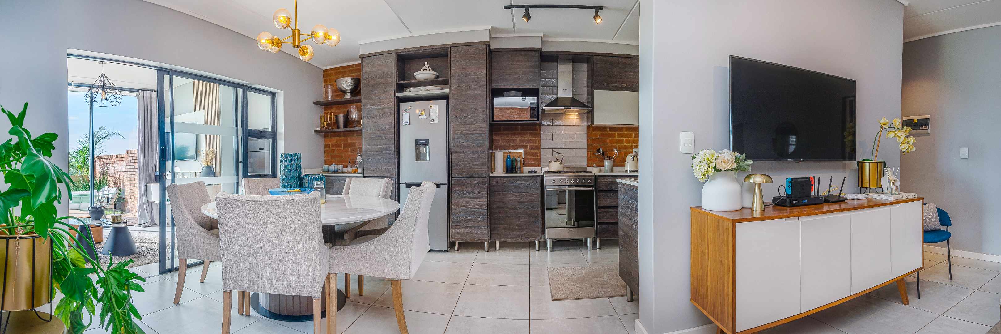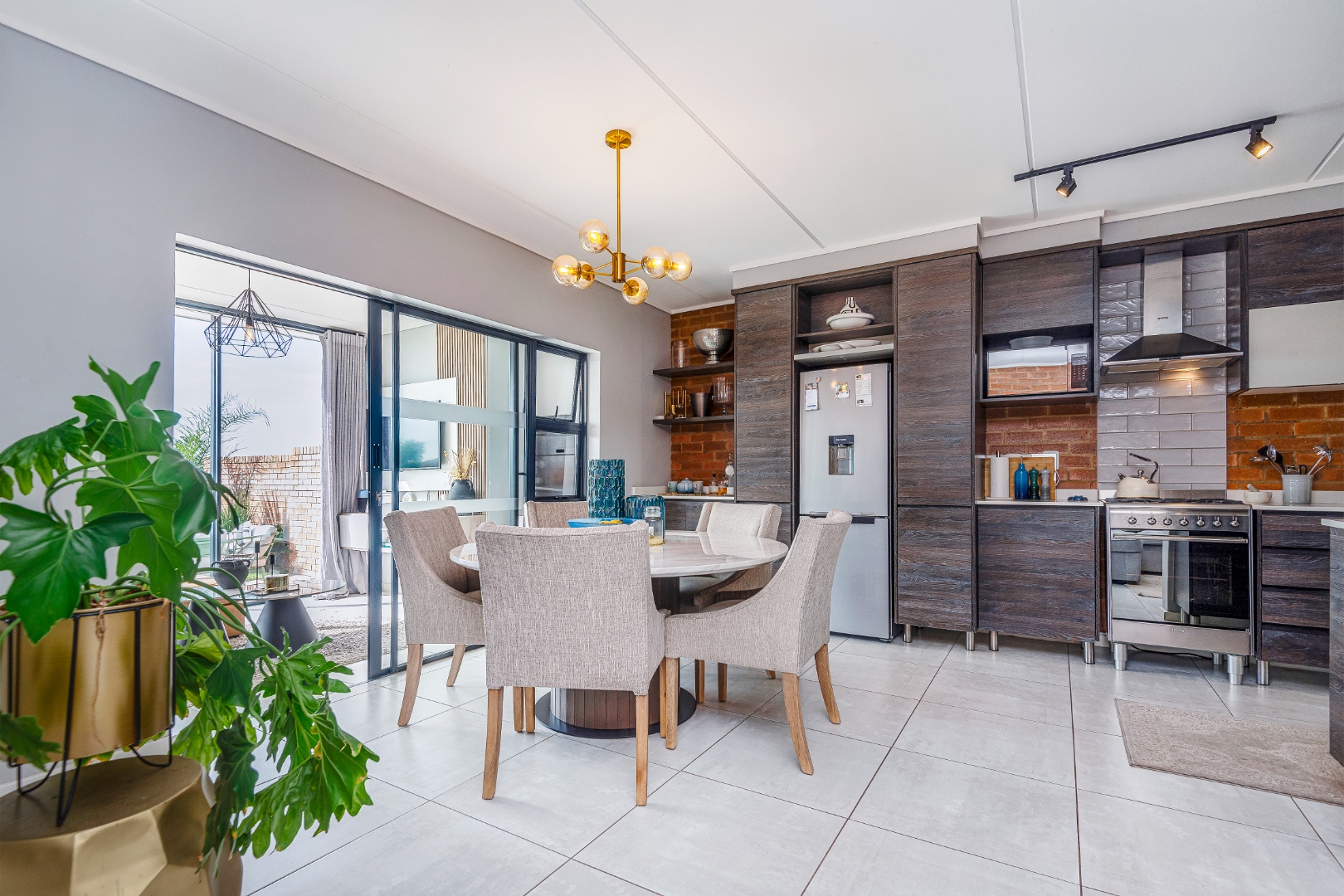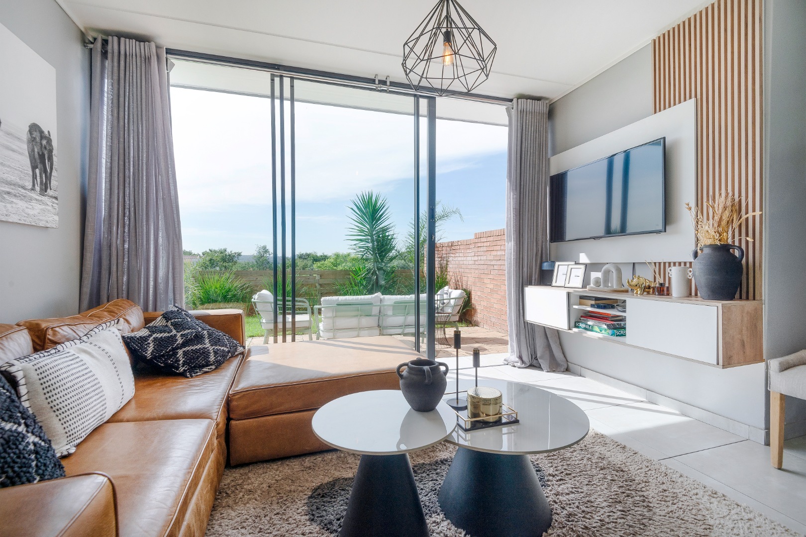 Natural light floods the interiors, seamlessly blending indoor and outdoor living spaces including the lounge, dining area, and enclosed patio with a braai to create a tranquil and sophisticated retreat.