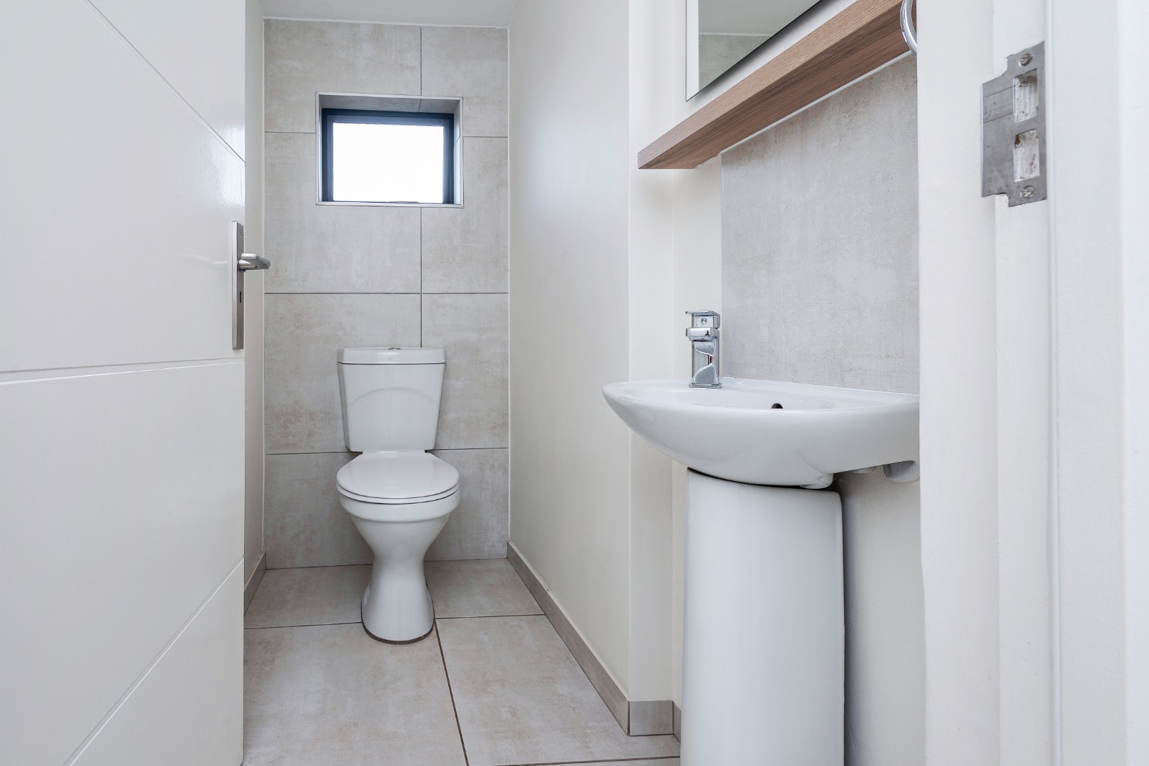 The home's interior is further enhanced by light-colored tiled flooring throughout and a striking open-riser staircase with an exposed brick accent wall, adding a touch of industrial chic. With four spacious bedrooms, including two en-suite bathrooms, comfort and privacy are assured for the entire family. A convenient guest toilet is also available.