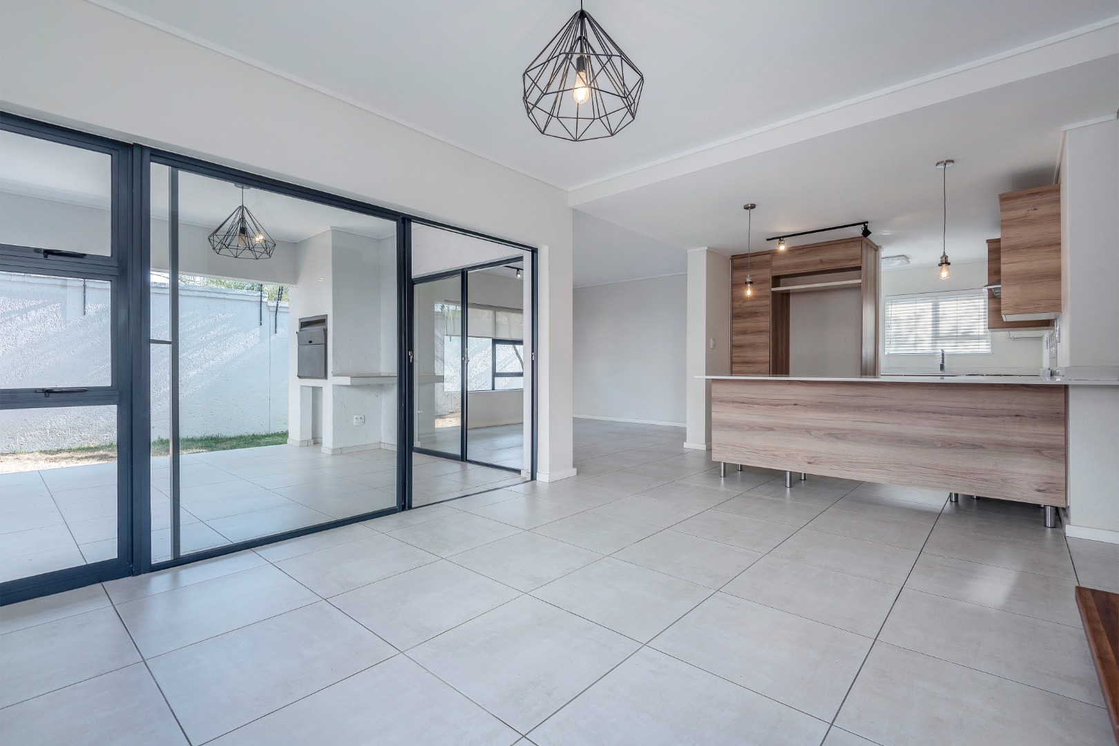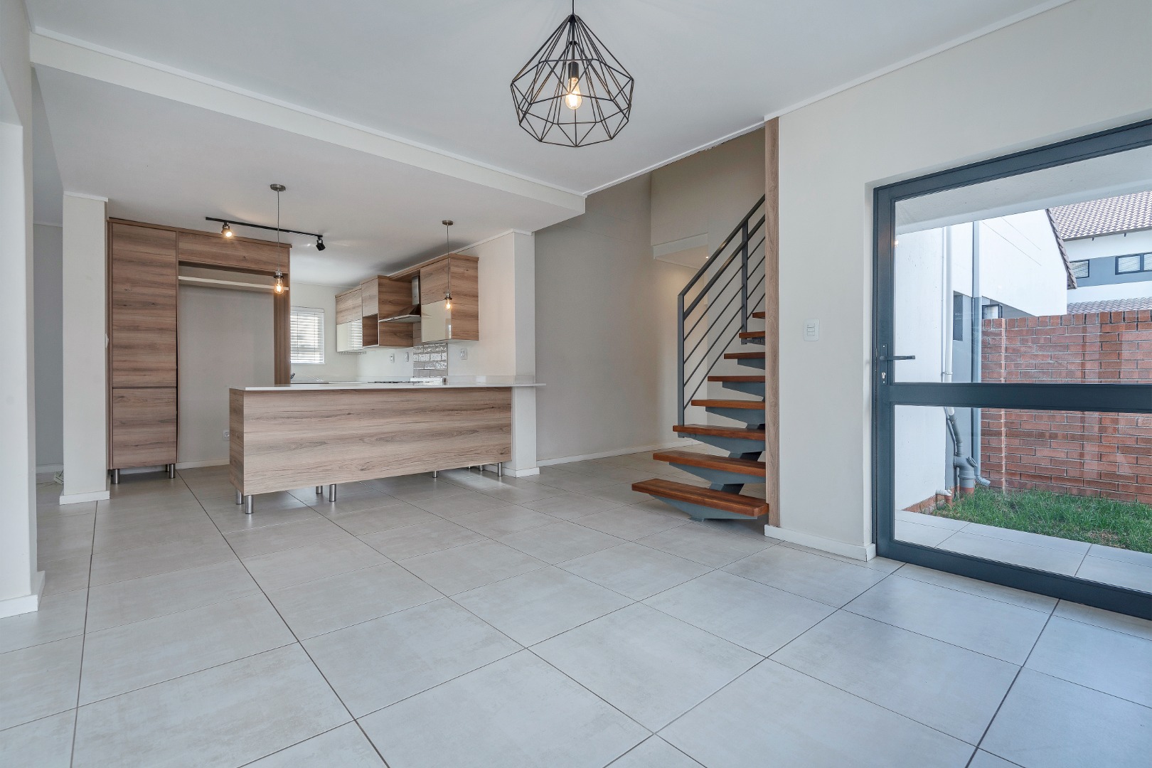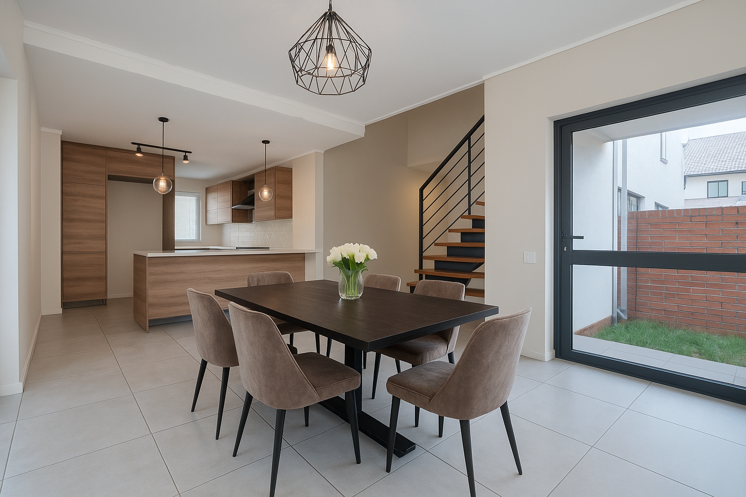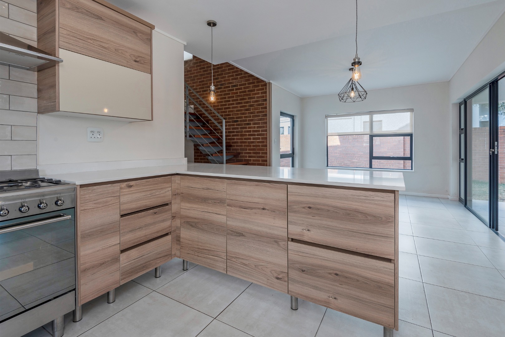 Discover modern living in this contemporary 4-bedroom, 3.5-bathroom home located within a secure eco-estate in Sharonlea, Randburg. Spanning 236 sqm, this residence boasts a sleek, open-plan design, seamlessly connecting the living, dining, and kitchen areas. The stylish kitchen is a highlight, featuring elegant wood-grain cabinetry, pristine white countertops, a central island, and a subway tile backsplash. It comes equipped with a stainless steel gas range and extractor fan, plus a dedicated space for a refrigerator, making it perfect for culinary enthusiasts.