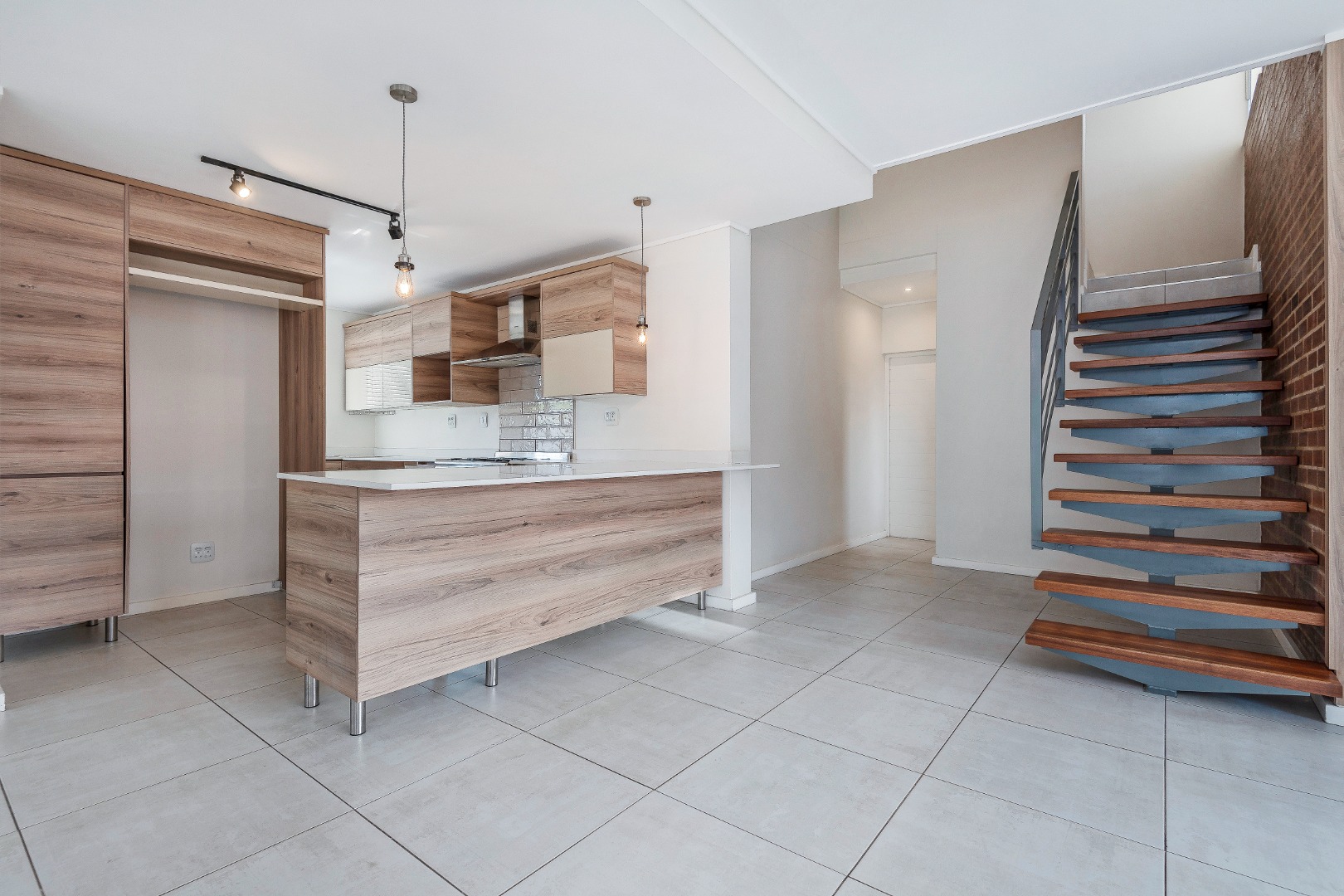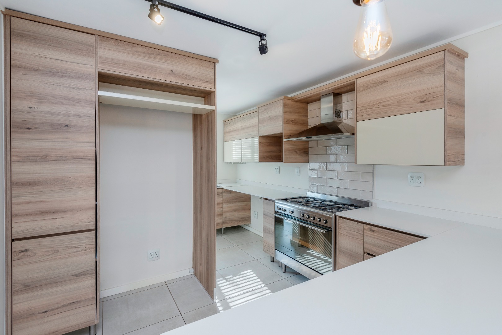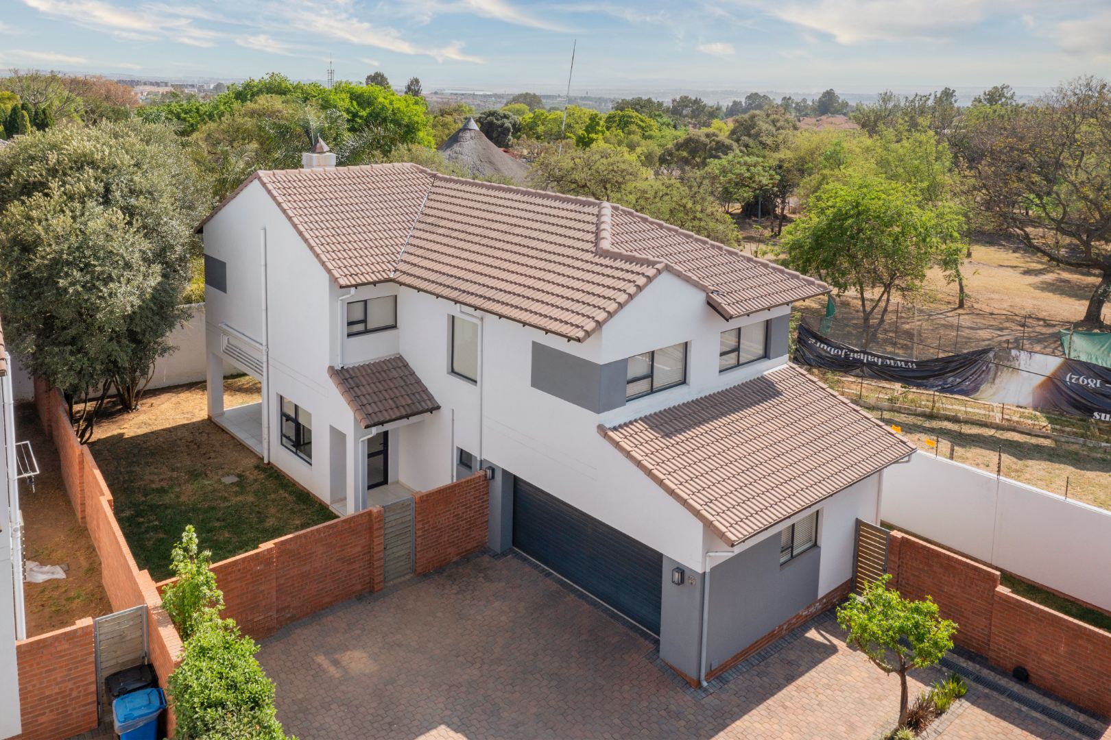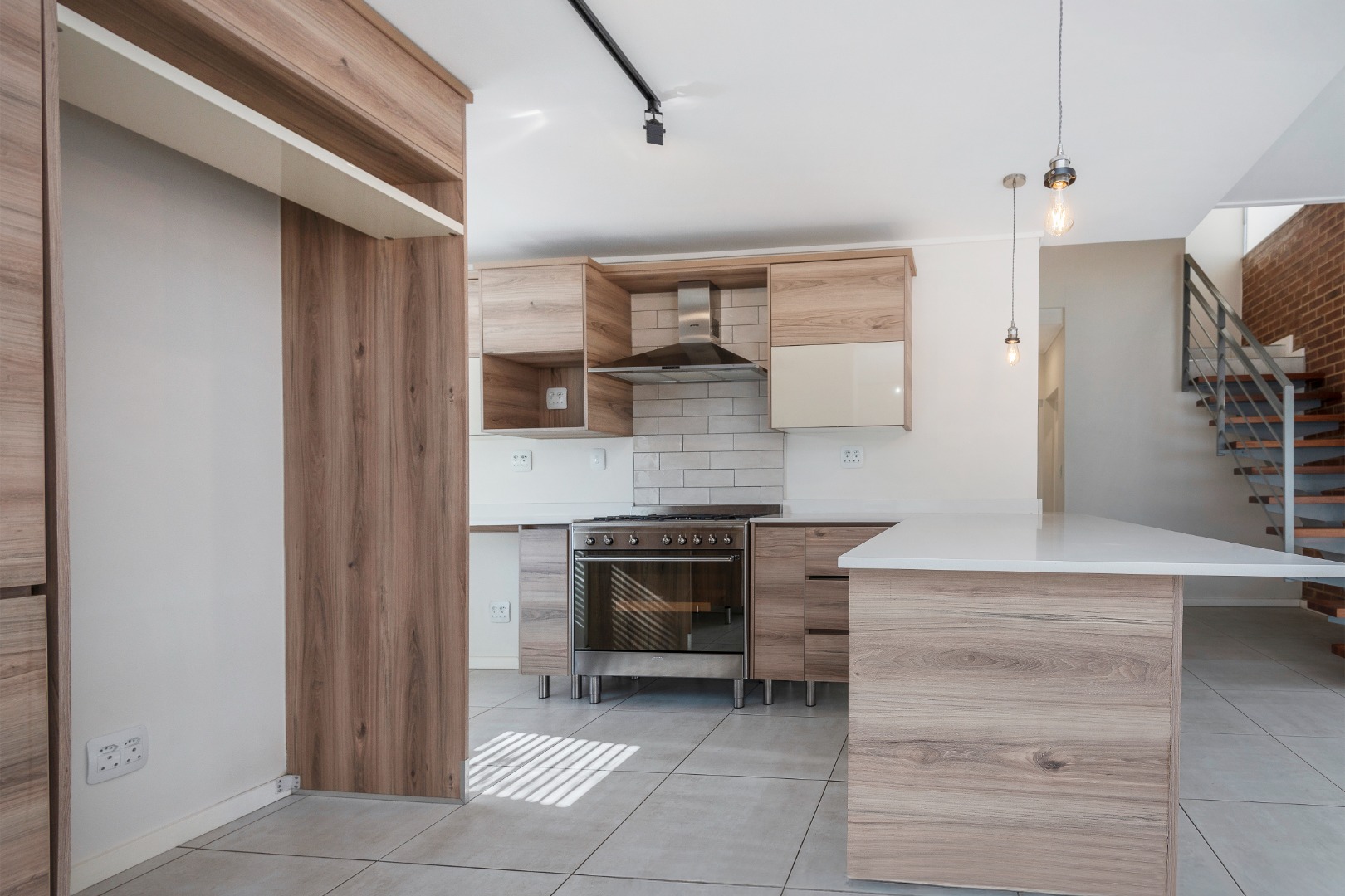 Discover modern living in this contemporary 4-bedroom, 3.5-bathroom home located within a secure eco-estate in Sharonlea, Randburg. Spanning 236 sqm, this residence boasts a sleek, open-plan design, seamlessly connecting the living, dining, and kitchen areas. The stylish kitchen is a highlight, featuring elegant wood-grain cabinetry, pristine white countertops, a central island, and a subway tile backsplash. It comes equipped with a stainless steel gas range and extractor fan, plus a dedicated space for a refrigerator, making it perfect for culinary enthusiasts.