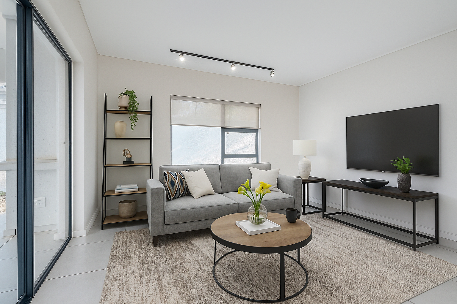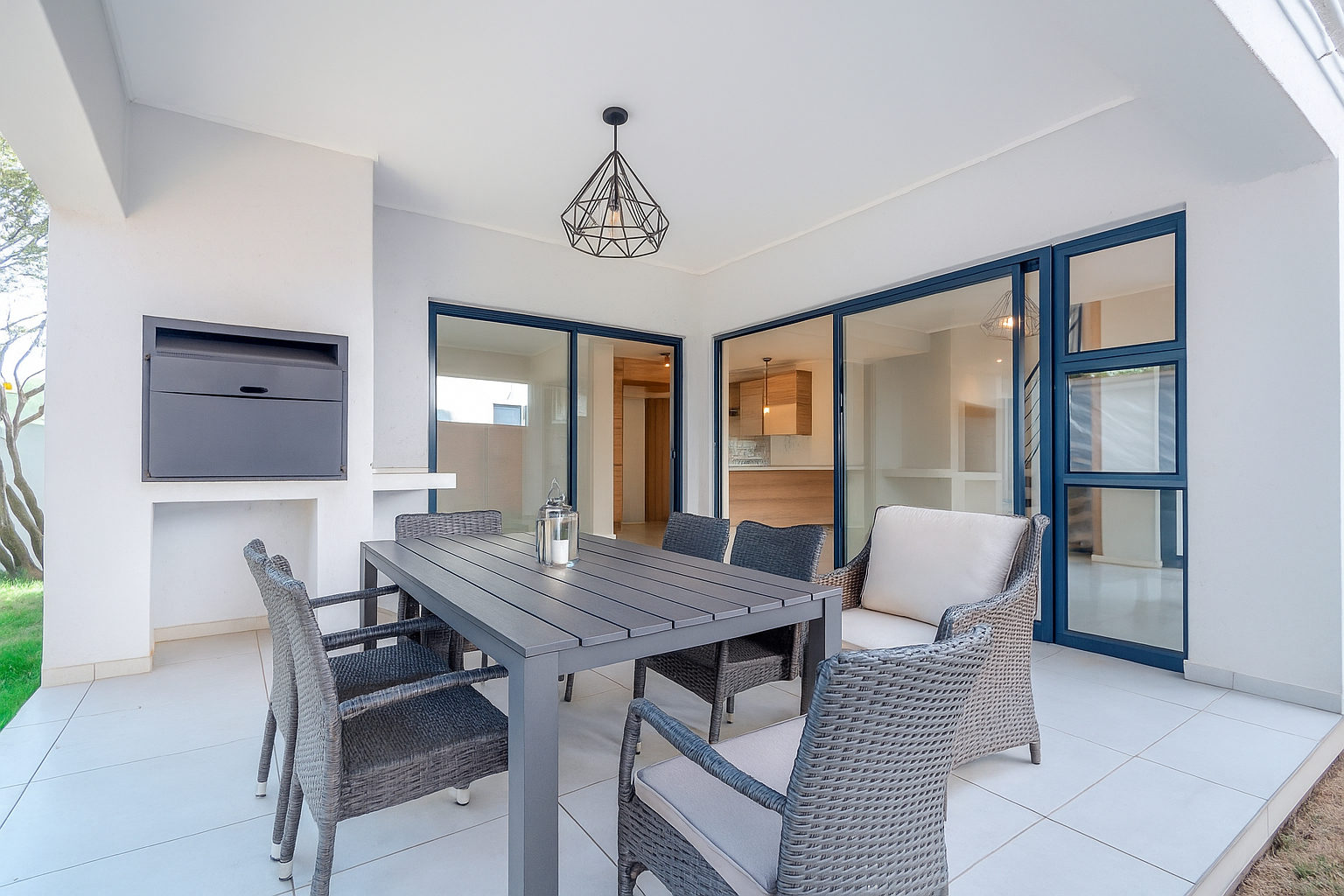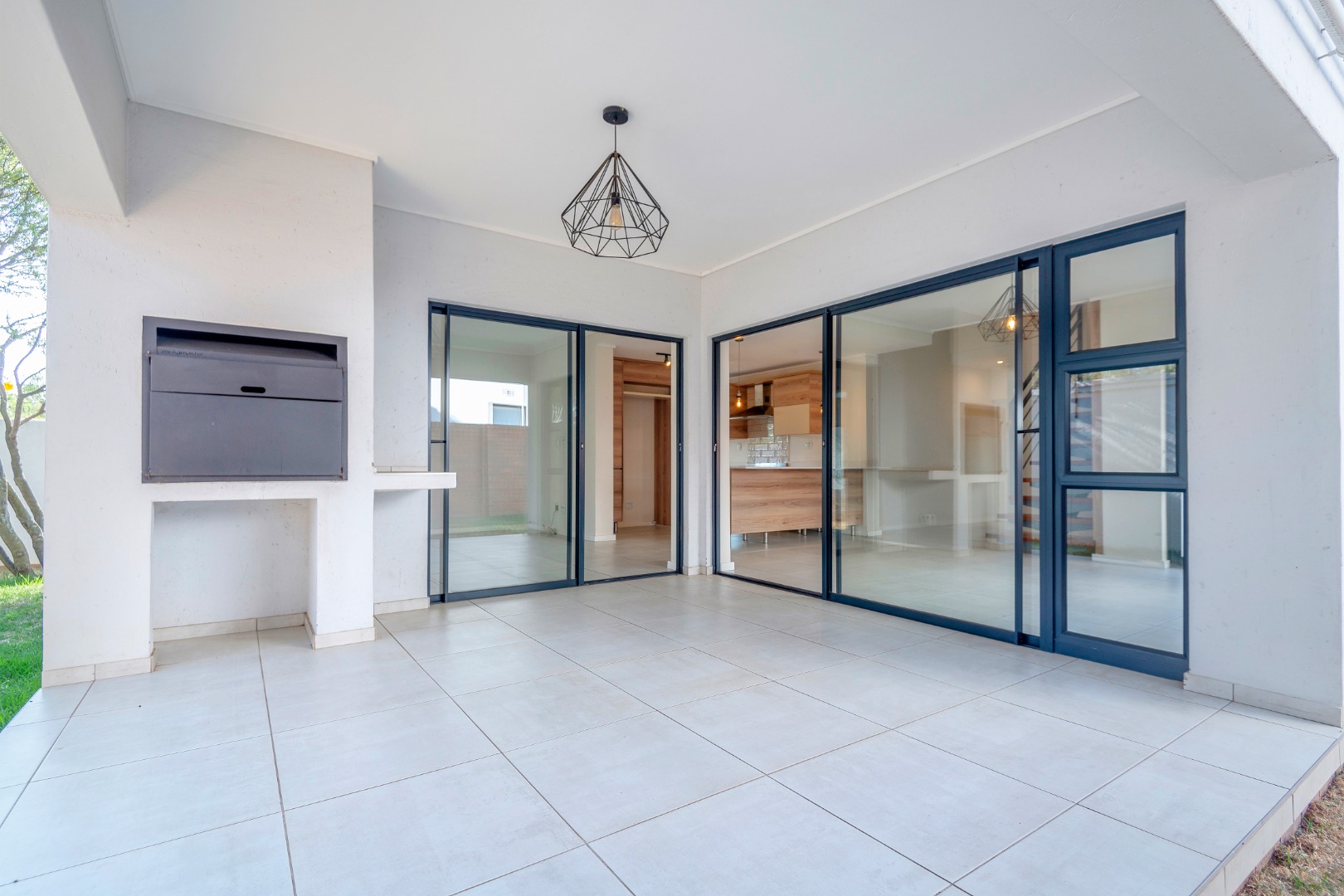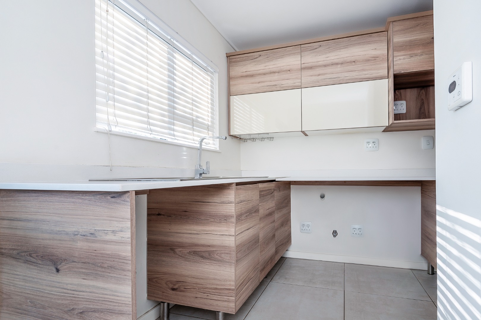 Discover modern living in this contemporary 4-bedroom, 3.5-bathroom home located within a secure eco-estate in Sharonlea, Randburg. Spanning 236 sqm, this residence boasts a sleek, open-plan design, seamlessly connecting the living, dining, and kitchen areas. The stylish kitchen is a highlight, featuring elegant wood-grain cabinetry, pristine white countertops, a central island, and a subway tile backsplash. It comes equipped with a stainless steel gas range and extractor fan, plus a dedicated space for a refrigerator, making it perfect for culinary enthusiasts.