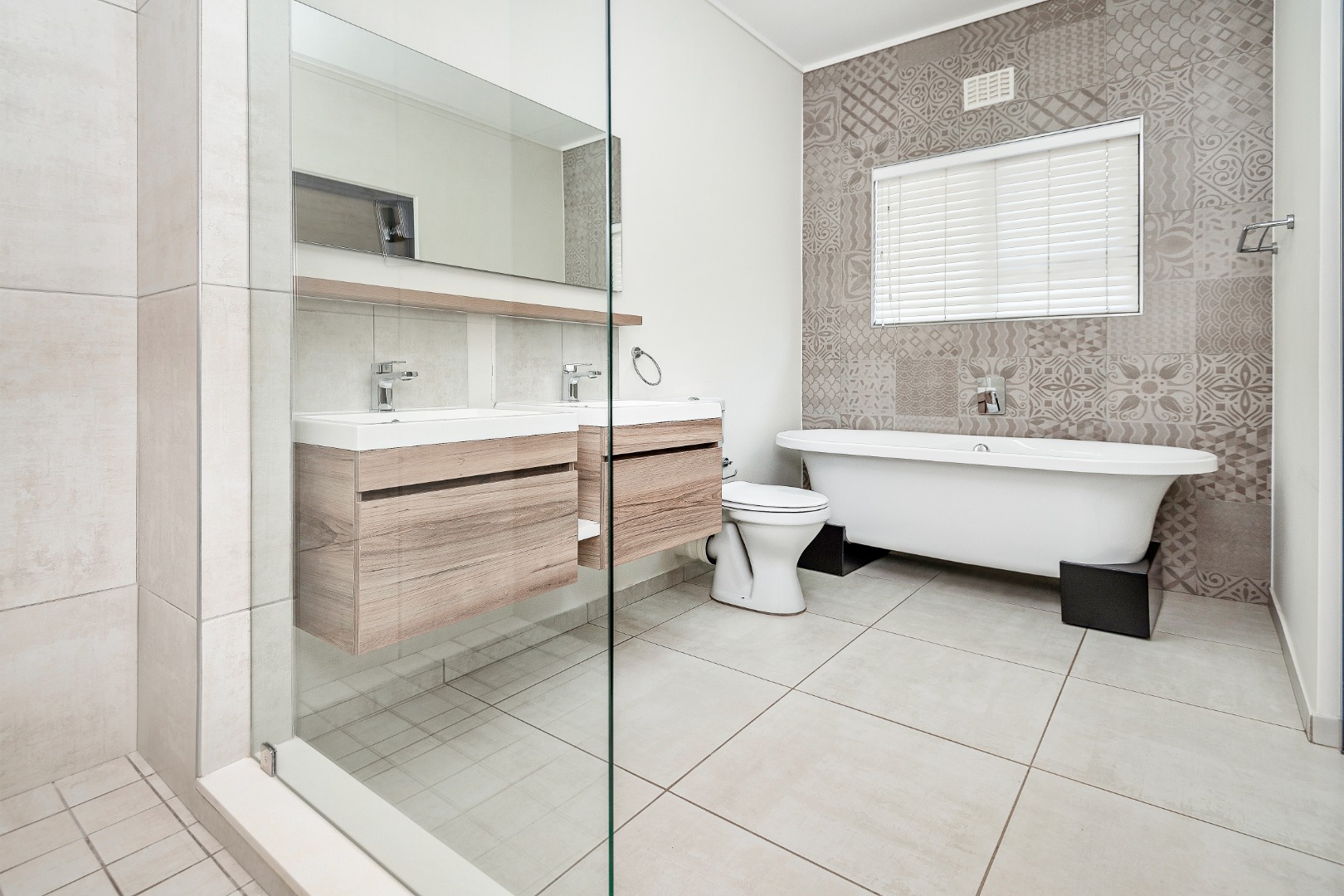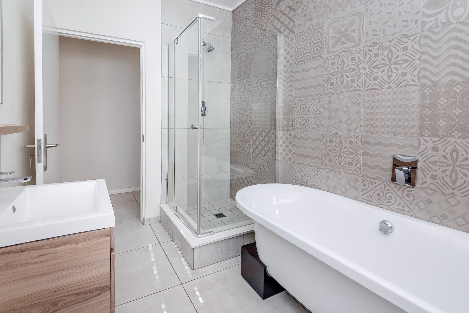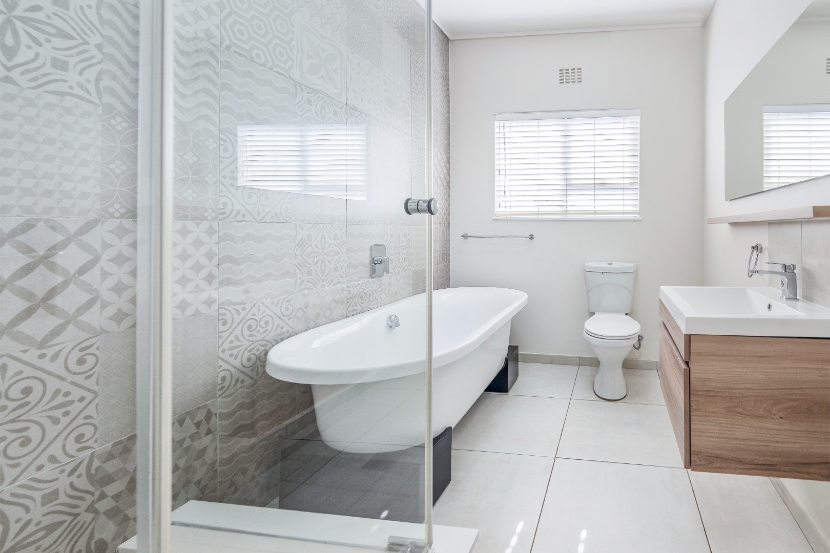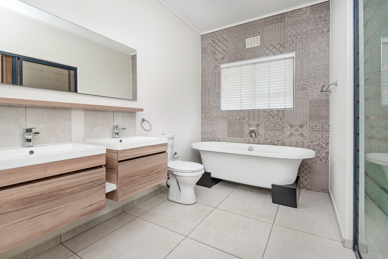Discover modern living in this contemporary 4-bedroom, 3.5-bathroom home located within a secure eco-estate in Sharonlea, Randburg. Spanning 236 sqm, this residence boasts a sleek, open-plan design, seamlessly connecting the living, dining, and kitchen areas. The stylish kitchen is a highlight, featuring elegant wood-grain cabinetry, pristine white countertops, a central island, and a subway tile backsplash. It comes equipped with a stainless steel gas range and extractor fan, plus a dedicated space for a refrigerator, making it perfect for culinary enthusiasts.