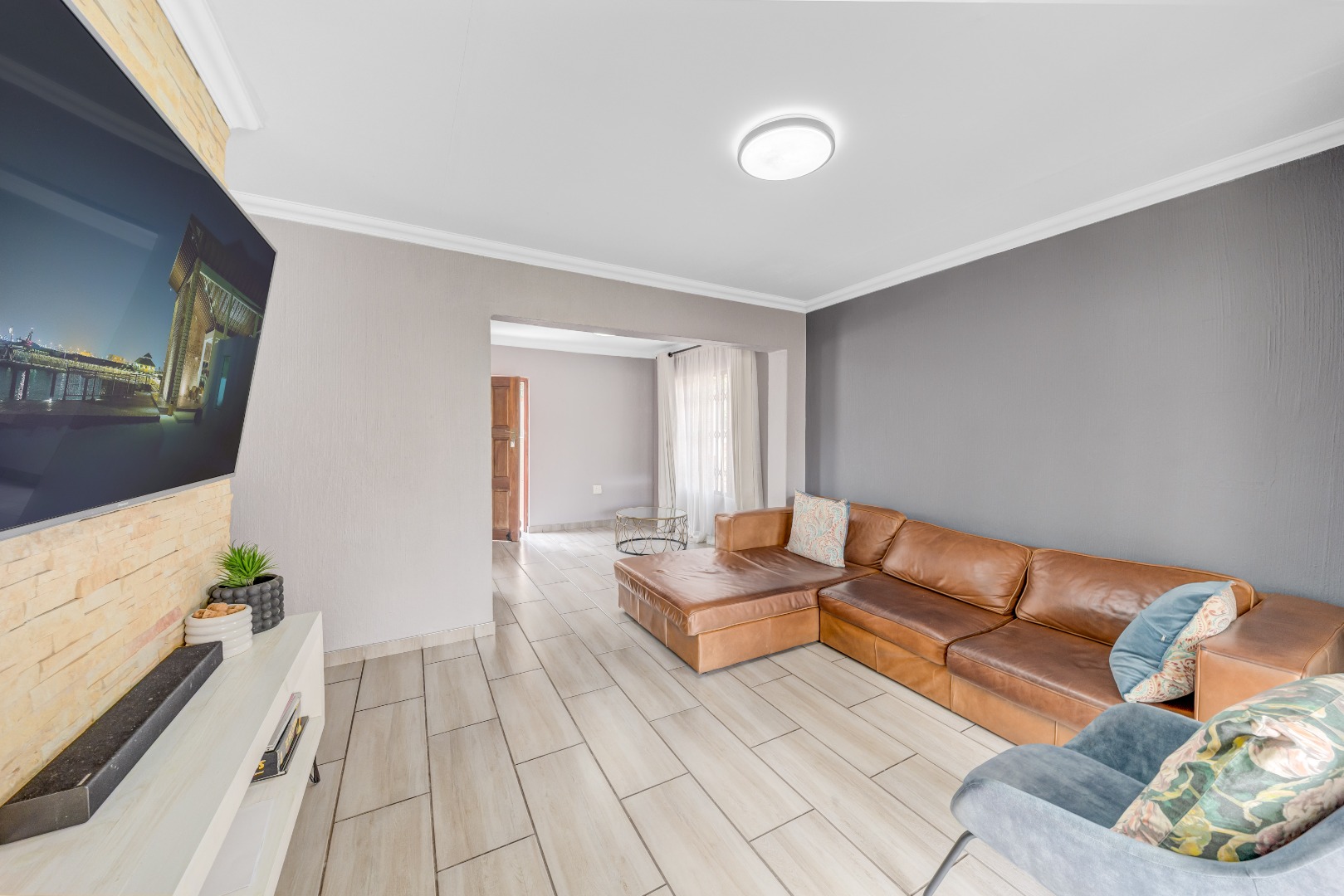 Spacious open-plan lounge and dining room with sliding doors opening onto a covered patio with built-in braai – ideal for weekend gatherings and sundowners