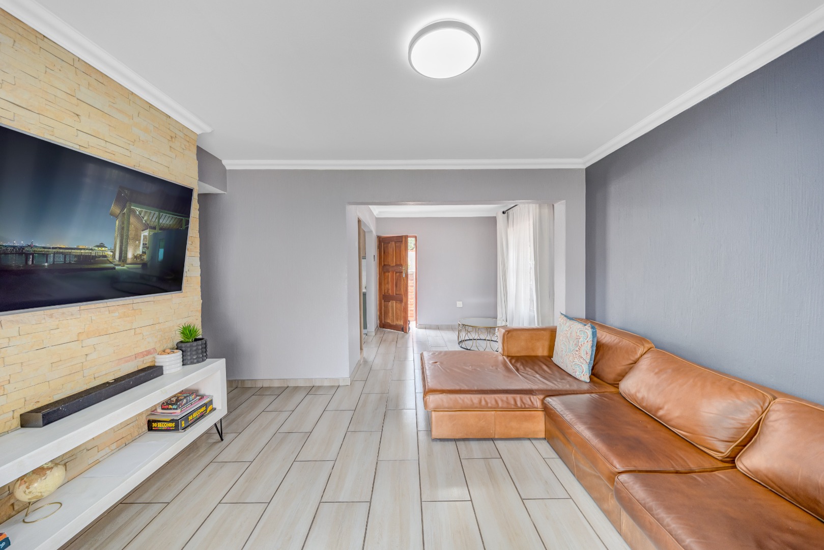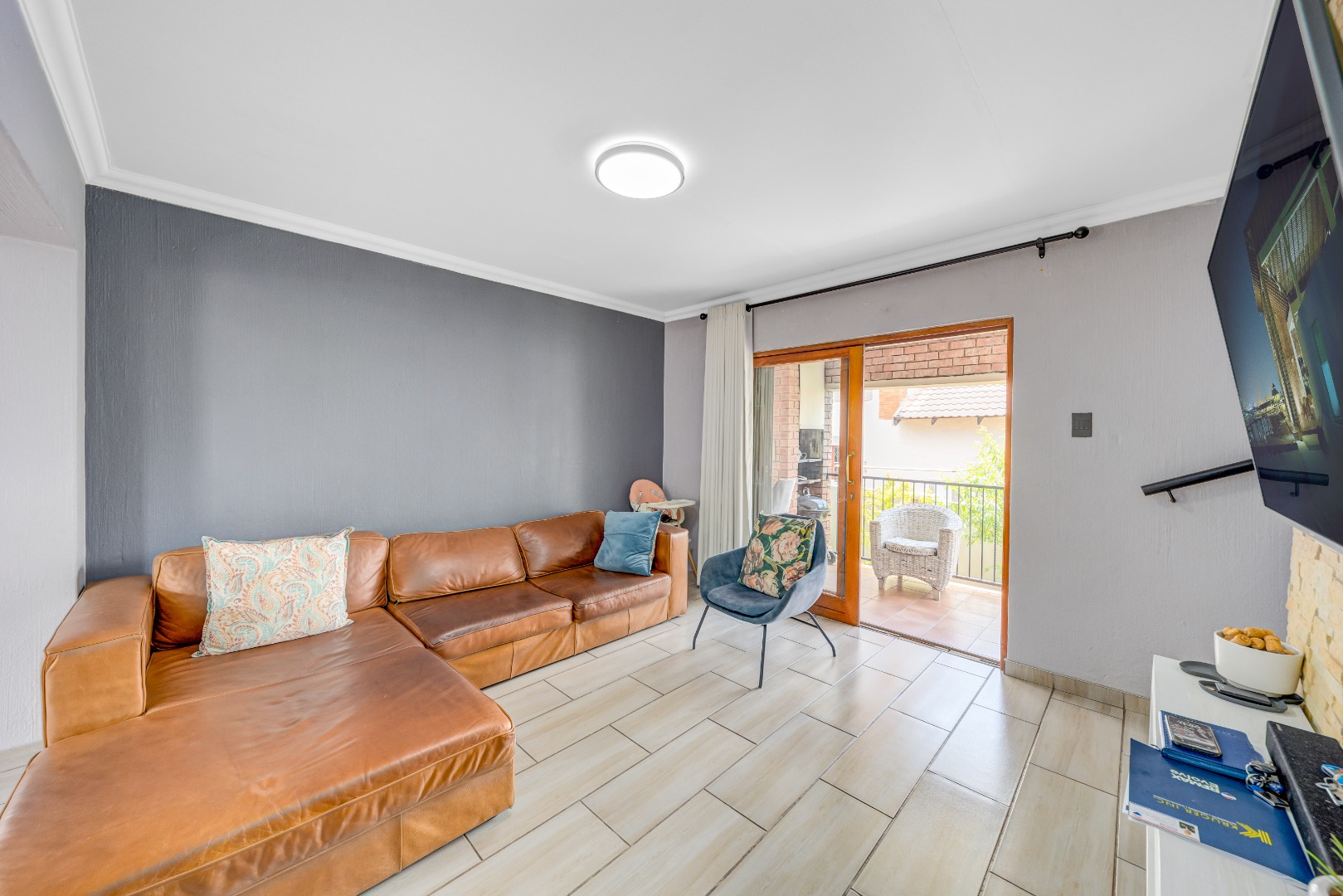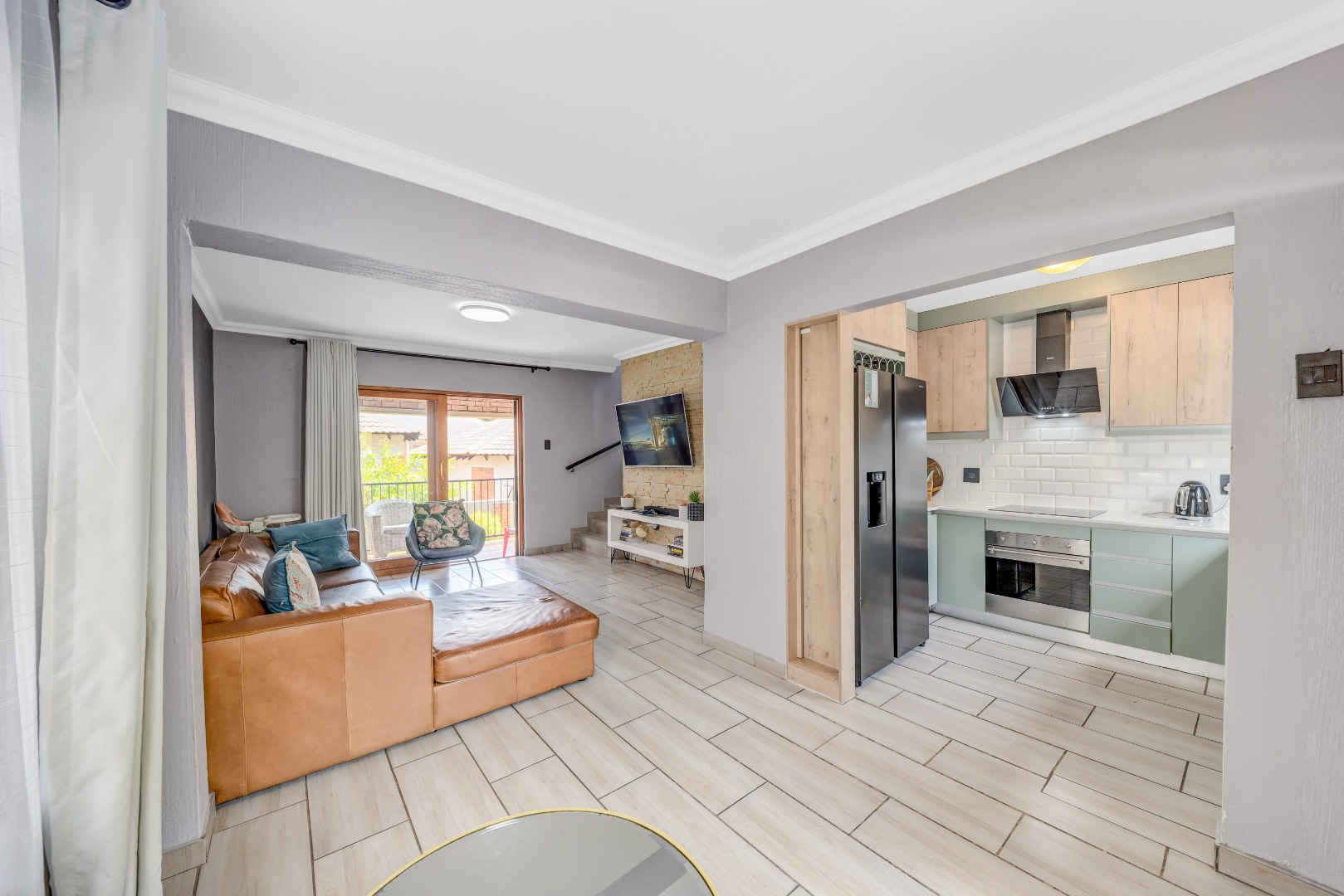 Spacious open-plan lounge and dining room with sliding doors opening onto a covered patio with built-in braai – ideal for weekend gatherings and sundowners