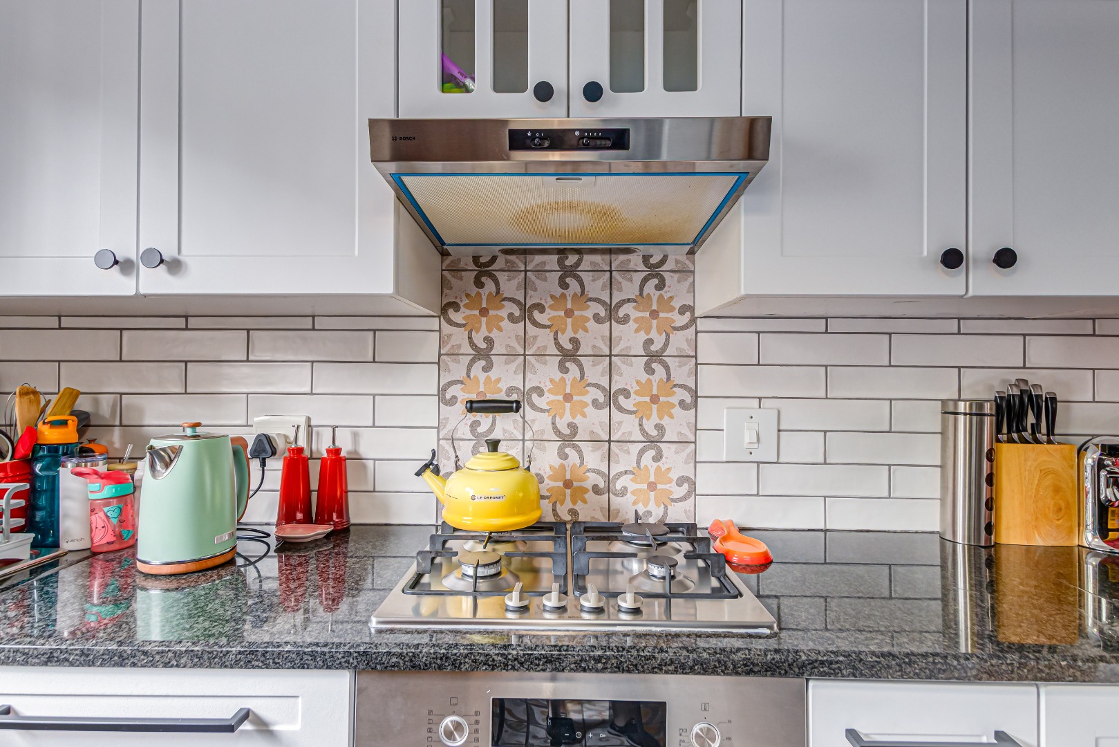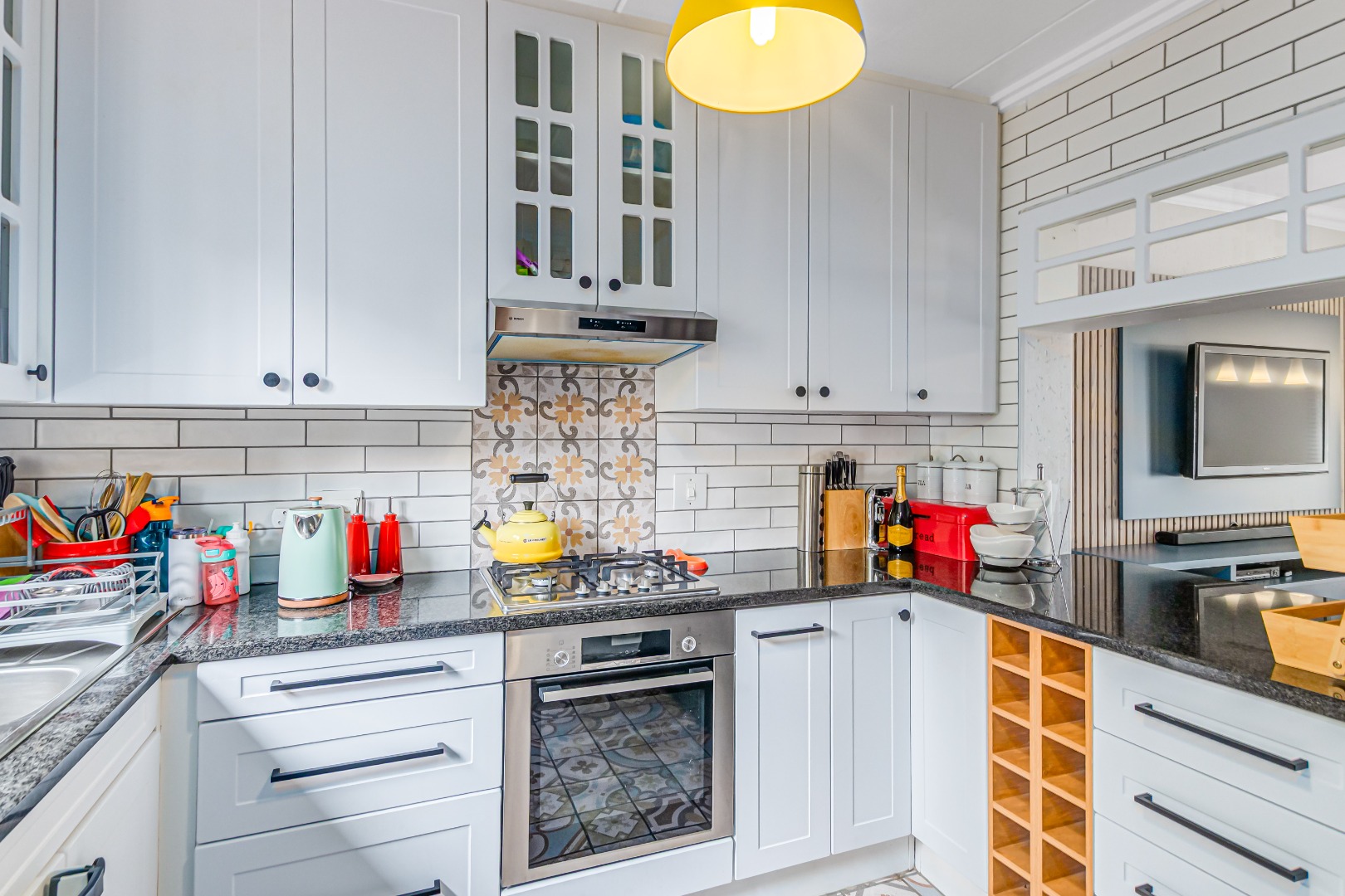 Step inside to discover a bright and spacious open-plan living area, seamlessly connecting to the dining space and a dedicated family TV room. The modern kitchen is a highlight, boasting white shaker-style cabinetry, dark granite countertops, and a stylish subway tile backsplash. It comes fully equipped with an integrated gas hob, electric oven, two additional appliances, and a convenient pass-through window/breakfast bar, all bathed in natural light.