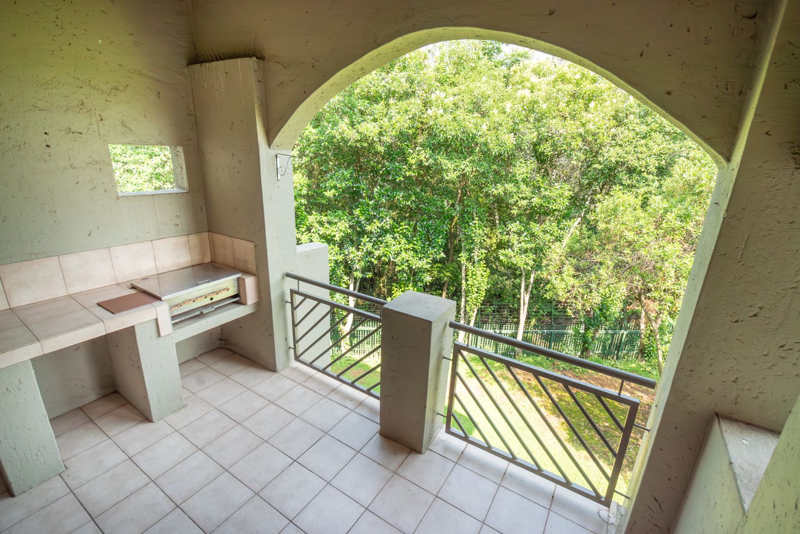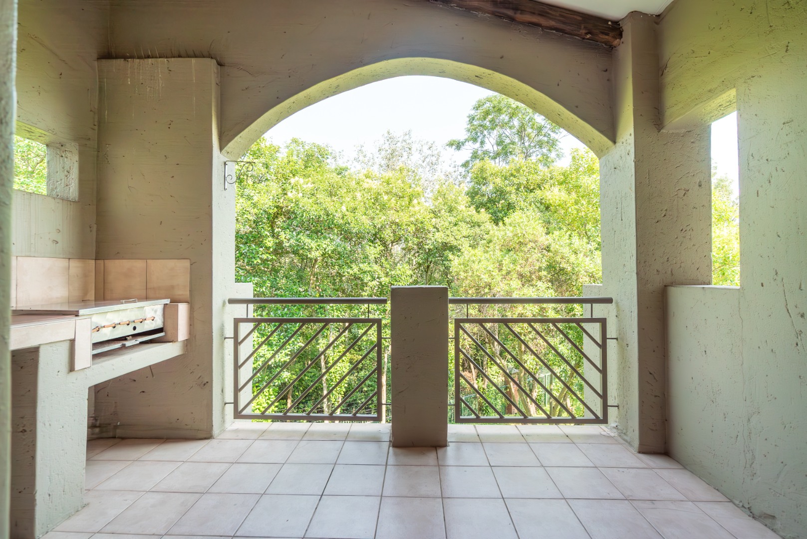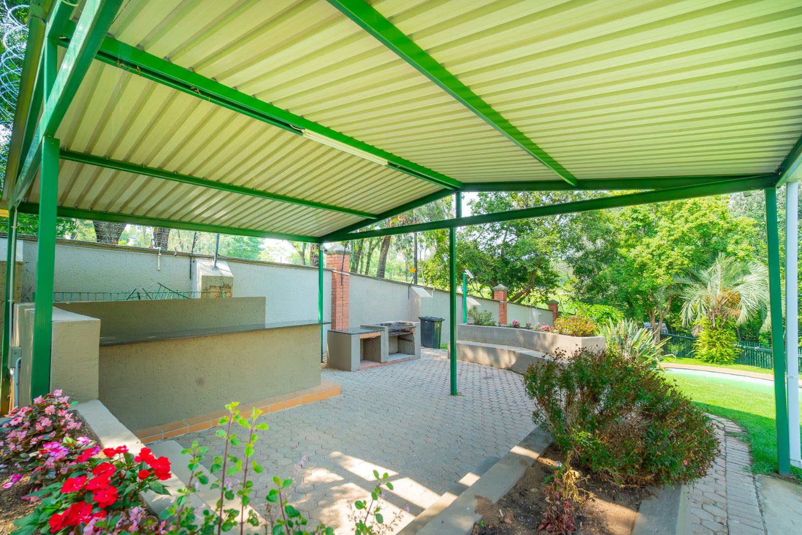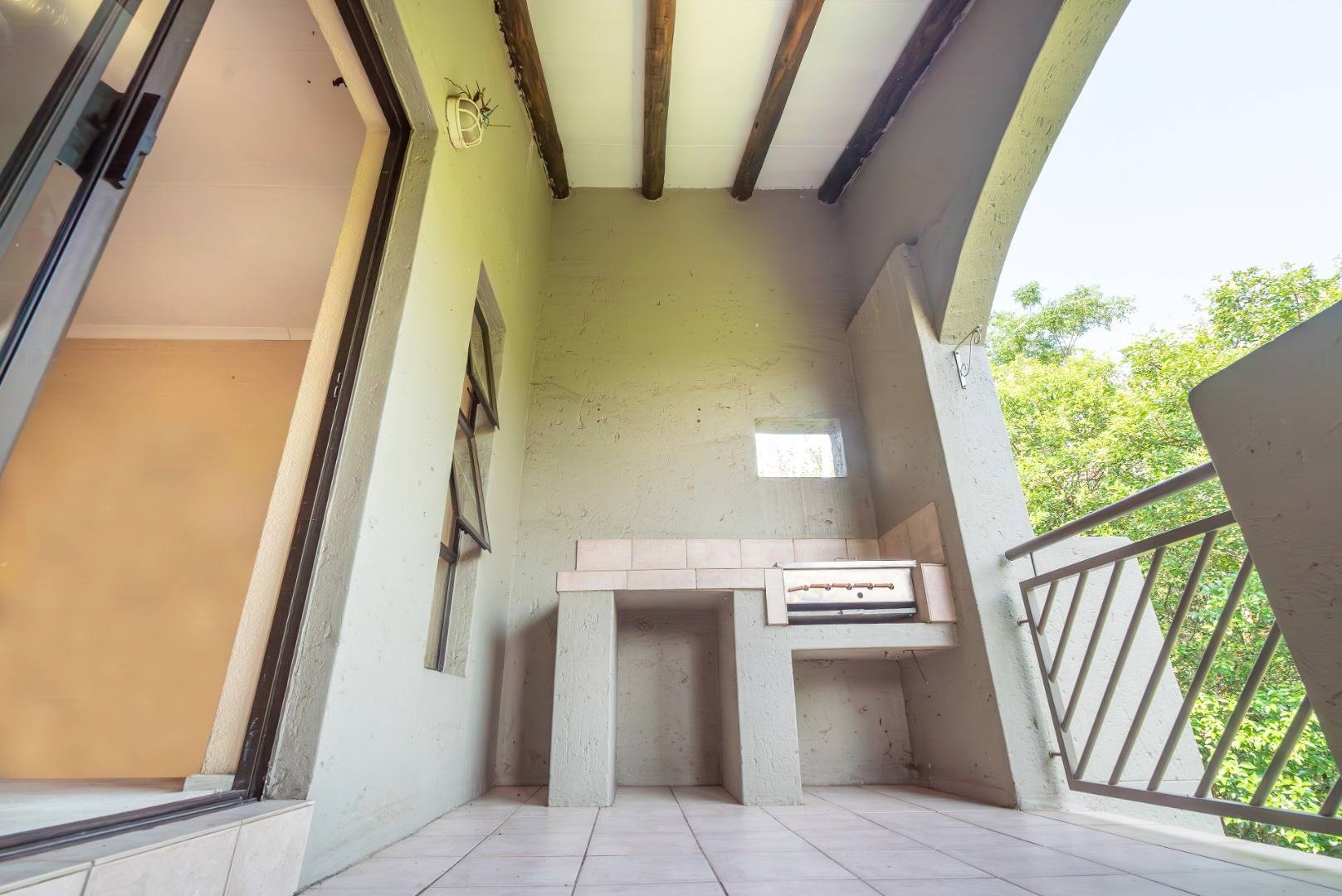 The open-plan living area flows onto a well-sized covered patio with a built-in gas braai. It’s a space that works easily into everyday life — morning coffee overlooking the trees, afternoons with the doors open, and relaxed evenings outdoors. The outlook is private and green, with established gardens and mature trees rather than neighbouring walls or parking areas.