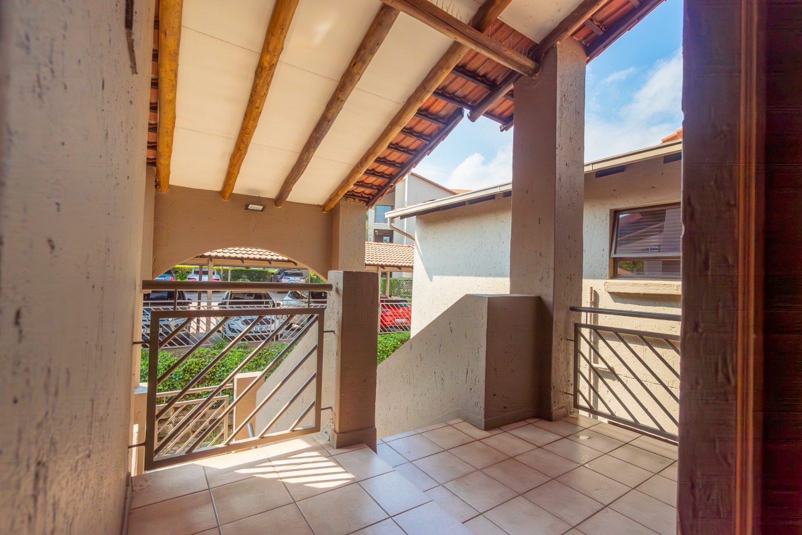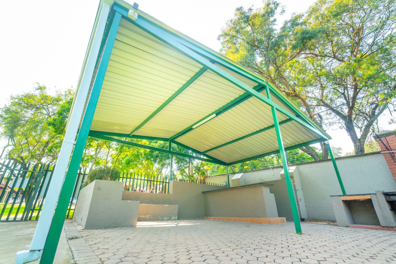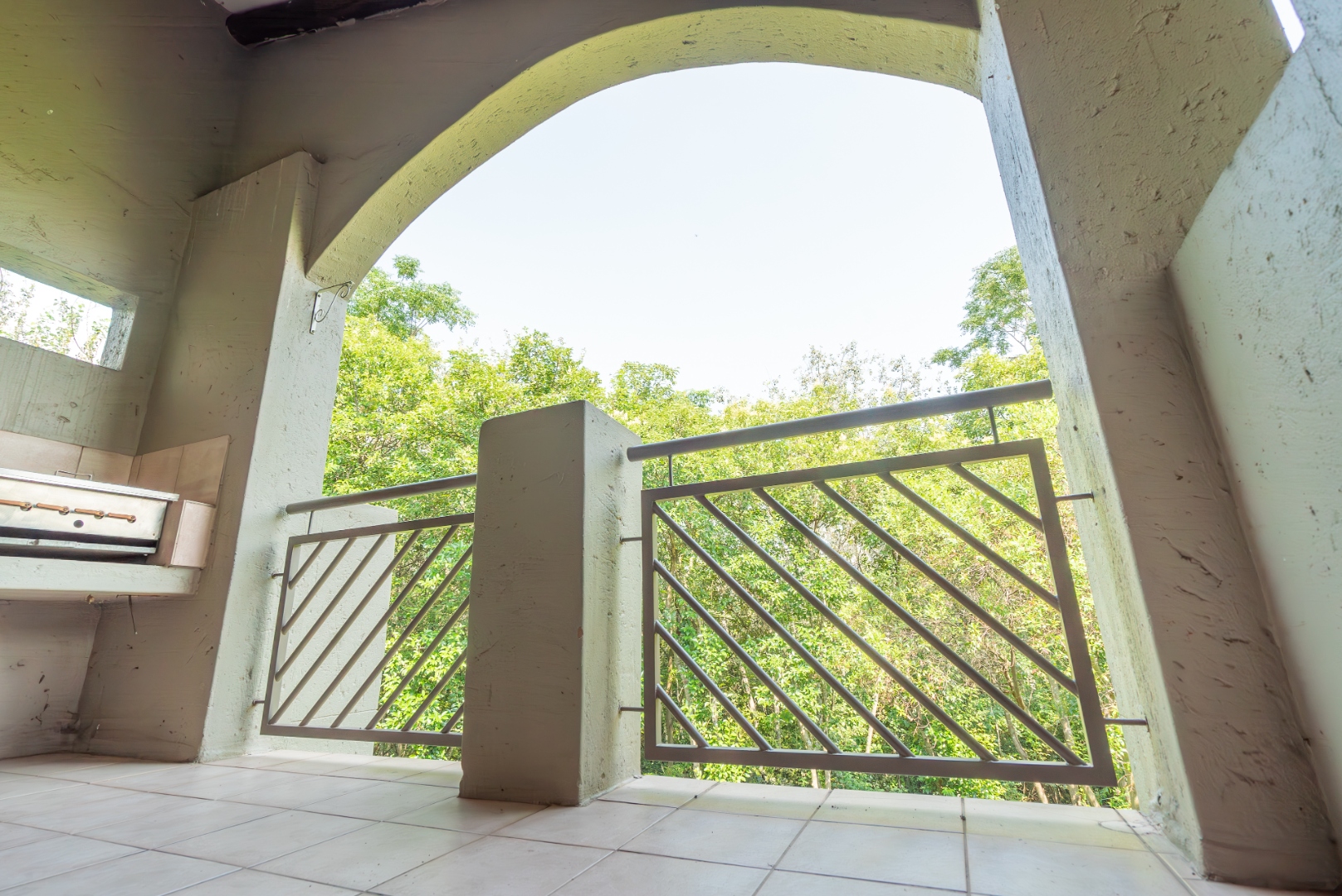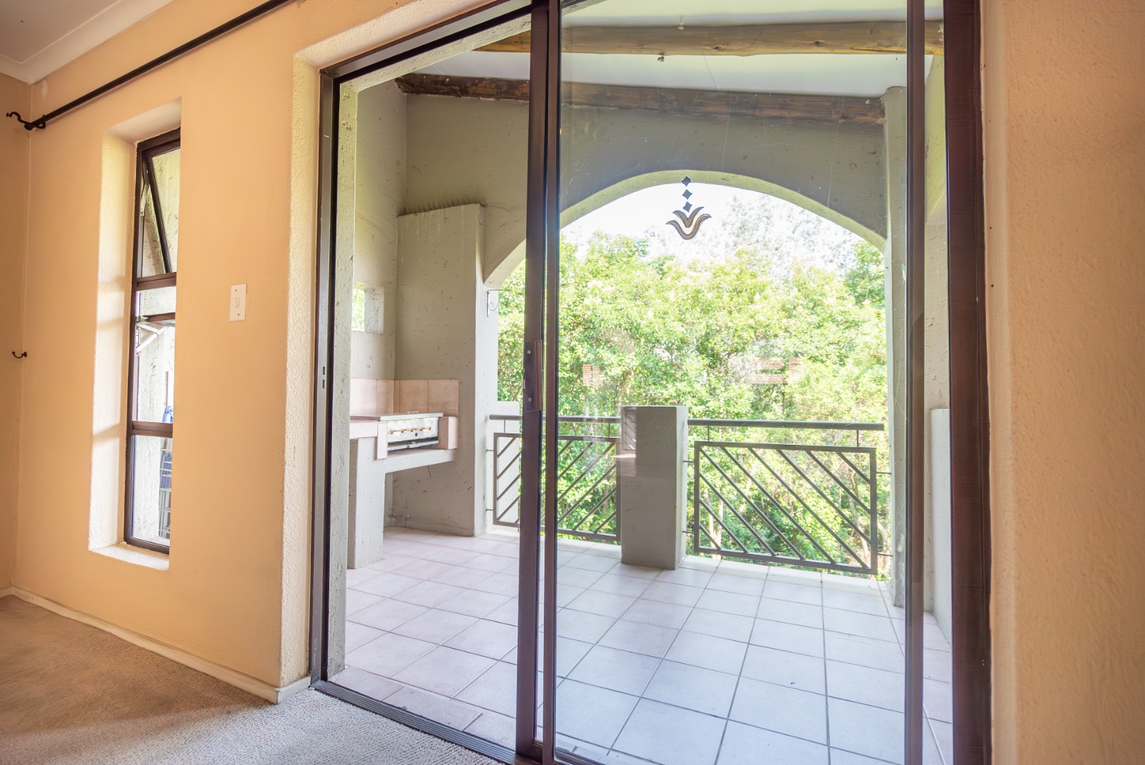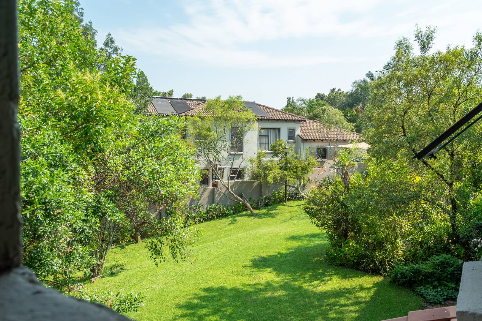 The open-plan living area flows onto a well-sized covered patio with a built-in gas braai. It’s a space that works easily into everyday life — morning coffee overlooking the trees, afternoons with the doors open, and relaxed evenings outdoors. The outlook is private and green, with established gardens and mature trees rather than neighbouring walls or parking areas.