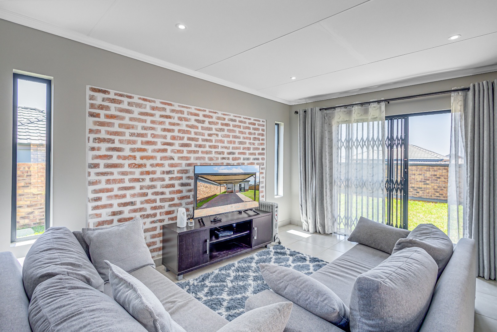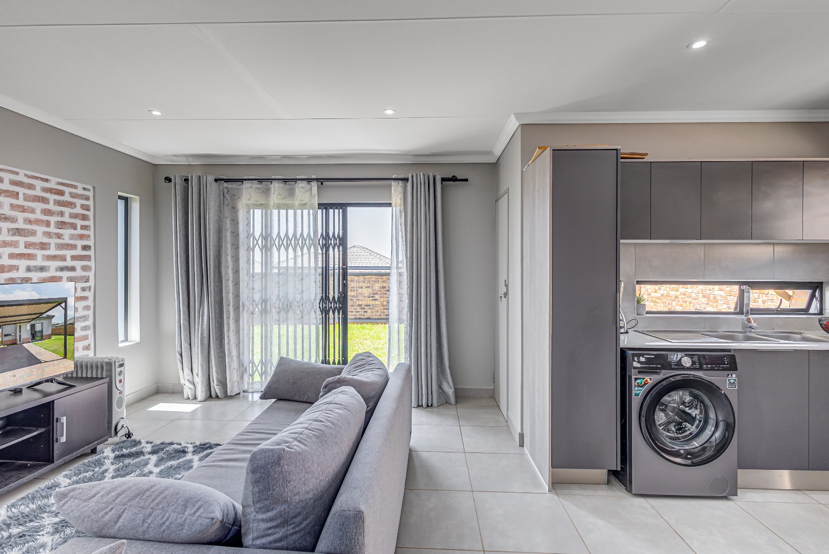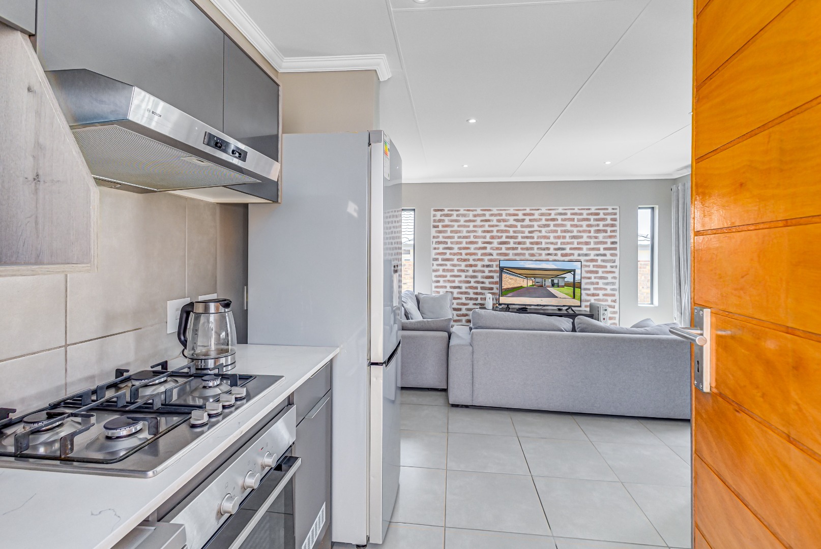 Step inside and fall in love with the modern open-plan kitchen, featuring a sleek gas stove, hob, extractor fan, and stylish finishes. The kitchen flows effortlessly into a neat, tiled lounge designed with elegant brick detail and a sliding door that allows fresh air and natural light to fill the space β creating a warm and welcoming atmosphere.