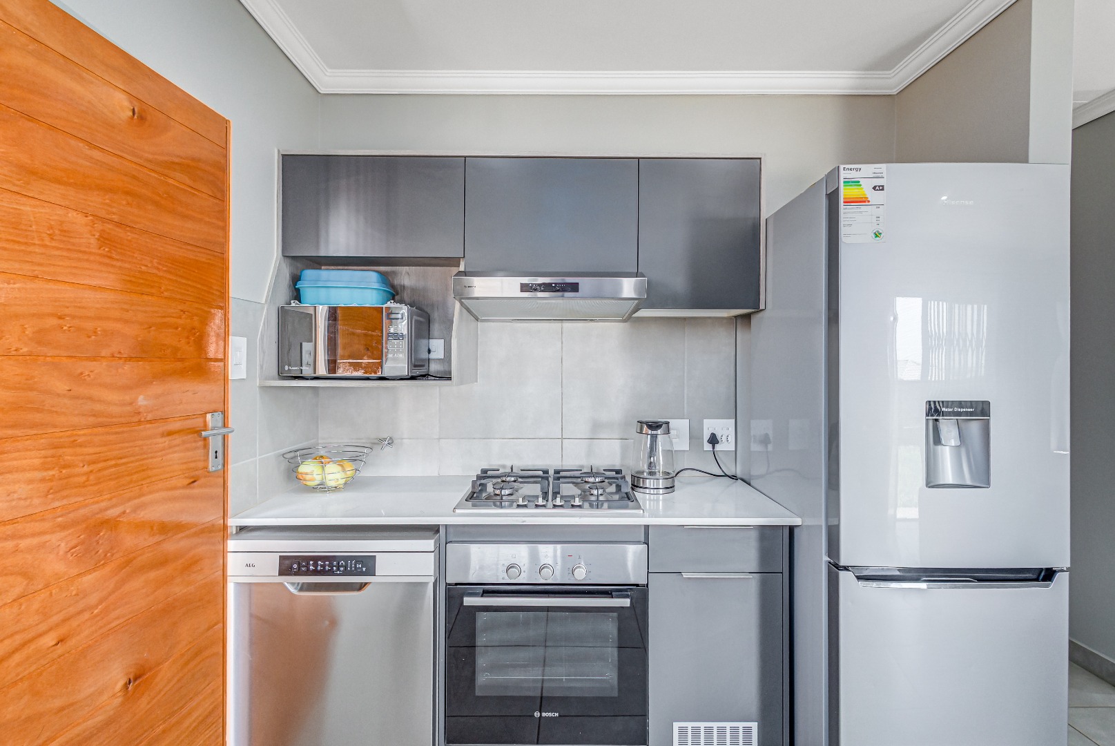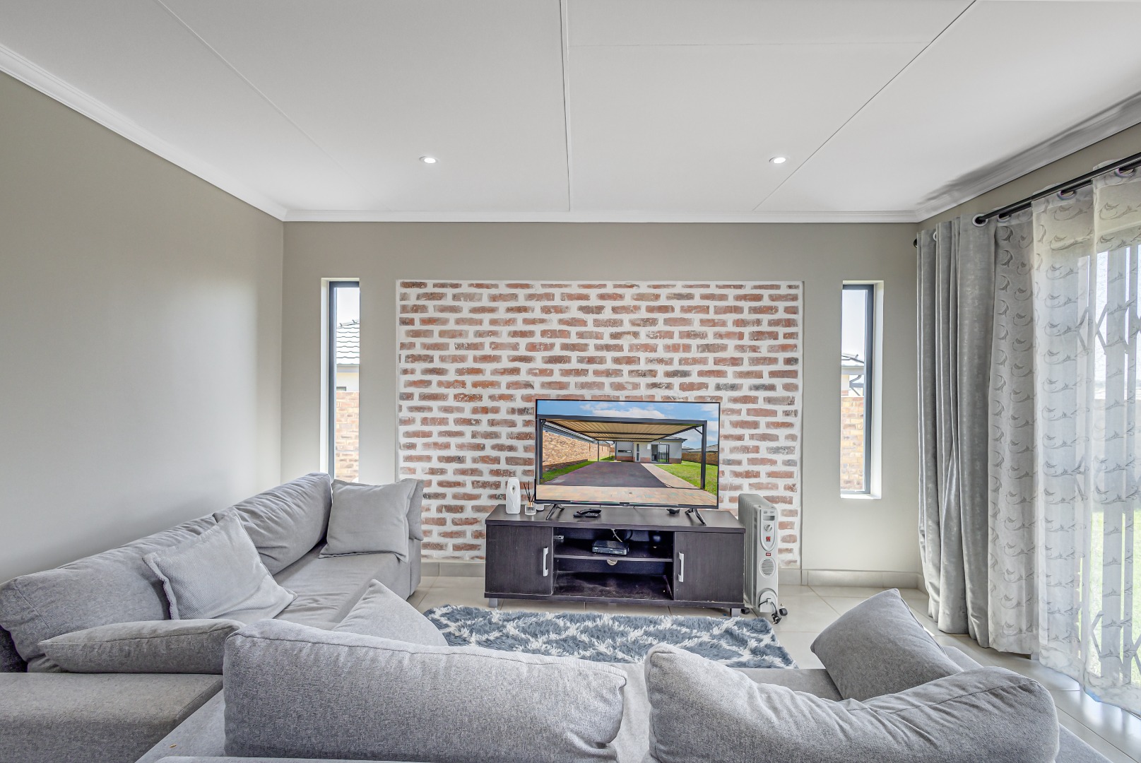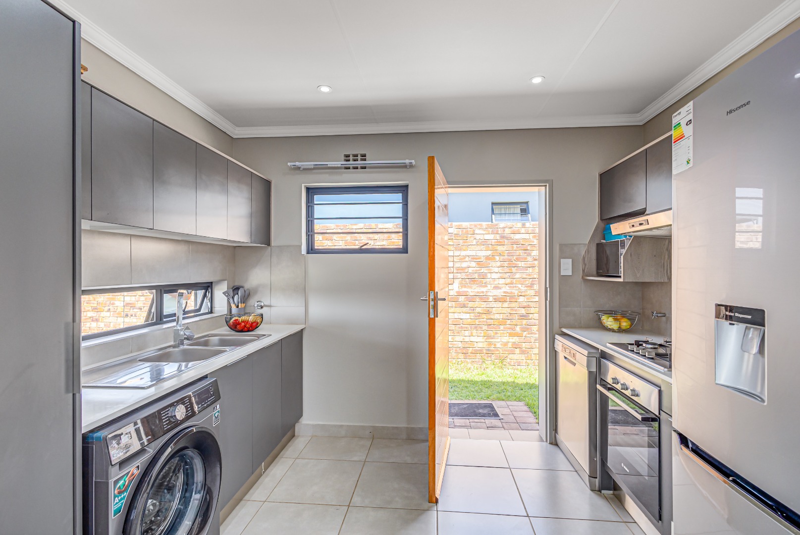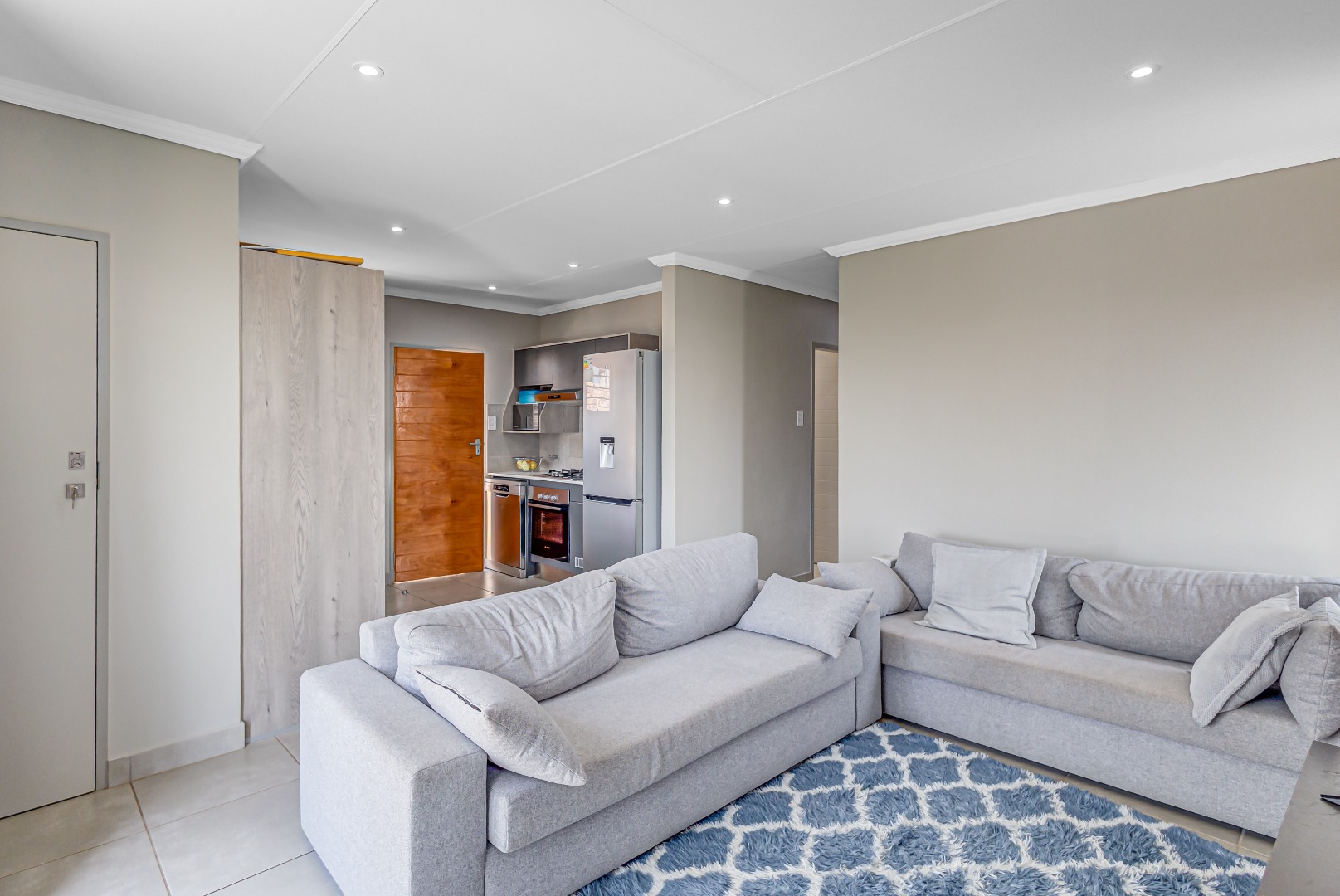 Step inside and fall in love with the modern open-plan kitchen, featuring a sleek gas stove, hob, extractor fan, and stylish finishes. The kitchen flows effortlessly into a neat, tiled lounge designed with elegant brick detail and a sliding door that allows fresh air and natural light to fill the space β creating a warm and welcoming atmosphere.