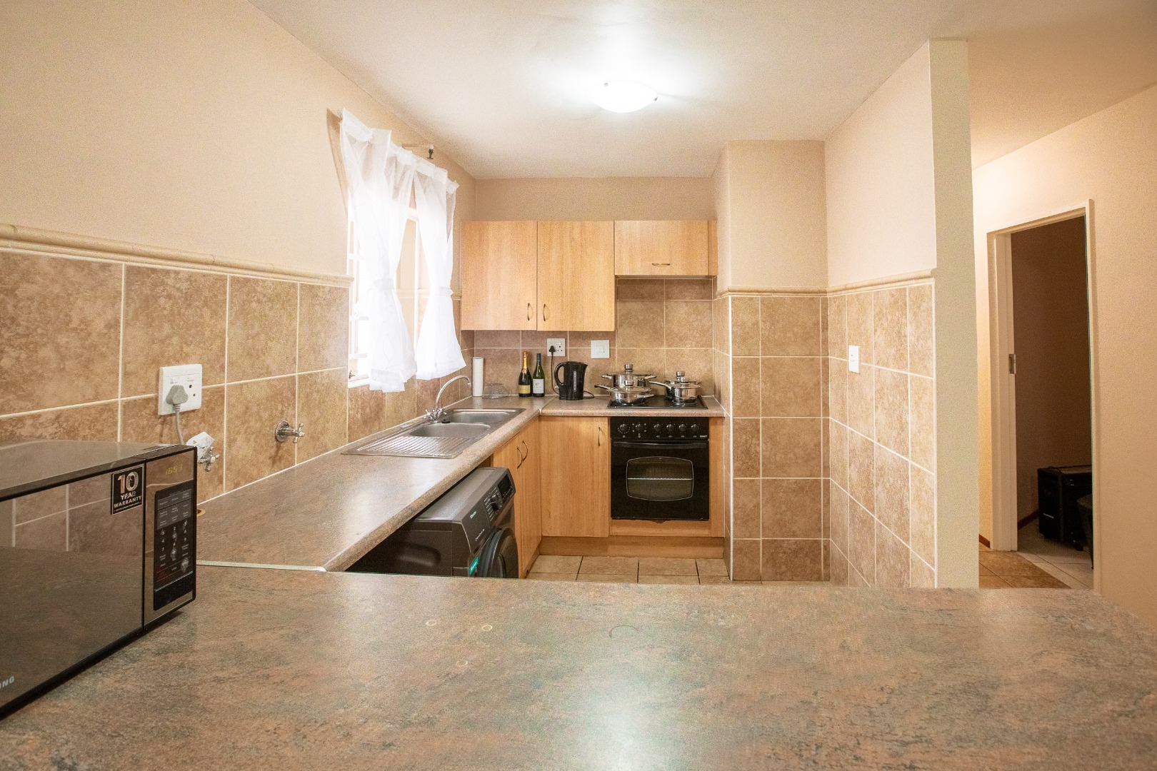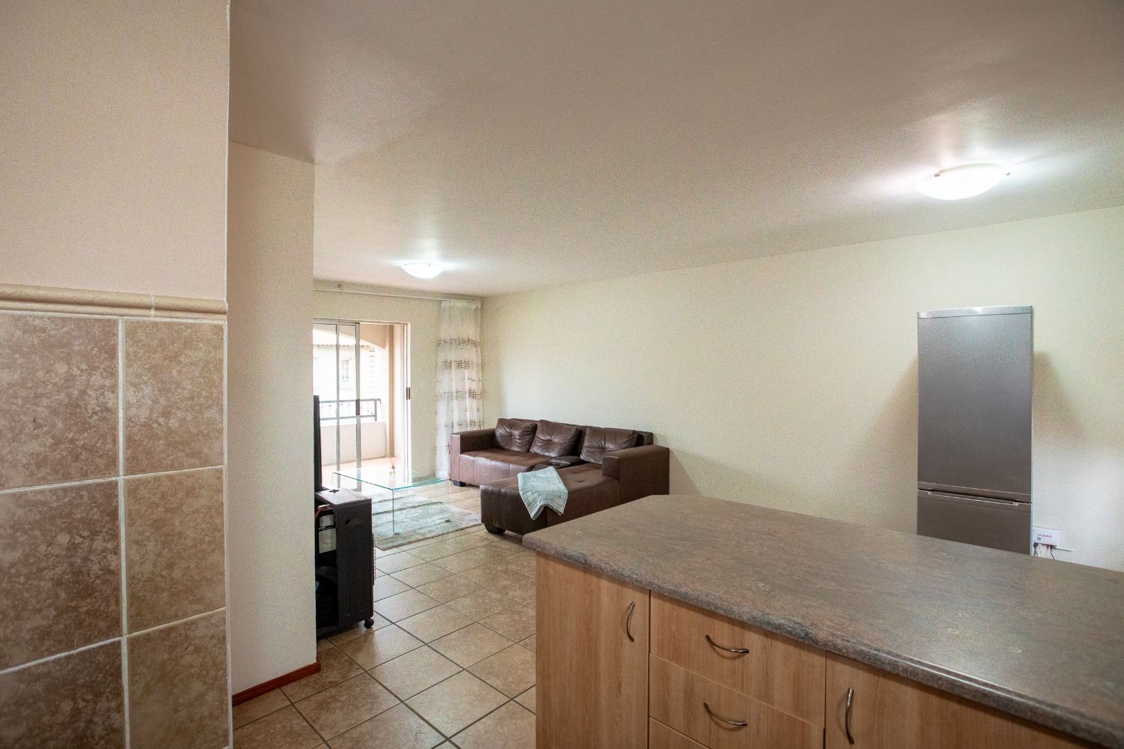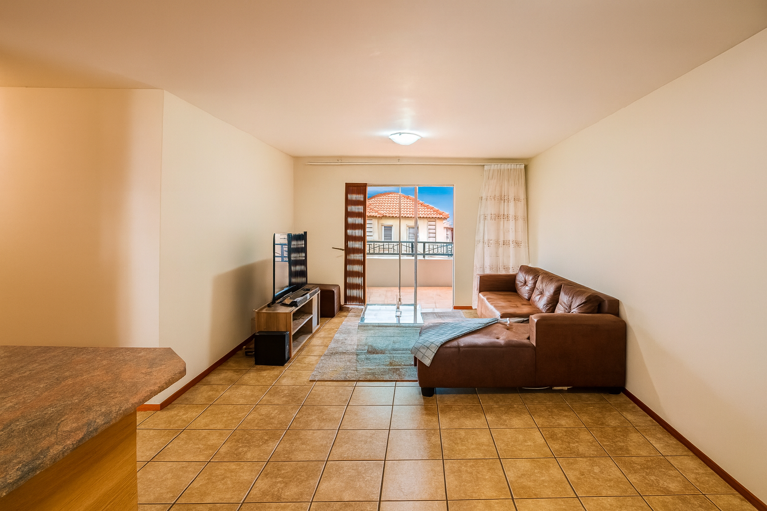 The interior features a functional open-plan layout, seamlessly connecting the living, dining, and kitchen areas. Tiled flooring throughout ensures easy maintenance and a cohesive flow. The kitchen is equipped with ample built-in cabinetry, a double sink, and a built-in oven and hob, providing a practical space for culinary activities. Natural light floods the living spaces, enhanced by access to a private balcony, perfect for outdoor relaxation.