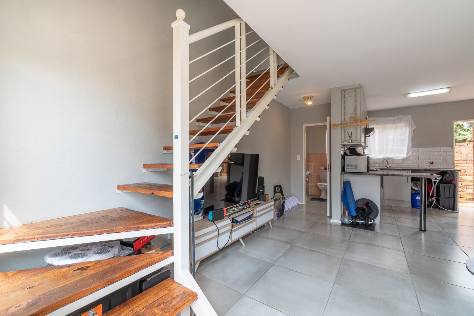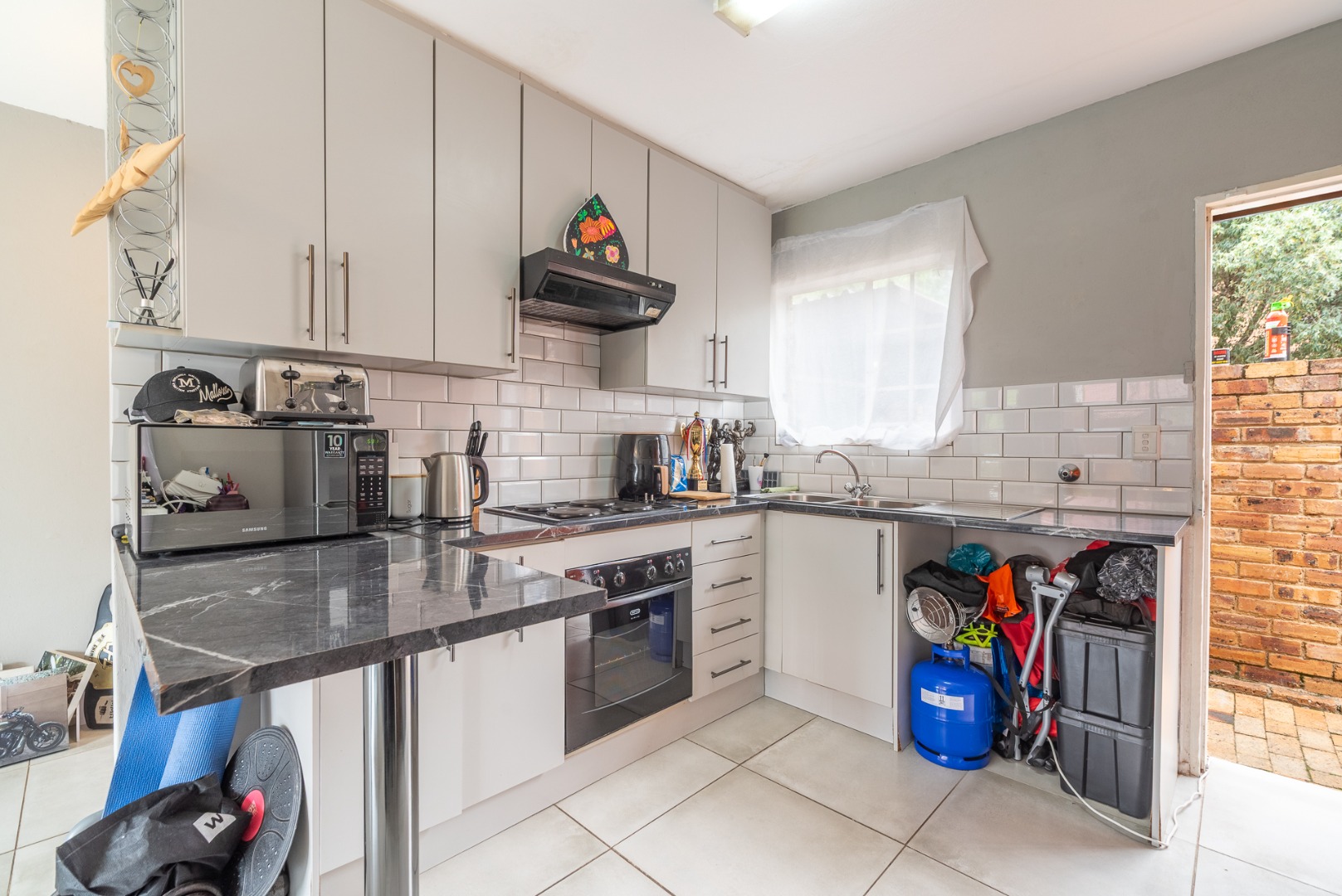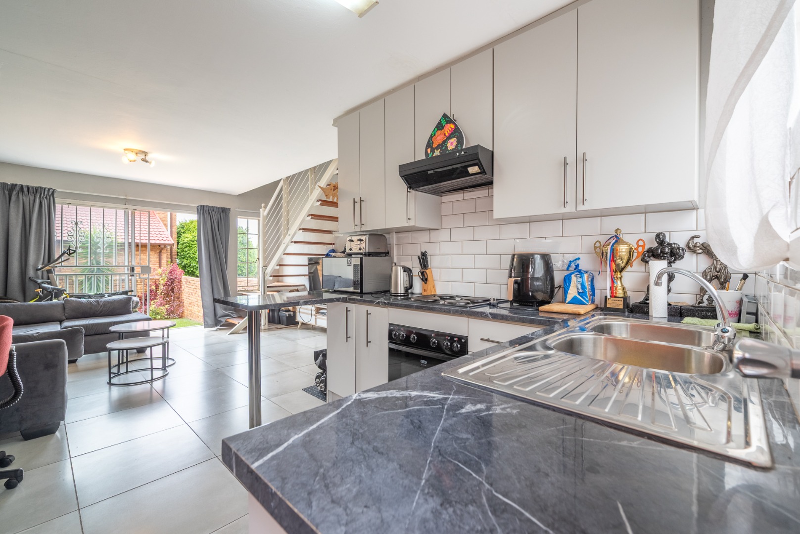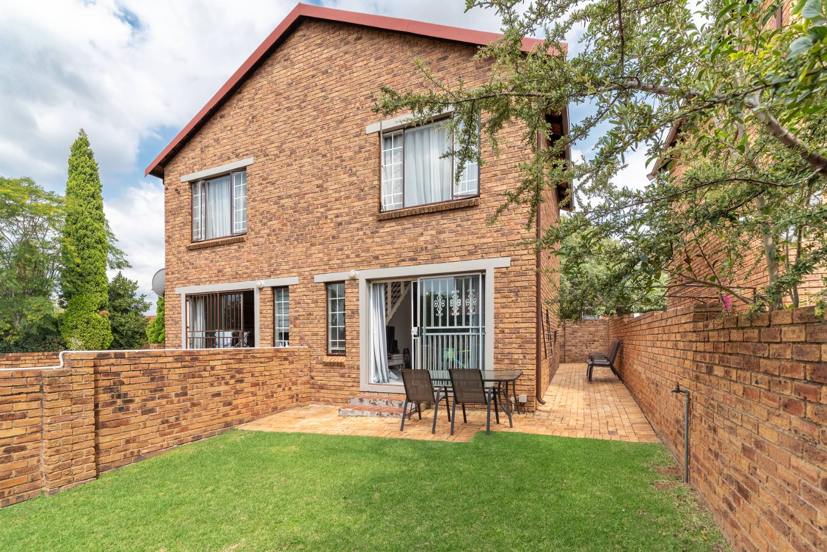 This charming two-story brick townhouse, located in the secure complex of Honeydew Ridge, Roodepoort, presents a welcoming kerb appeal. Its durable brick construction and red roof are complemented by a covered patio, ideal for outdoor relaxation. A large paved courtyard and driveway offer ample parking, alongside a detached double garage, providing both convenience and additional storage. Step inside to discover a bright, open-plan living and kitchen area, featuring contemporary tiled flooring and neutral grey walls. The modern kitchen boasts white cabinetry, dark marble-look countertops, a white subway tile backsplash, and integrated appliances including an oven and hob. Natural light streams in through large windows, enhancing the spacious feel and creating an inviting atmosphere for daily living and entertaining. The residence offers two comfortable bedrooms, each providing ample natural light and a versatile neutral palette, ready for personalisation. The main bathroom features a separate bathtub and shower stall, offering both options for relaxation and practicality. A convenient guest toilet is located downstairs, adding to the home's functionality. Tiled walls in the bathrooms ensure easy maintenance. The property includes a private outdoor area accessible from the living space, perfect for quiet enjoyment or small gatherings. Residents benefit from living within a security complex, featuring 24-hour security, an access gate, and security gates, ensuring peace of mind. The home is fibre-ready, catering to modern connectivity needs, and pets are allowed, adding to the home's appeal. Situated in Honeydew Ridge, Roodepoort, this location offers convenient access to local amenities and transport routes. The area is well-regarded for its community feel and accessibility, making it an ideal choice for various lifestyles. Key Features: * 2 Bedrooms, 2 Bathrooms (including guest toilet) * Modern Open-Plan Living & Kitchen * Detached Double Garage & Paved Parking * Covered Patio & Private Outdoor Area * Secure Complex with 24-Hour Security * Fibre Ready * Pet-Friendly Environment