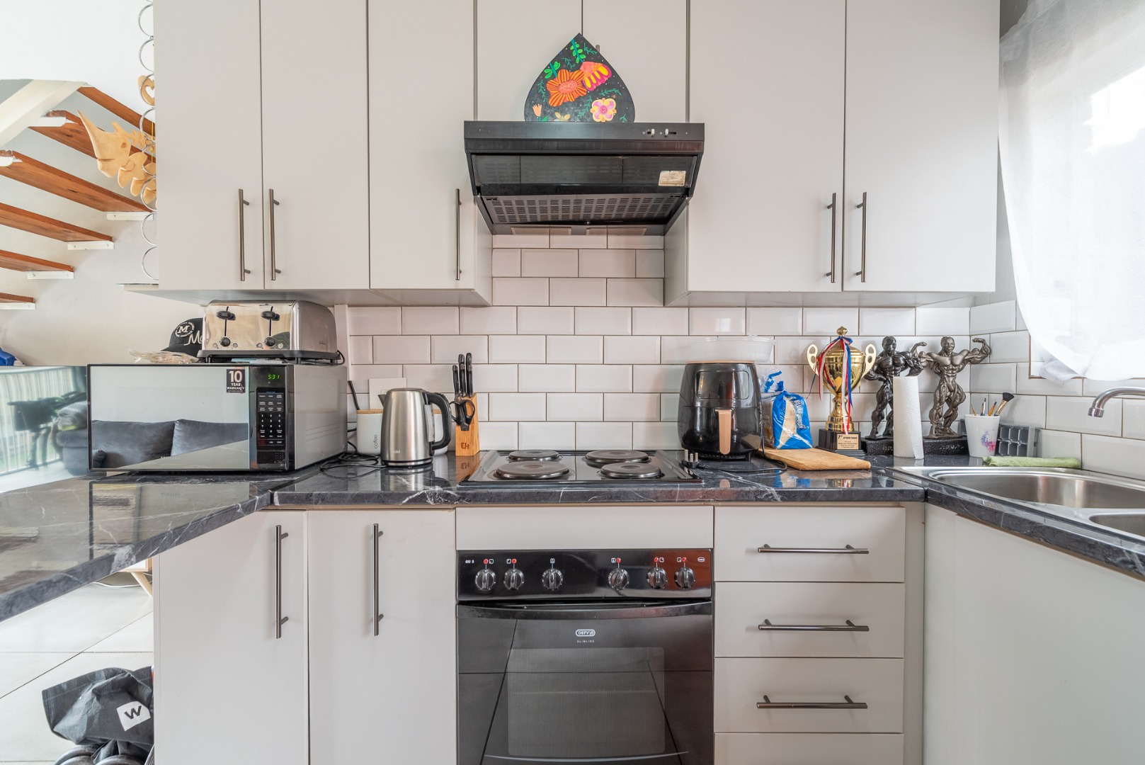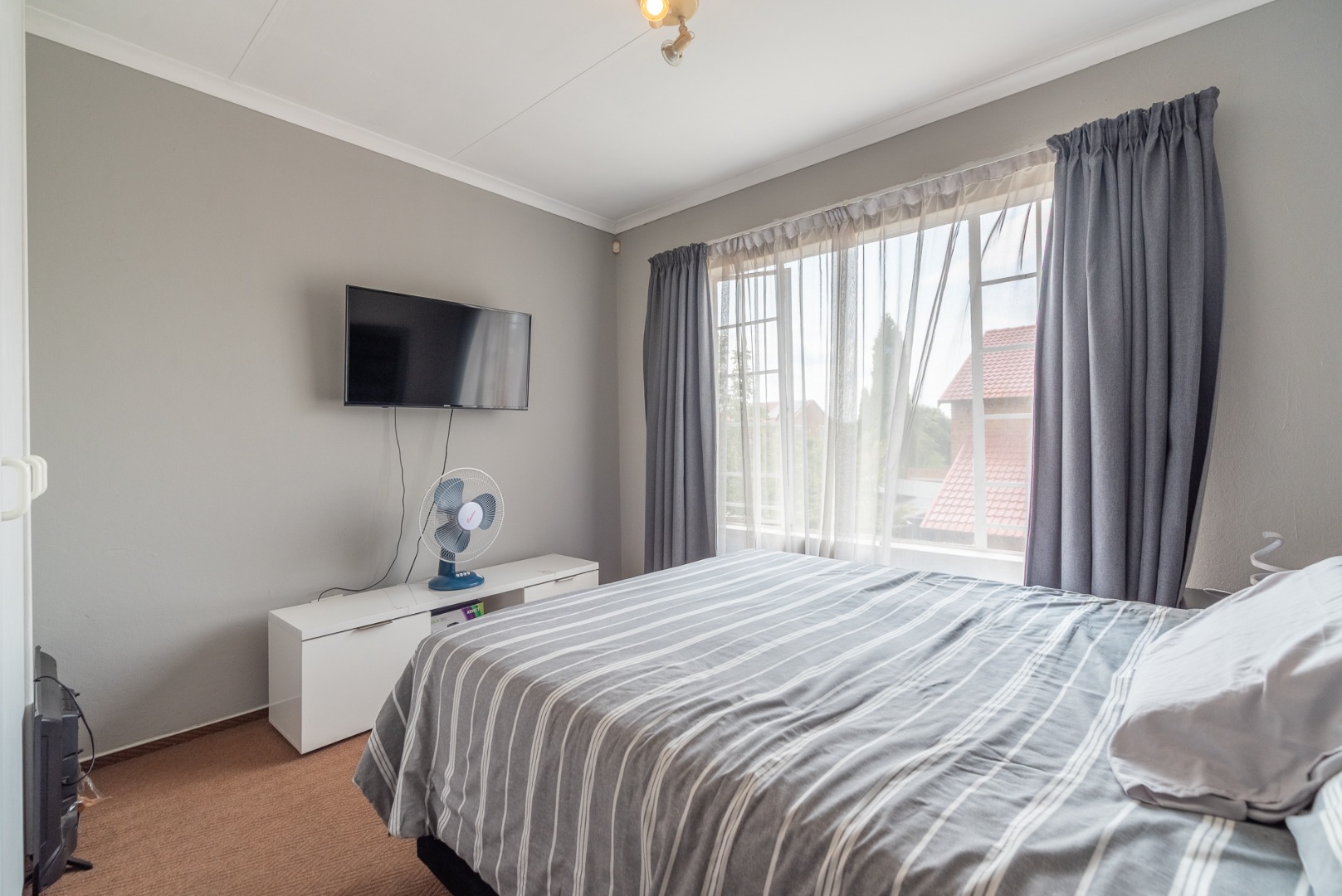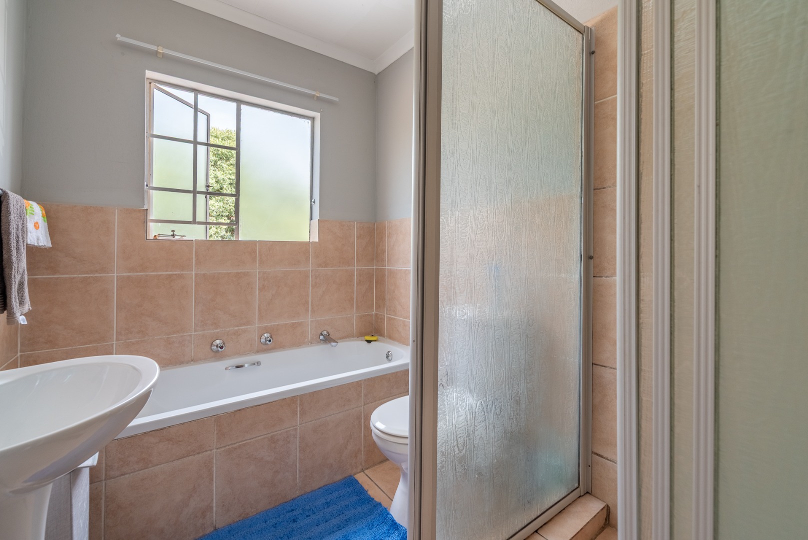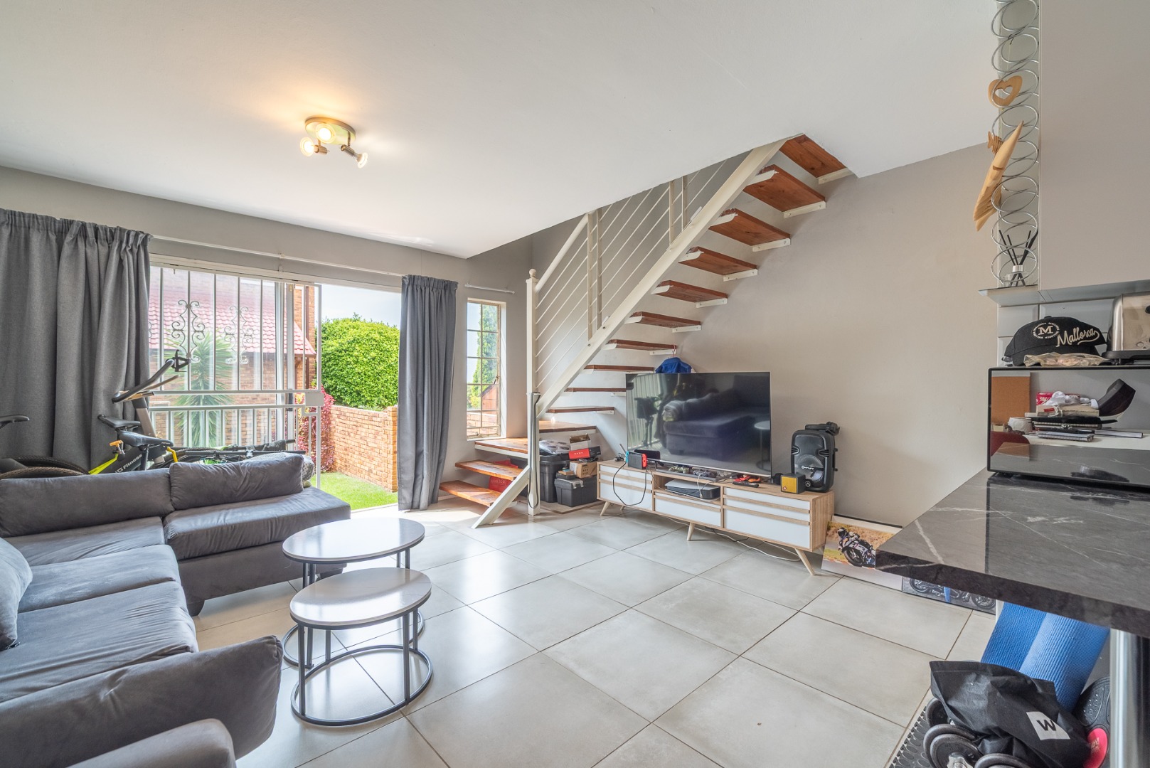 This charming two-story brick townhouse, located in the secure complex of Honeydew Ridge, Roodepoort, presents a welcoming kerb appeal. Its durable brick construction and red roof are complemented by a covered patio, ideal for outdoor relaxation. A large paved courtyard and driveway offer ample parking, alongside a detached double garage, providing both convenience and additional storage. Step inside to discover a bright, open-plan living and kitchen area, featuring contemporary tiled flooring and neutral grey walls. The modern kitchen boasts white cabinetry, dark marble-look countertops, a white subway tile backsplash, and integrated appliances including an oven and hob. Natural light streams in through large windows, enhancing the spacious feel and creating an inviting atmosphere for daily living and entertaining. The residence offers two comfortable bedrooms, each providing ample natural light and a versatile neutral palette, ready for personalisation. The main bathroom features a separate bathtub and shower stall, offering both options for relaxation and practicality. A convenient guest toilet is located downstairs, adding to the home's functionality. Tiled walls in the bathrooms ensure easy maintenance. The property includes a private outdoor area accessible from the living space, perfect for quiet enjoyment or small gatherings. Residents benefit from living within a security complex, featuring 24-hour security, an access gate, and security gates, ensuring peace of mind. The home is fibre-ready, catering to modern connectivity needs, and pets are allowed, adding to the home's appeal. Situated in Honeydew Ridge, Roodepoort, this location offers convenient access to local amenities and transport routes. The area is well-regarded for its community feel and accessibility, making it an ideal choice for various lifestyles. Key Features: * 2 Bedrooms, 2 Bathrooms (including guest toilet) * Modern Open-Plan Living & Kitchen * Detached Double Garage & Paved Parking * Covered Patio & Private Outdoor Area * Secure Complex with 24-Hour Security * Fibre Ready * Pet-Friendly Environment