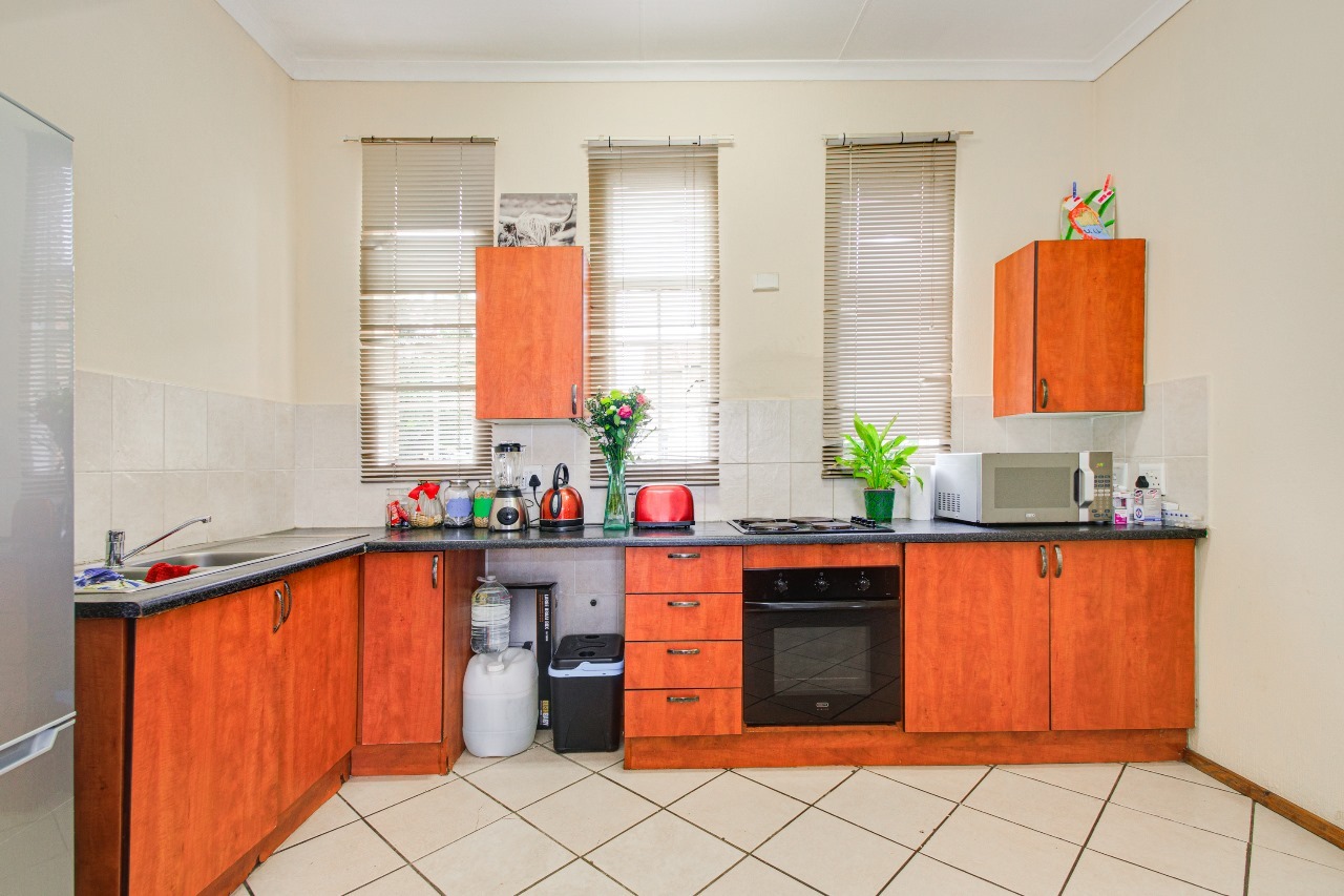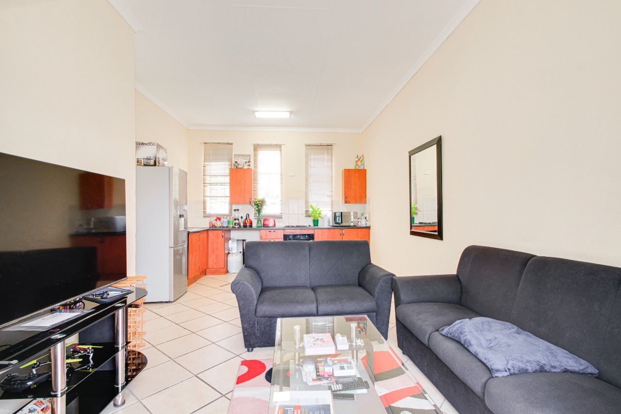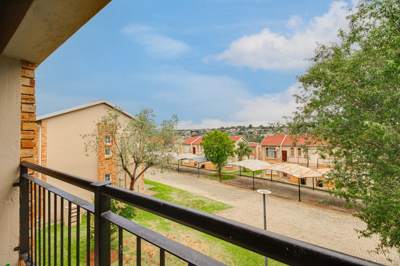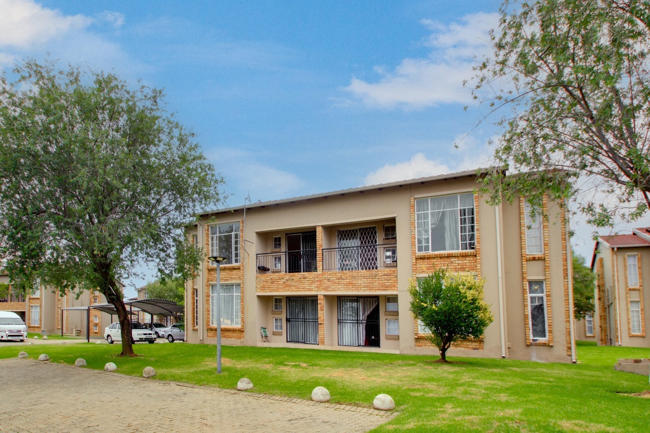 This 2-bedroom, 1-bathroom apartment is situated within a well-maintained residential complex in the vibrant Roodepoort area. The complex boasts a contemporary aesthetic with red-tiled roofs, light-colored walls, and brick accents, complemented by green lawns and mature trees. Residents benefit from dedicated covered parking facilities and the peace of mind offered by a secure complex environment. The property's kerb appeal is enhanced by its tidy presentation and thoughtful design, featuring paved roads and individual unit balconies.