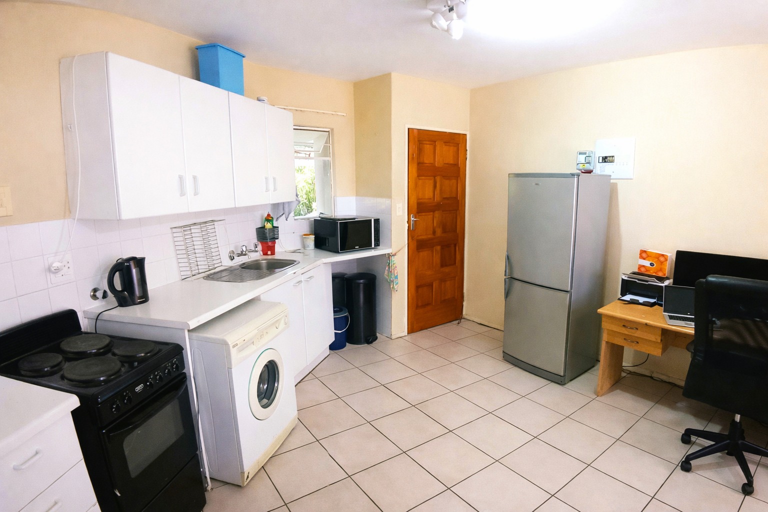 The interior features an open-plan layout, seamlessly connecting the lounge, dining area, and kitchen. The compact kitchen is fitted with modern white cabinets and tiled flooring, offering a functional space for daily living. The living area benefits from ample natural light through large windows and provides a versatile space that can accommodate both relaxation and a dedicated workstation.