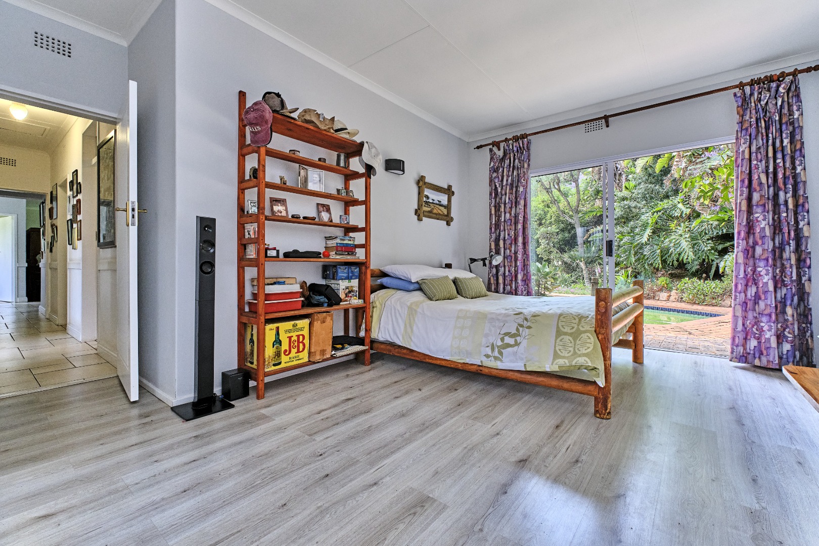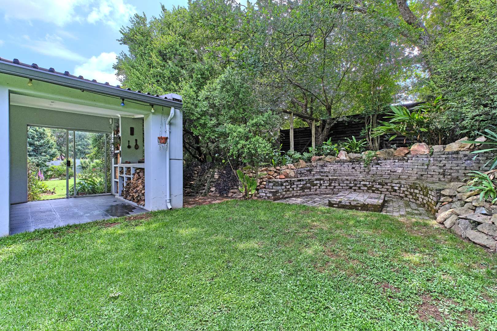 The open-plan lounge and dining area feature warm wood-look flooring, a cozy fireplace, and sliding doors that open out to the covered patio — the ideal spot for summer braais overlooking the sparkling pool and lush private garden.