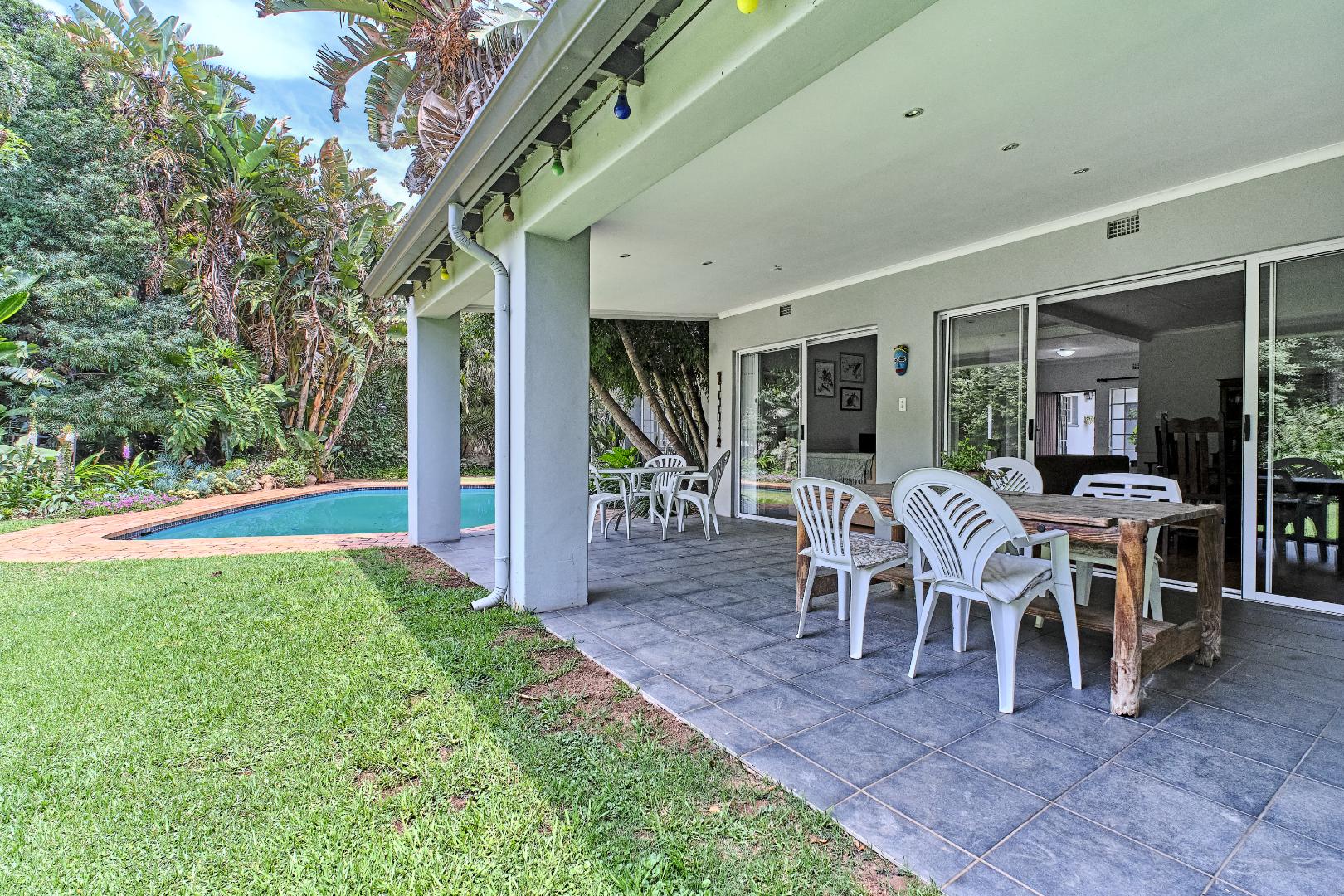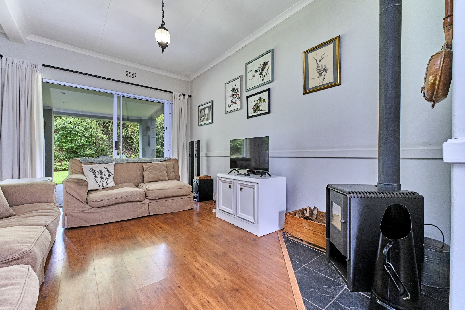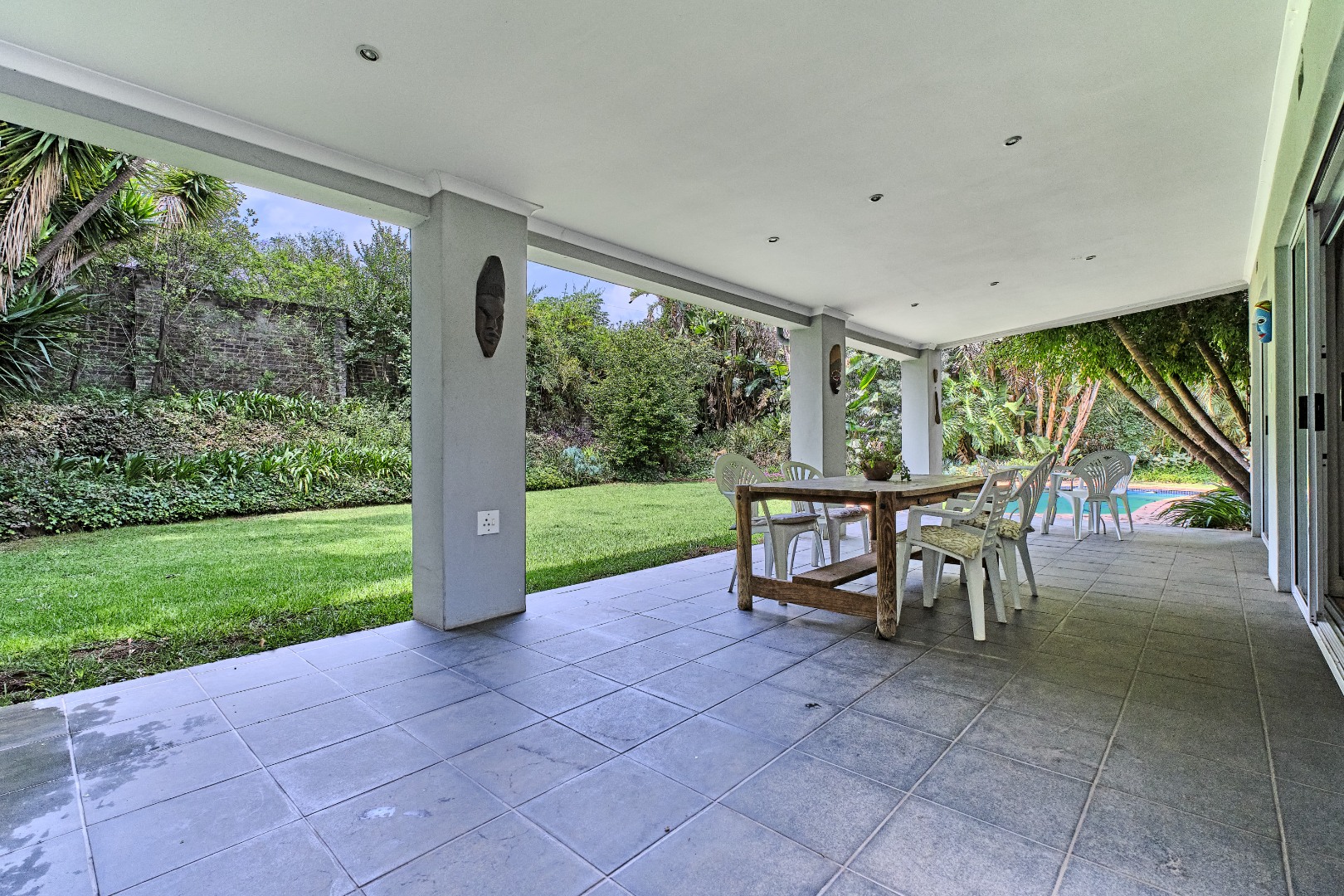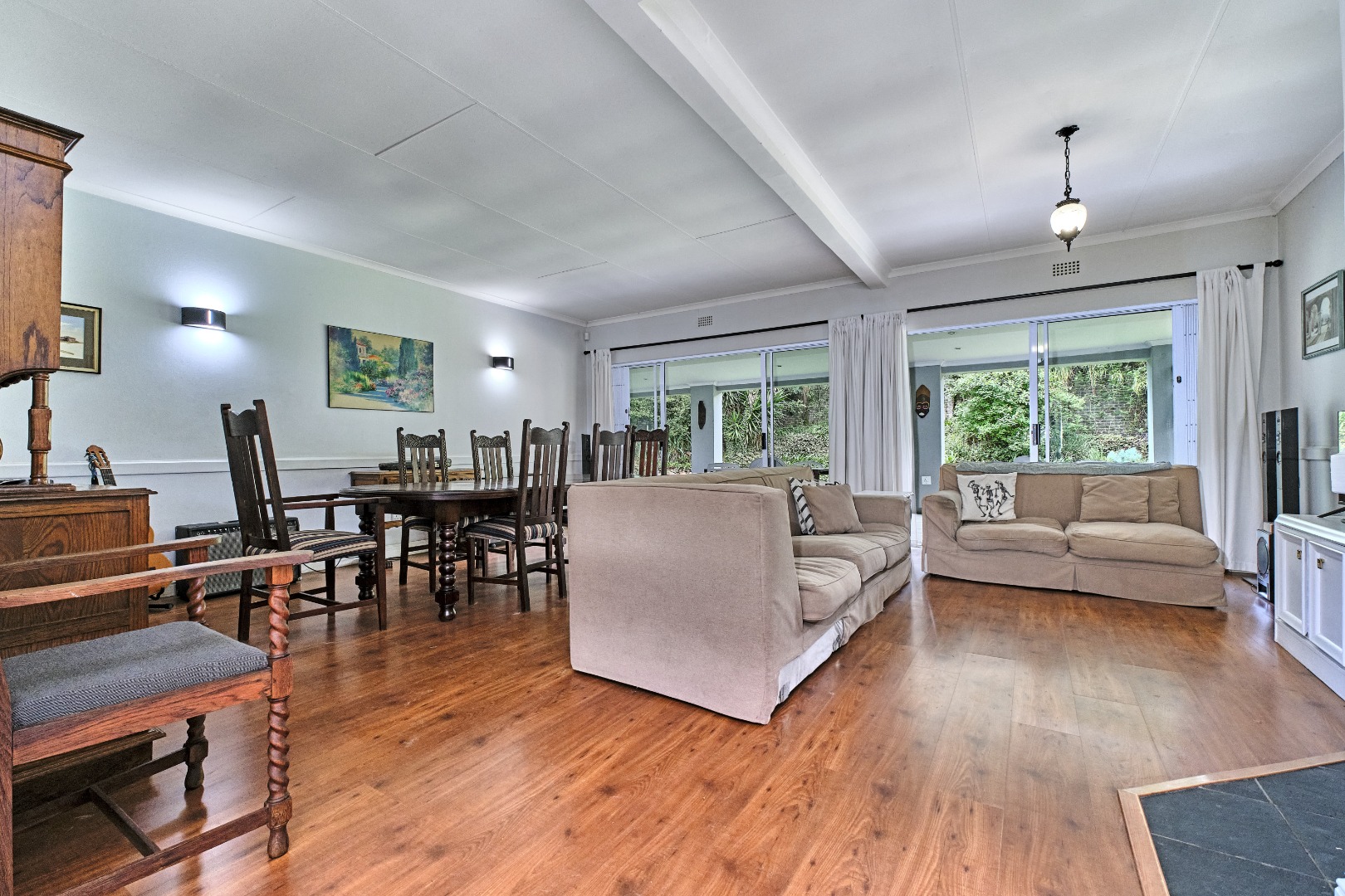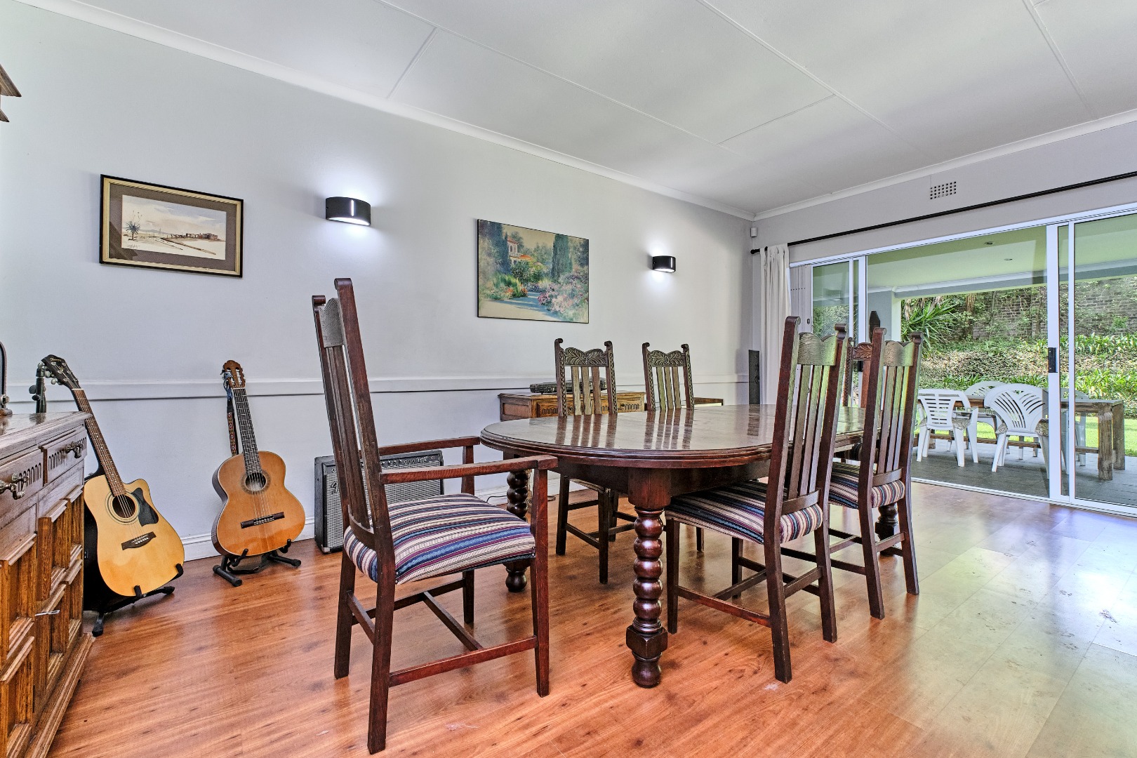 The open-plan lounge and dining area feature warm wood-look flooring, a cozy fireplace, and sliding doors that open out to the covered patio — the ideal spot for summer braais overlooking the sparkling pool and lush private garden.