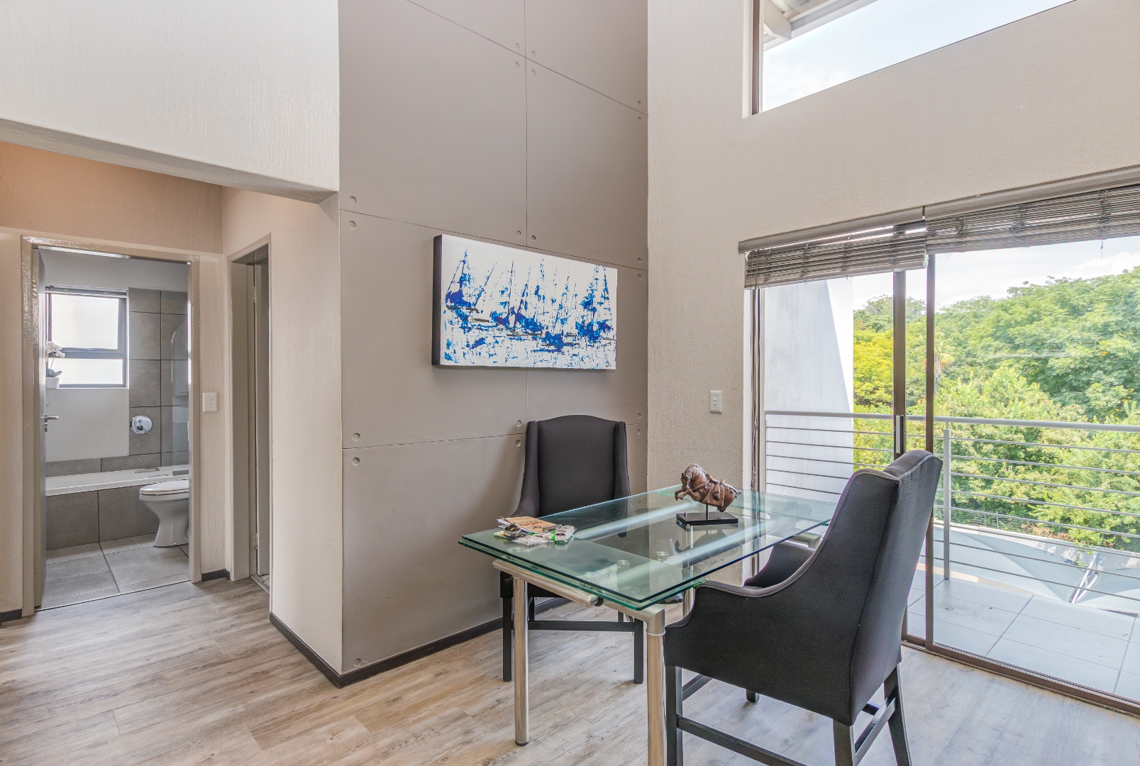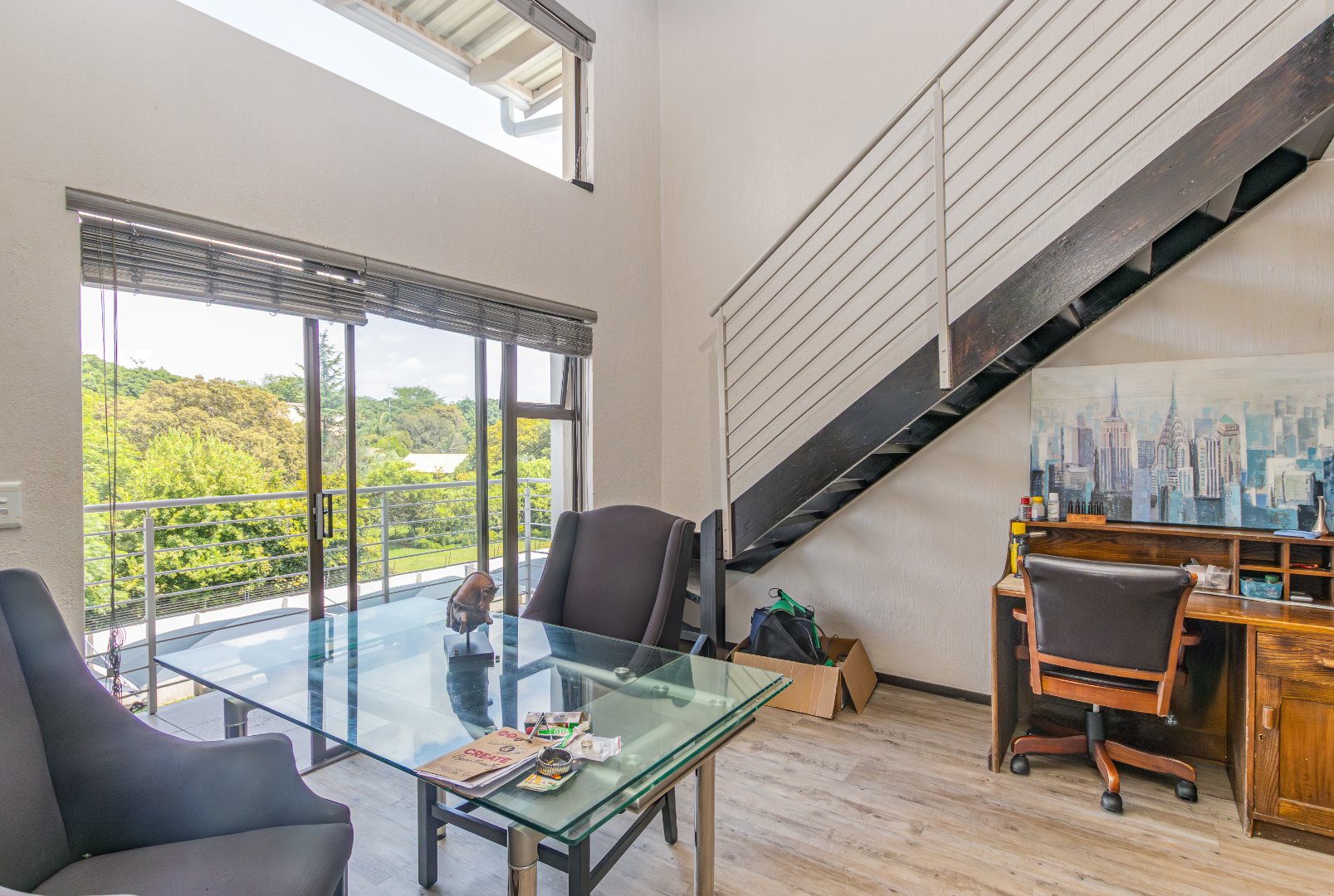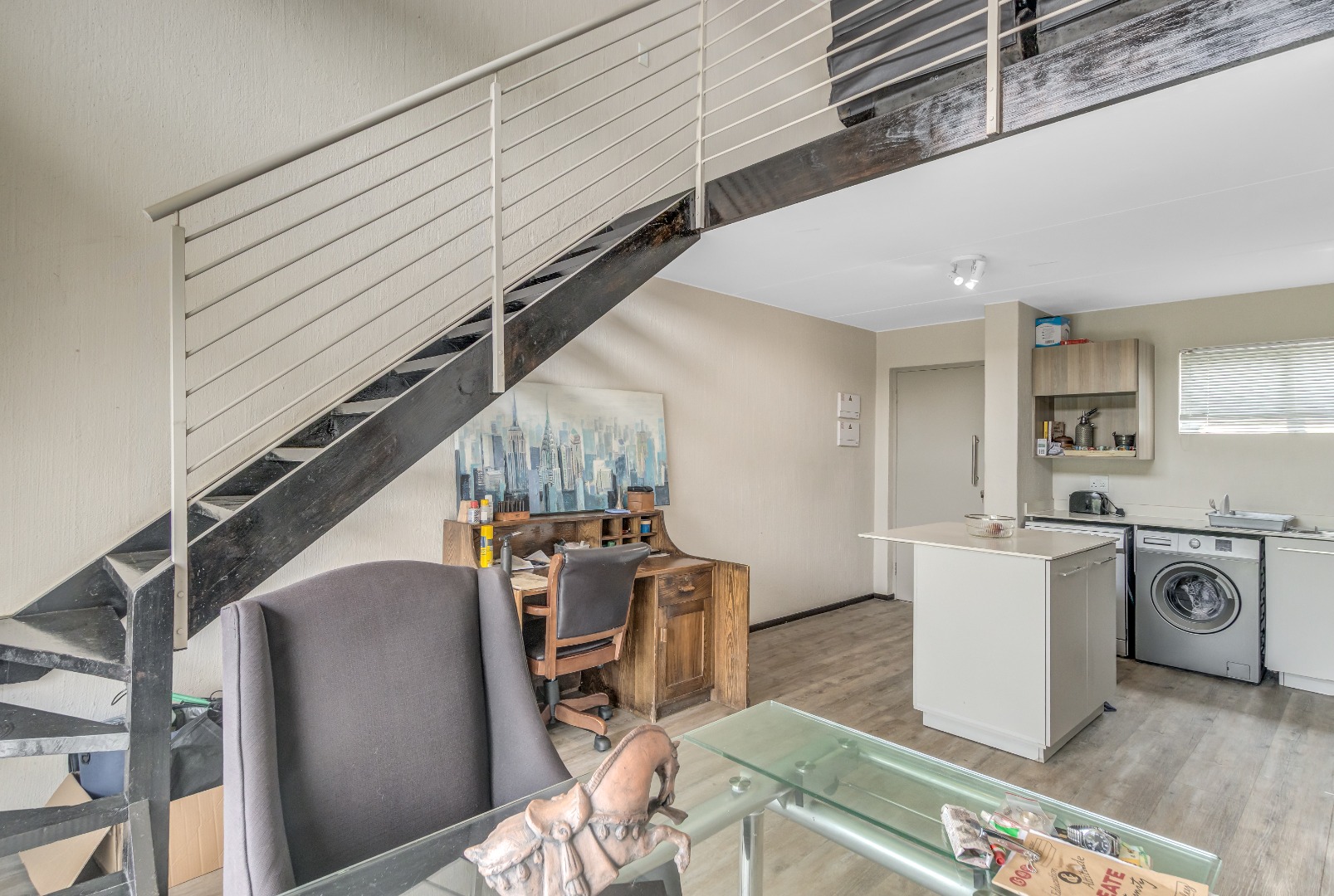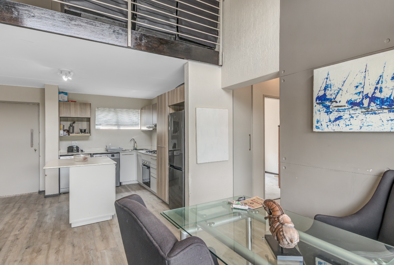 Step into this stylish 2-bedroom, 2-bathroom loft apartment in Broadacres, Sandton! This 82 sqm home offers a fantastic open-plan layout, perfect for contemporary living. High ceilings and expansive windows ensure abundant natural light, creating a bright, airy atmosphere. You'll appreciate the warm light wood laminate flooring throughout and the striking modern open-riser staircase leading to the large wooden floored loft area., adding architectural elegance.