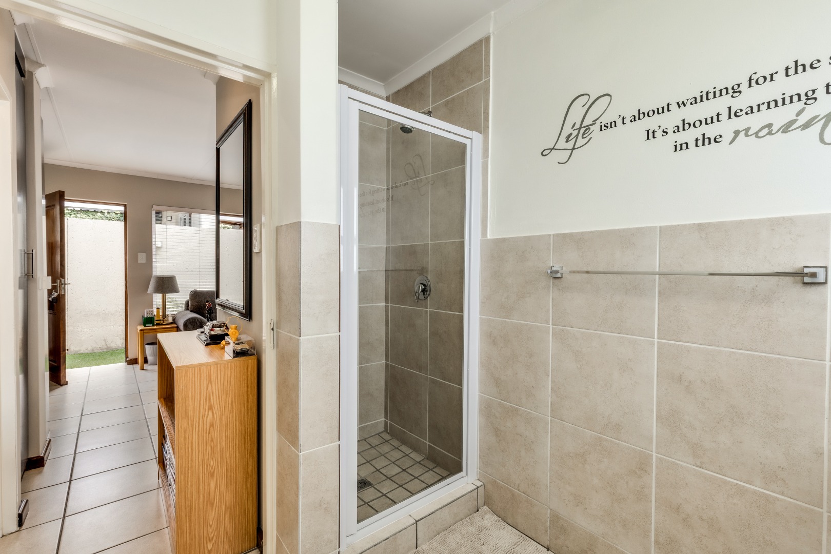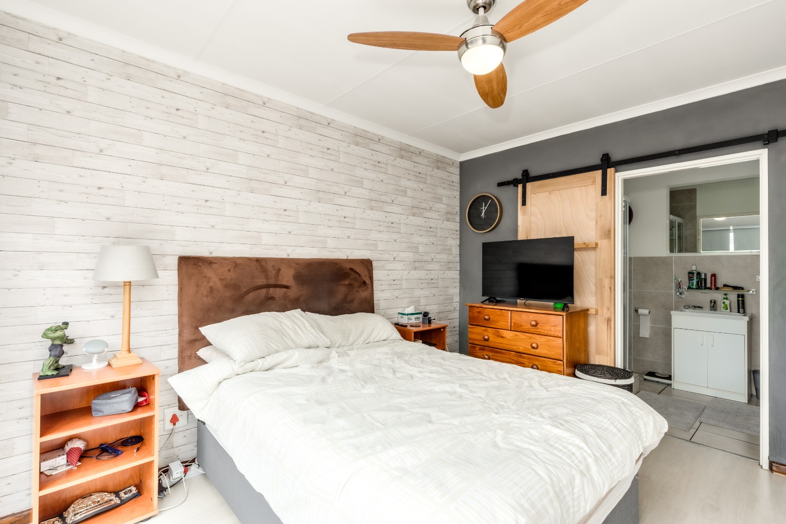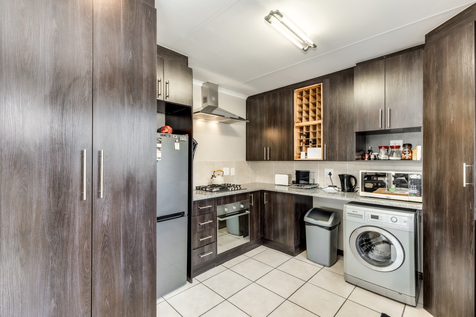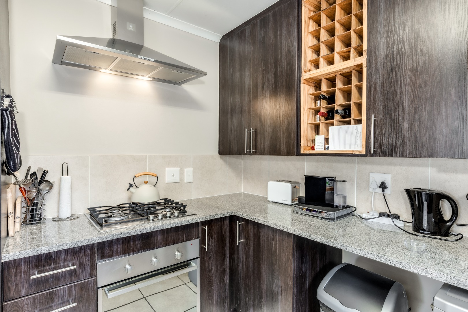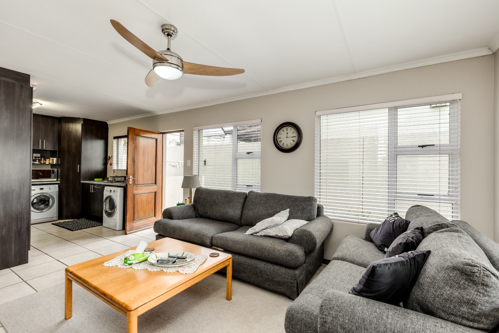 This immaculately neat and modern single-storey home is the perfect blend of style, functionality, and low-maintenance living. Beautifully maintained and upgraded with thoughtful finishes throughout, it features a stunning remodeled kitchen with sleek cabinetry, additional storage by way of a pantry cupboard and built inn wine rack, a gas stove top, beautiful quartz counter tops and under counter space for three appliances. The two spacious bedrooms are fitted with elegant laminated flooring, and both have ceiling fans warm weather. The master bedroom has it's own en-suite bathroom with a shower and a stylish barn door entrance which adds further character to this home, as well as beautiful sliding doors that open out onto the garden, and black our roller blinds. Every detail has been thought of in this lovely home! With its clean lines and contemporary design, this home is move-in ready and ideal for those who appreciate a modern, fuss-free lifestyle, as well as an affordable and easy to maintain property with exceptionally low levies, pre-paid electricity, a gas stove top and solar geyser.