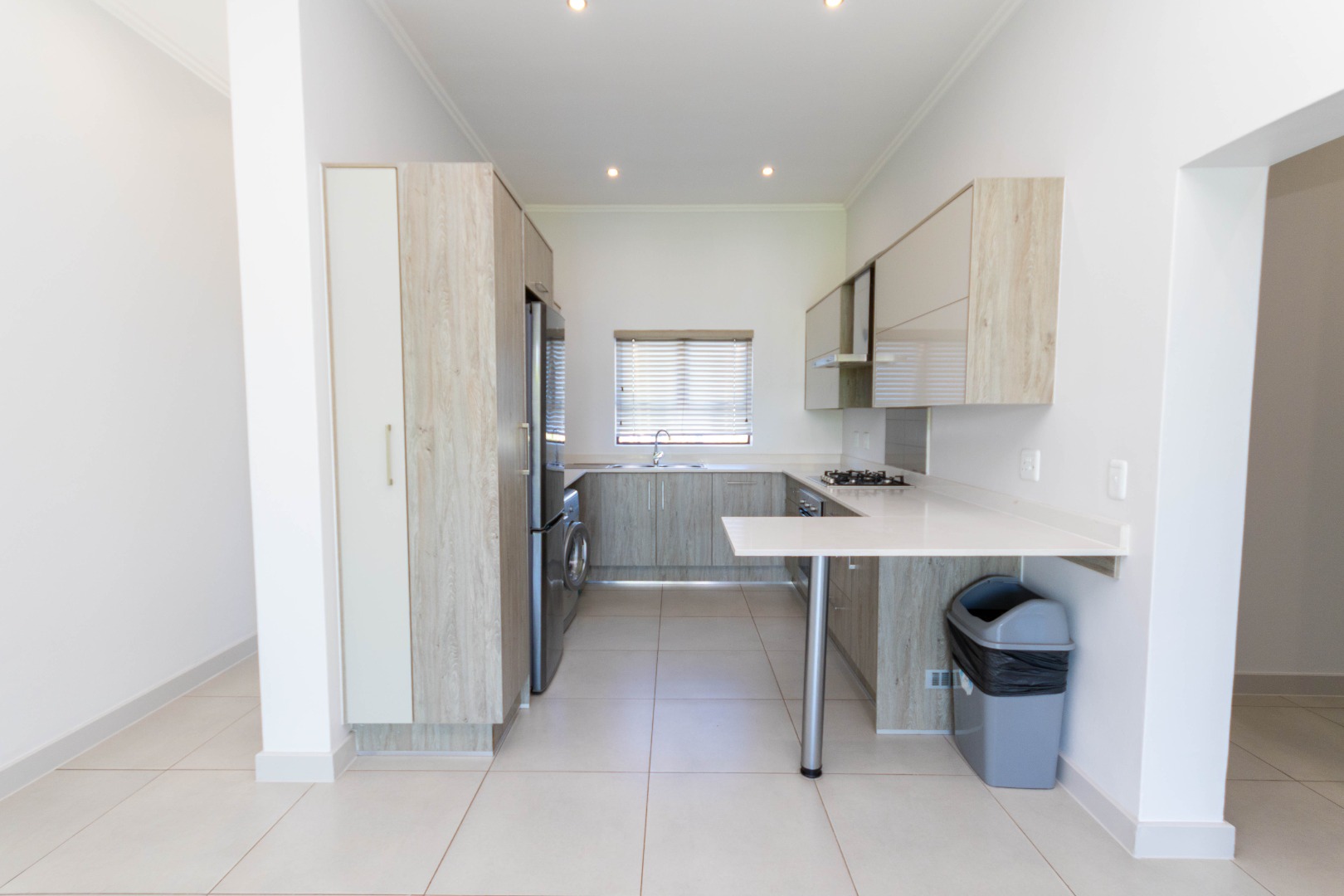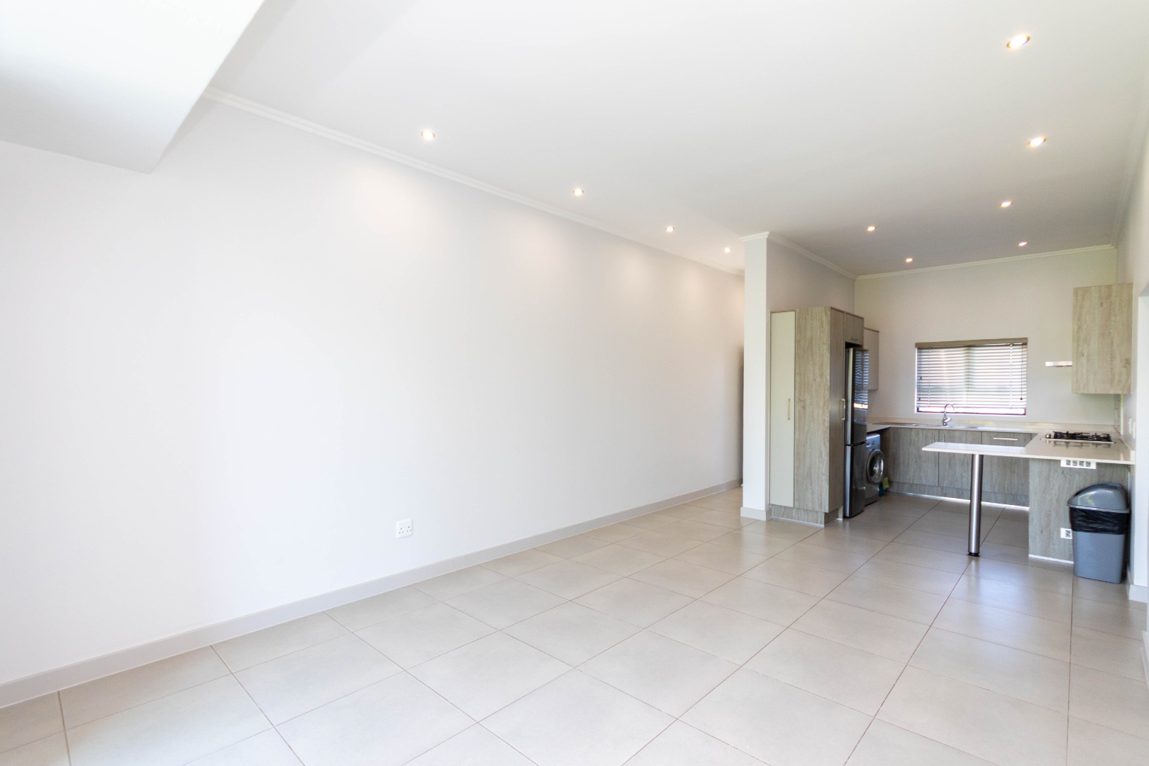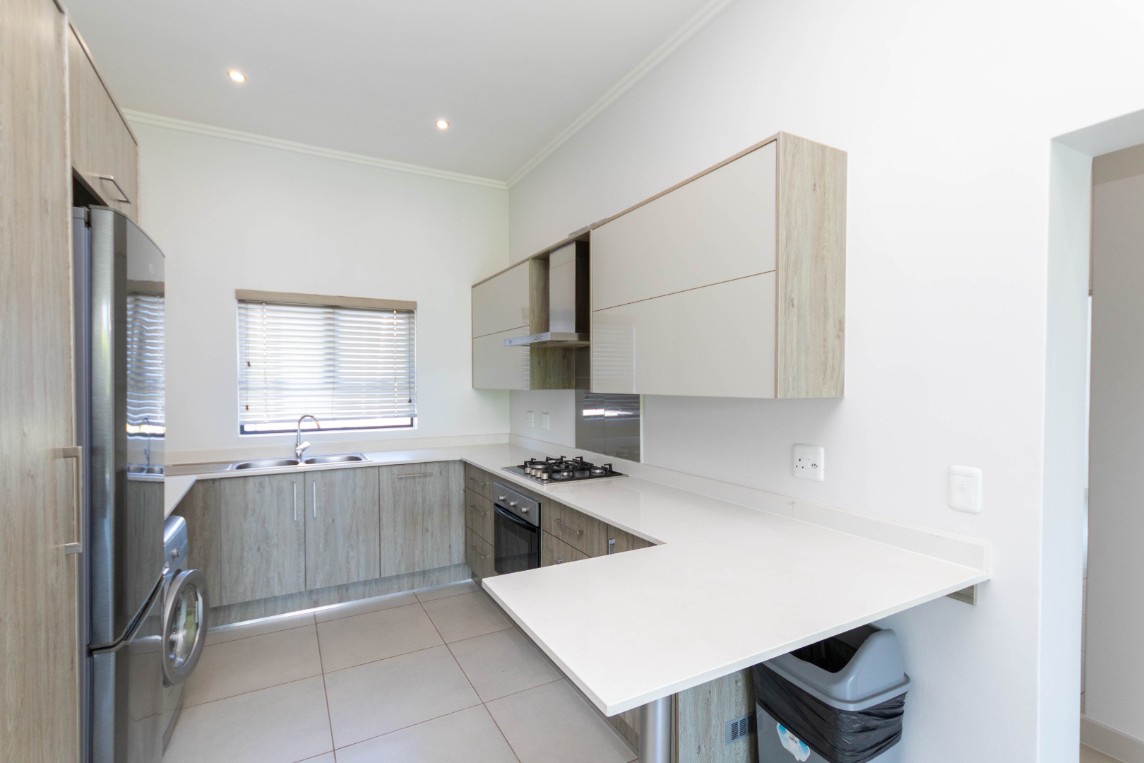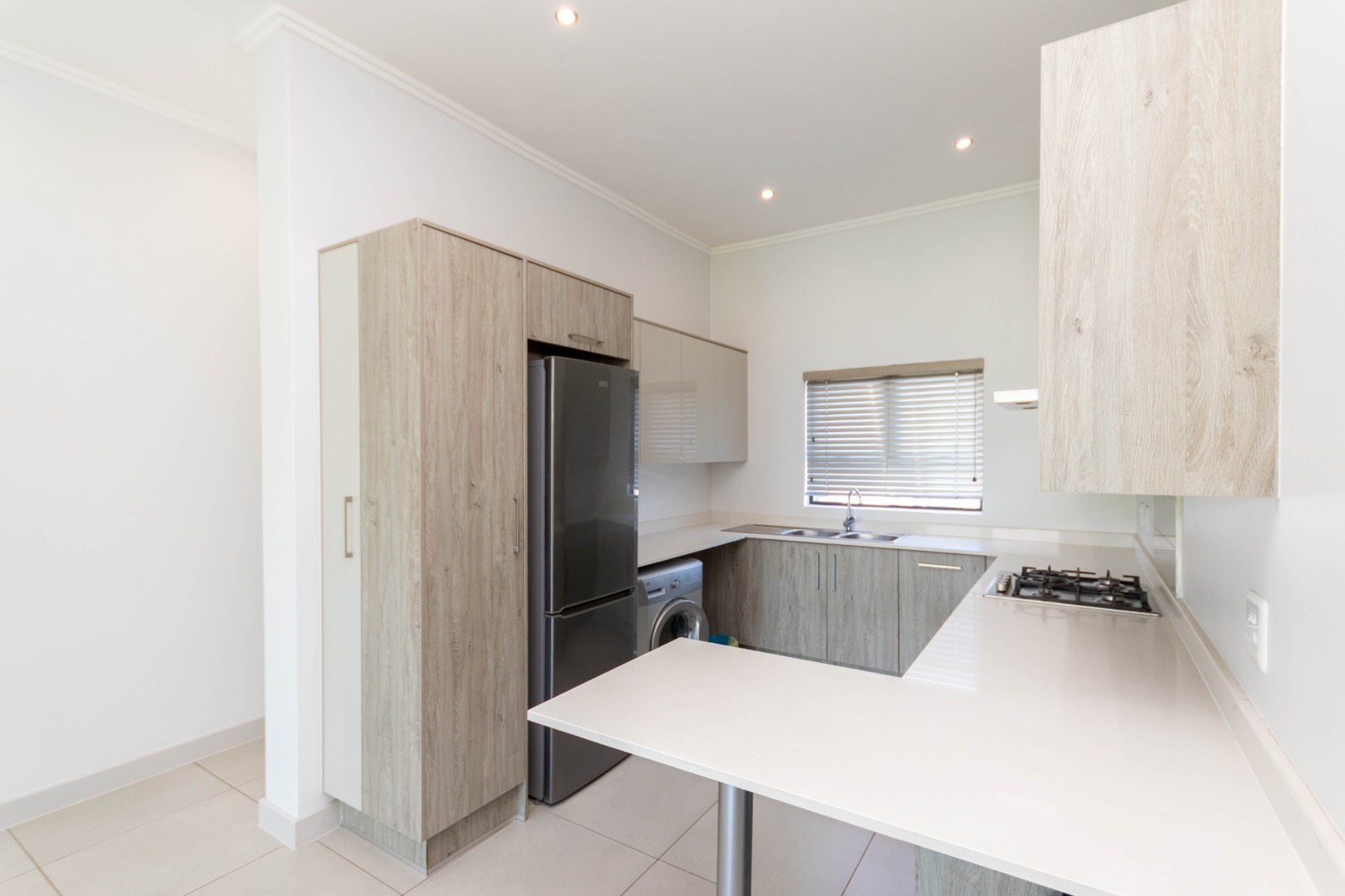 Discover modern living in this inviting 3-bedroom, 2-bathroom apartment, spanning 103 sqm, located in the desirable Broadacres. This contemporary residence boasts an open-plan layout, seamlessly connecting the living areas. The stylish kitchen features light wood-grain and grey cabinetry, a gas hob, and an oven, complemented by a breakfast bar, a large fridge and washing machine. Tiled flooring and recessed lighting enhance the modern aesthetic throughout the main living space.