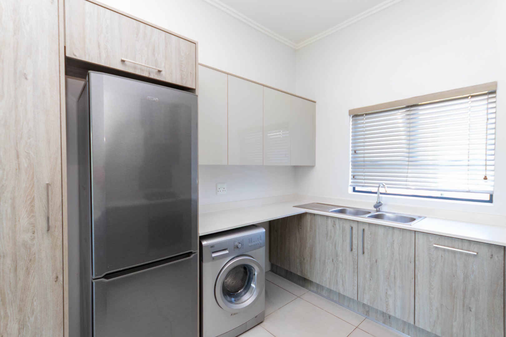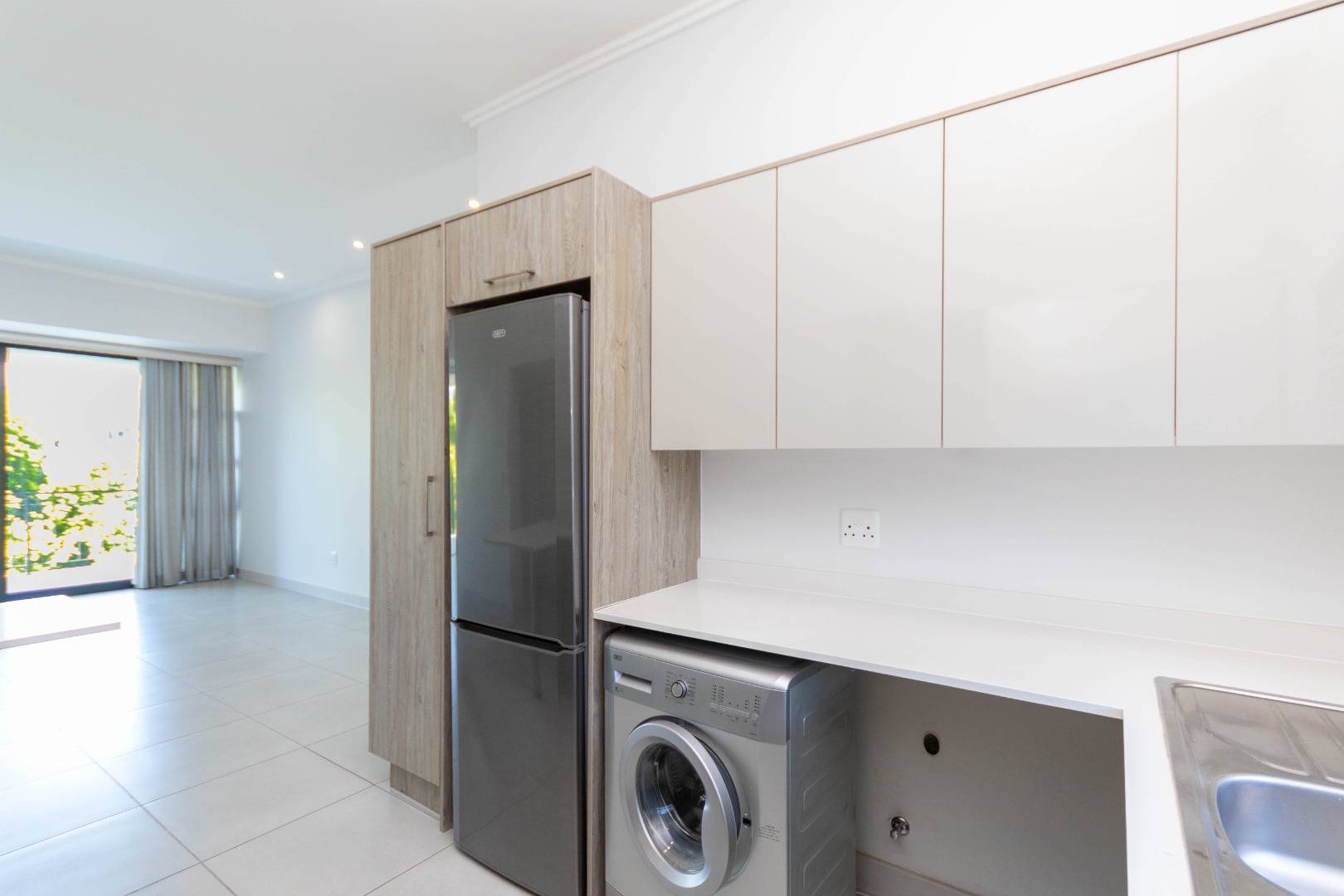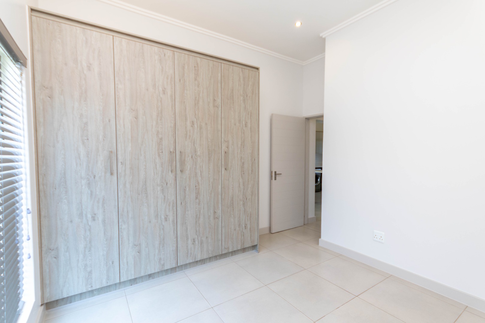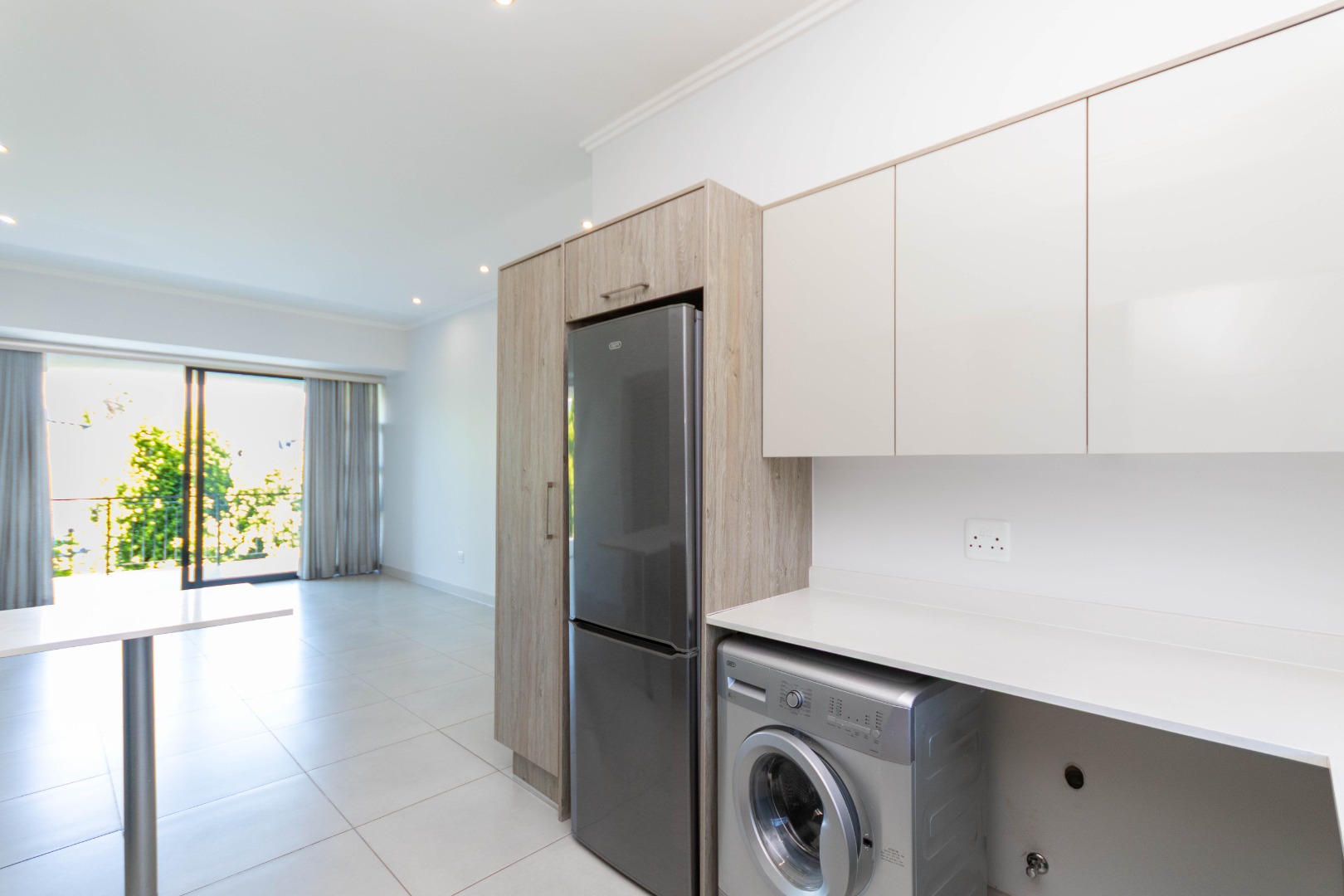 Discover modern living in this inviting 3-bedroom, 2-bathroom apartment, spanning 103 sqm, located in the desirable Broadacres. This contemporary residence boasts an open-plan layout, seamlessly connecting the living areas. The stylish kitchen features light wood-grain and grey cabinetry, a gas hob, and an oven, complemented by a breakfast bar, a large fridge and washing machine. Tiled flooring and recessed lighting enhance the modern aesthetic throughout the main living space.