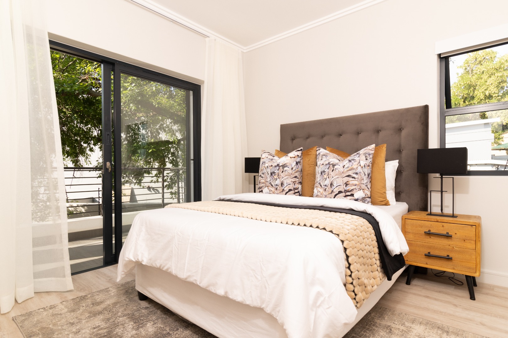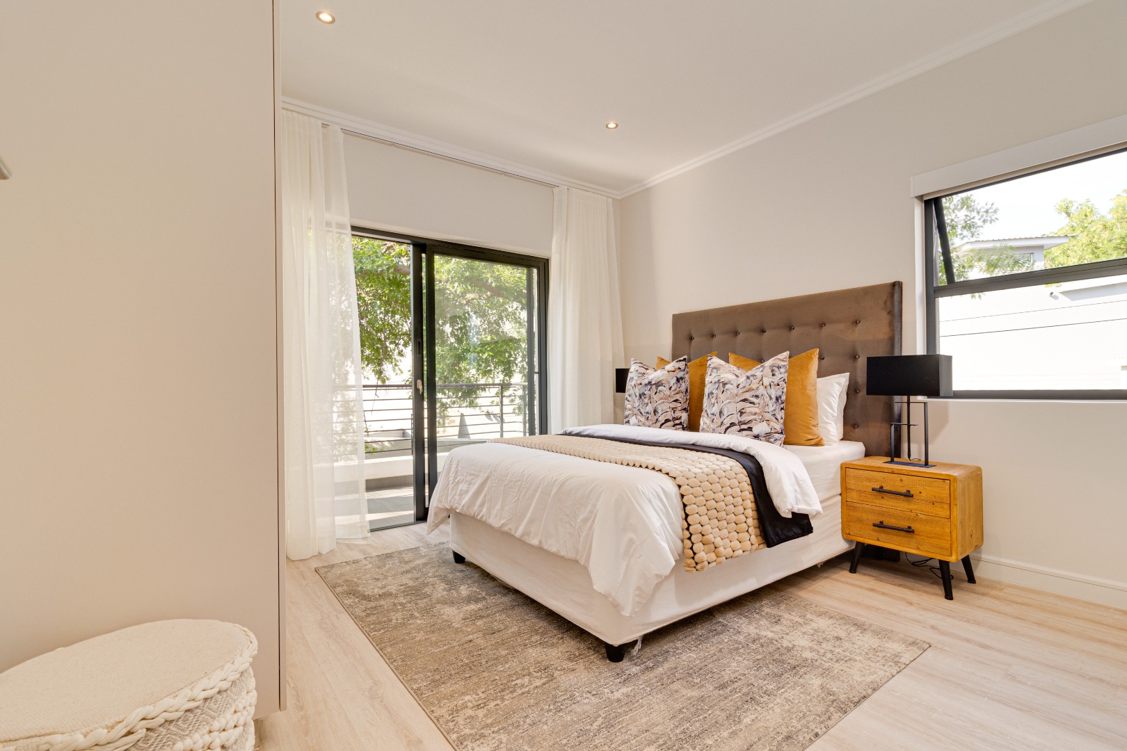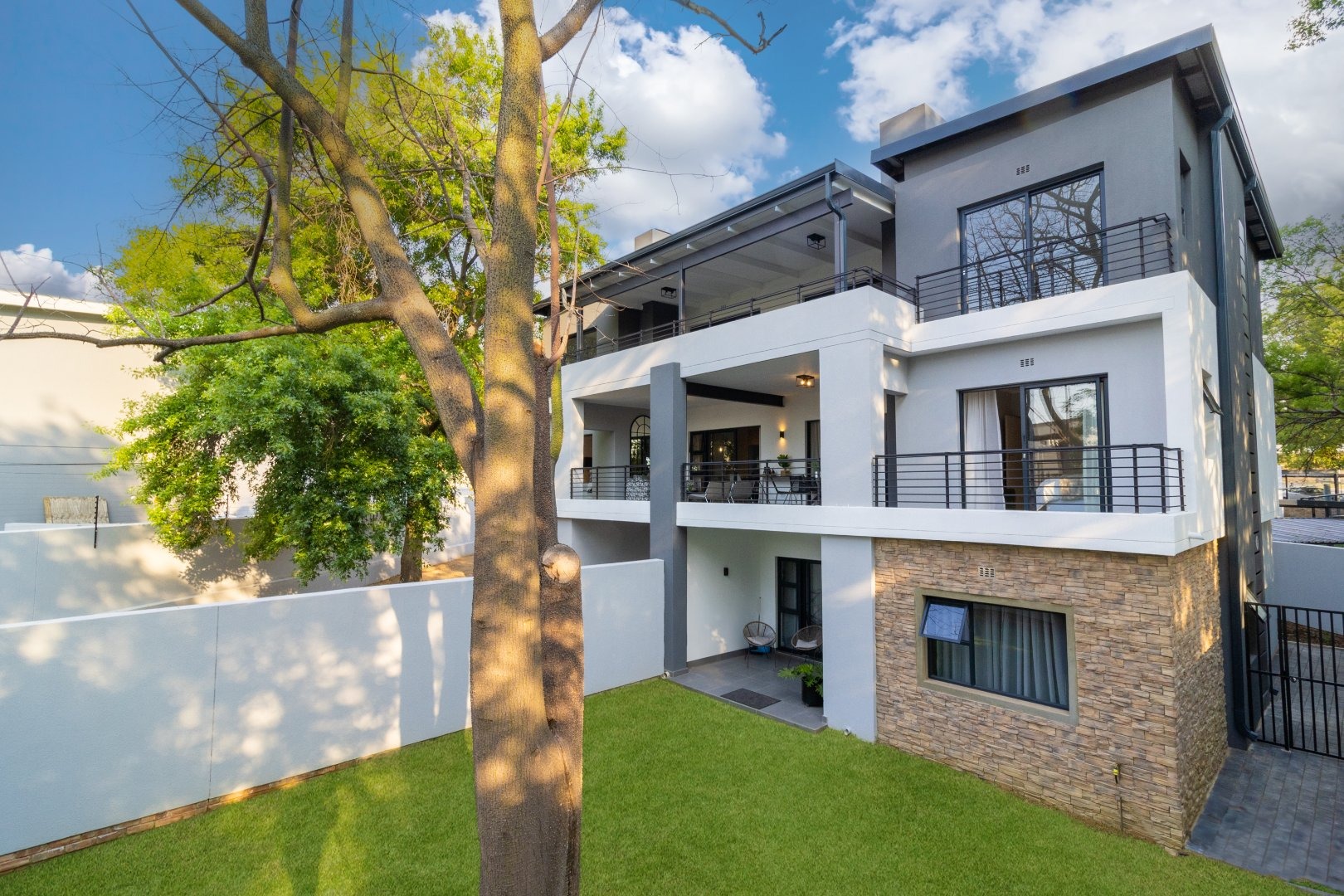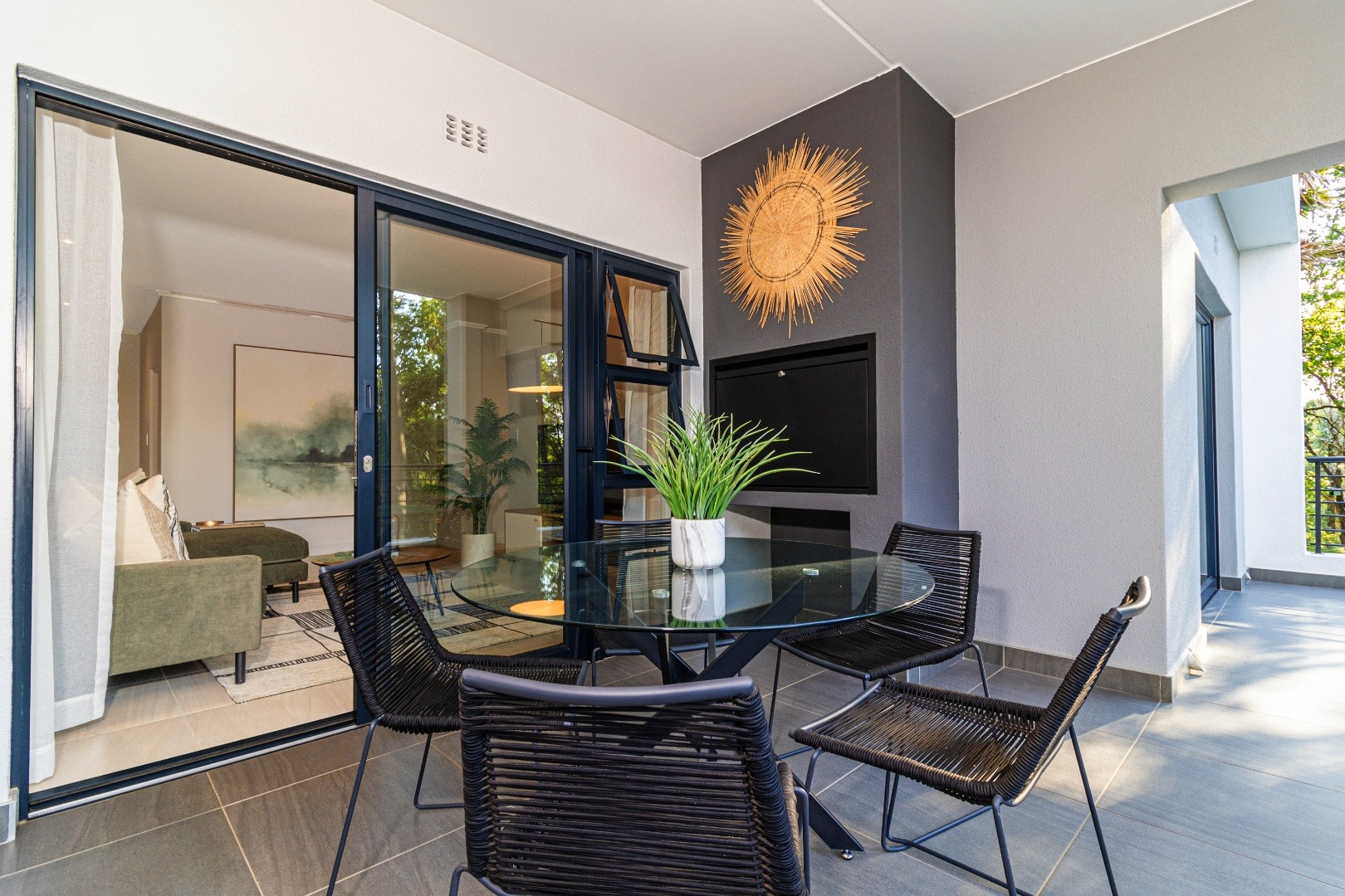 Apartment 22 , comprises three comfortable bedrooms and two bathrooms, including two ensuites, ensuring privacy and convenience. The design prioritizes a clean and contemporary feel in all private spaces. Outdoor living is a highlight, with multiple balconies and a spacious patio perfect for entertaining. Enjoy South African outdoor gatherings with a built-in braai . The property also includes a double, automated garage.