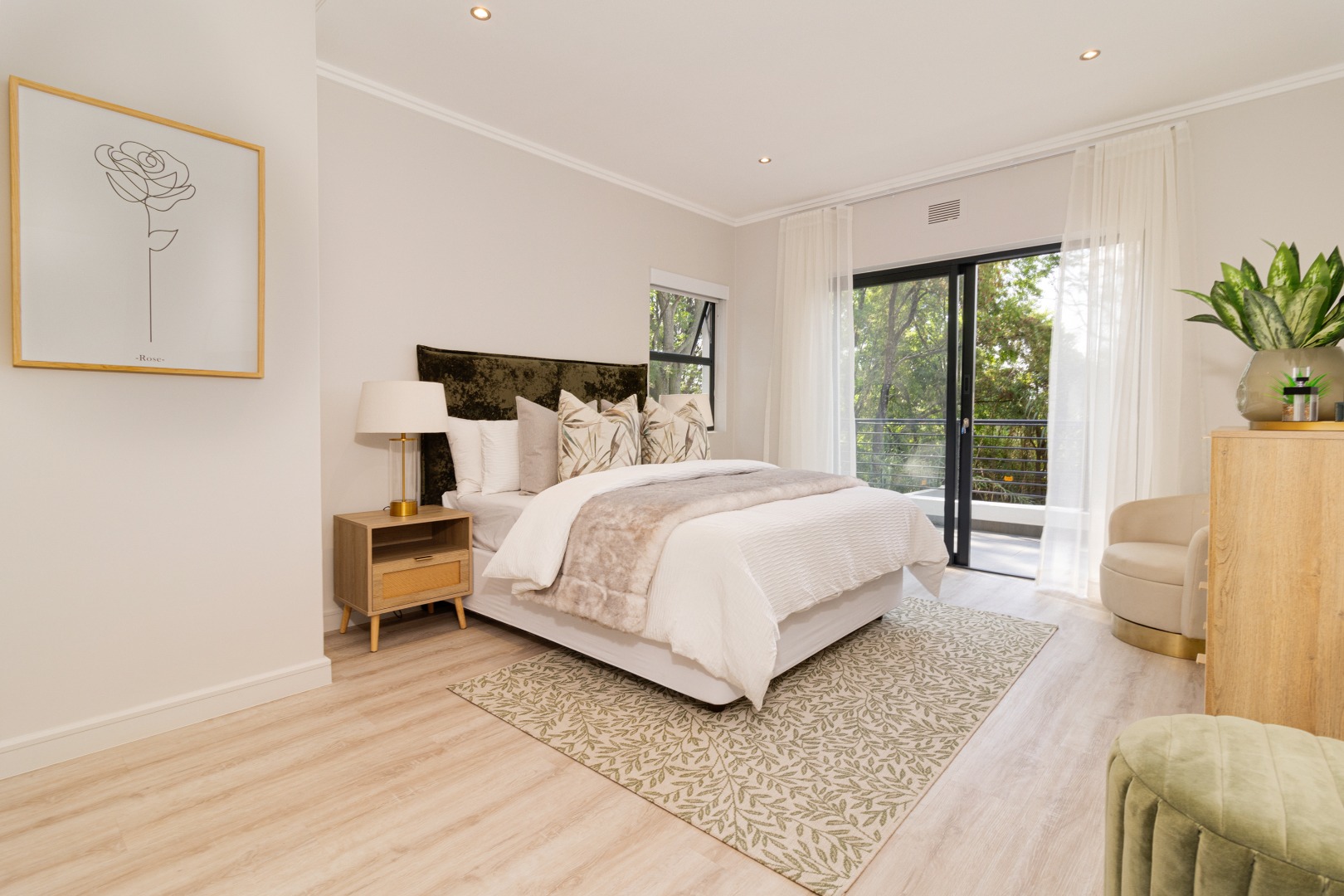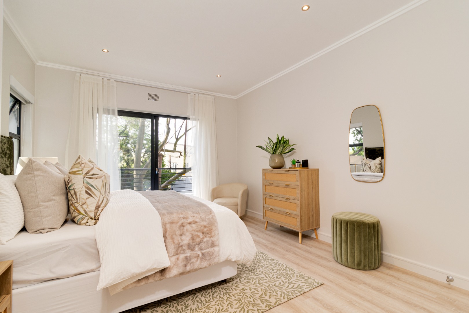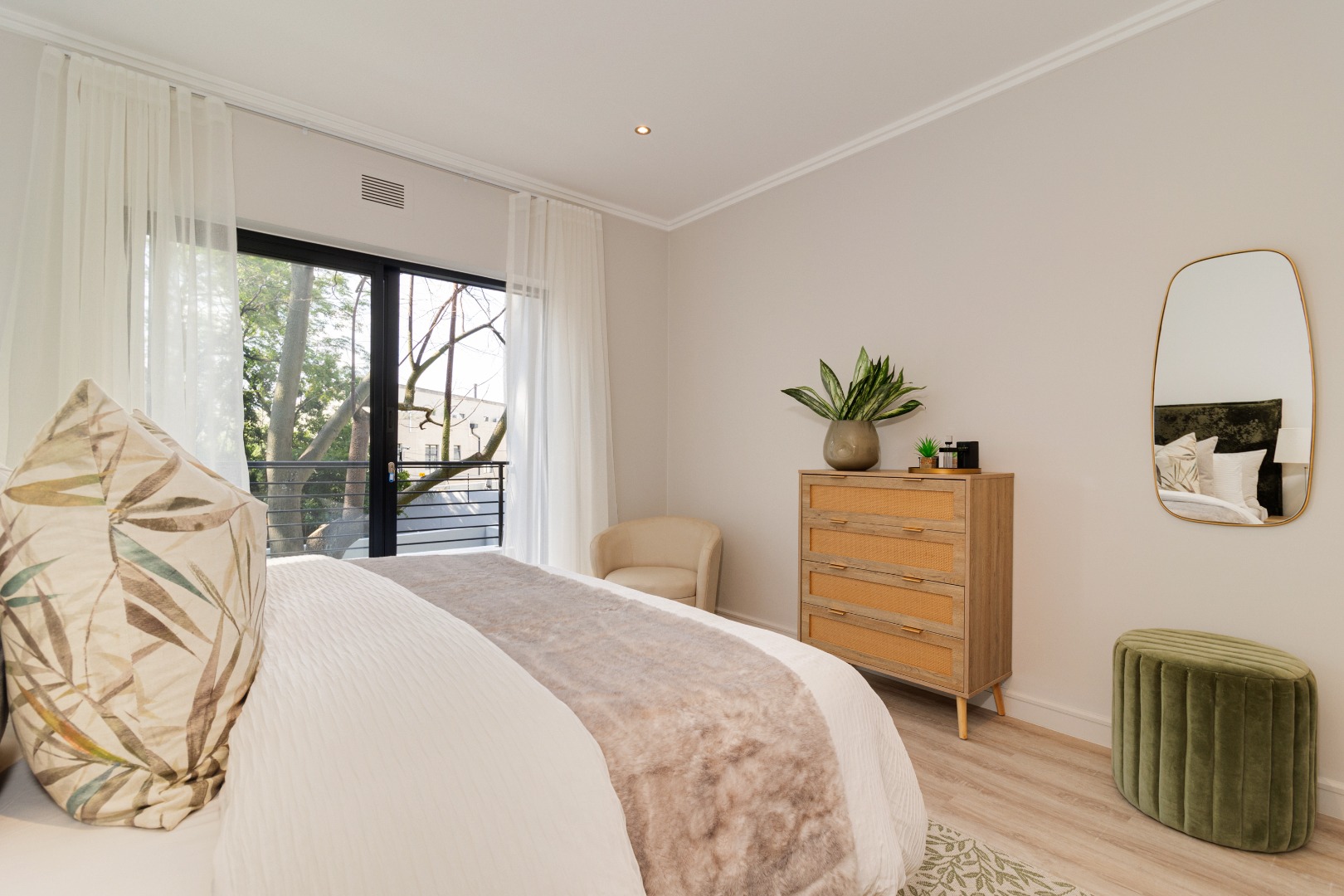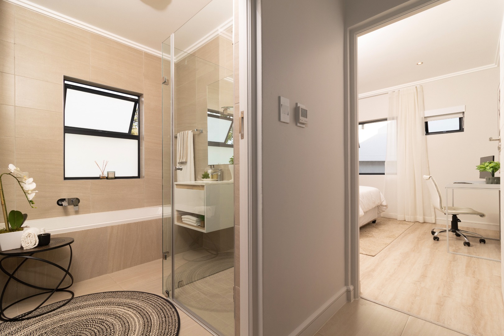 Apartment 22 , comprises three comfortable bedrooms and two bathrooms, including two ensuites, ensuring privacy and convenience. The design prioritizes a clean and contemporary feel in all private spaces. Outdoor living is a highlight, with multiple balconies and a spacious patio perfect for entertaining. Enjoy South African outdoor gatherings with a built-in braai . The property also includes a double, automated garage.