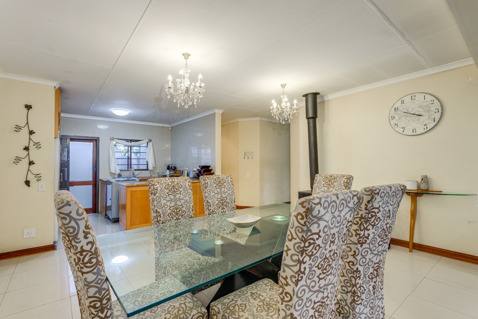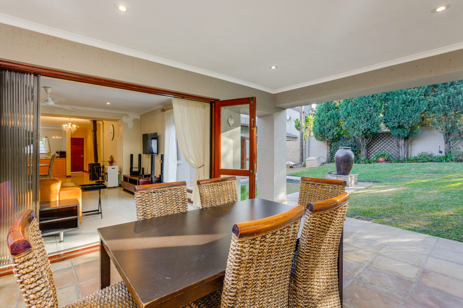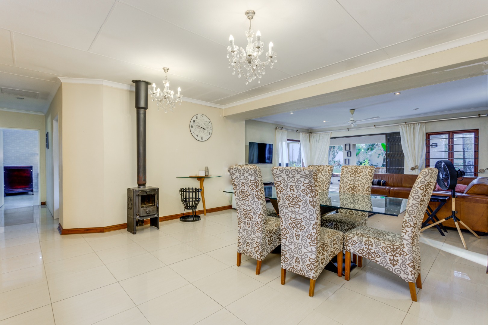 The open-plan lounge, dining, and kitchen area create a spacious, flowing environment for family life and entertaining. The large lounge opens through sliding glass doors onto a covered patio overlooking the expansive garden and pool — ideal for braais, children’s playtime, and quality family moments. A cozy wood-fired fireplace in the lounge and dining area adds