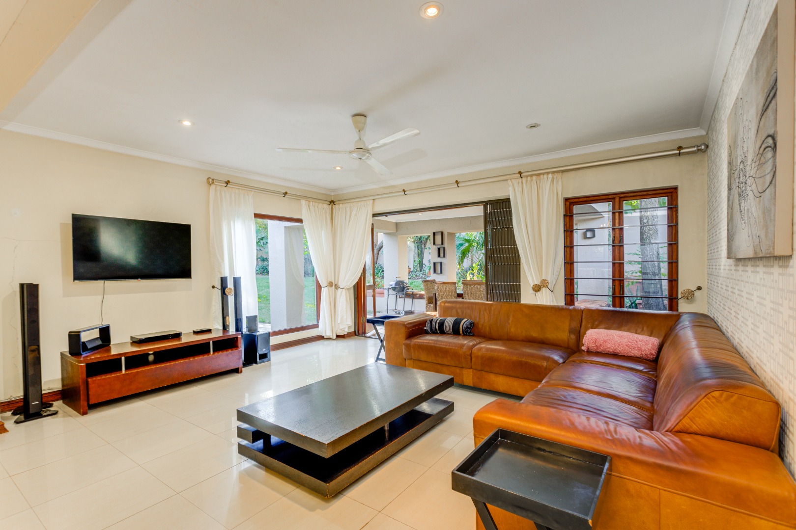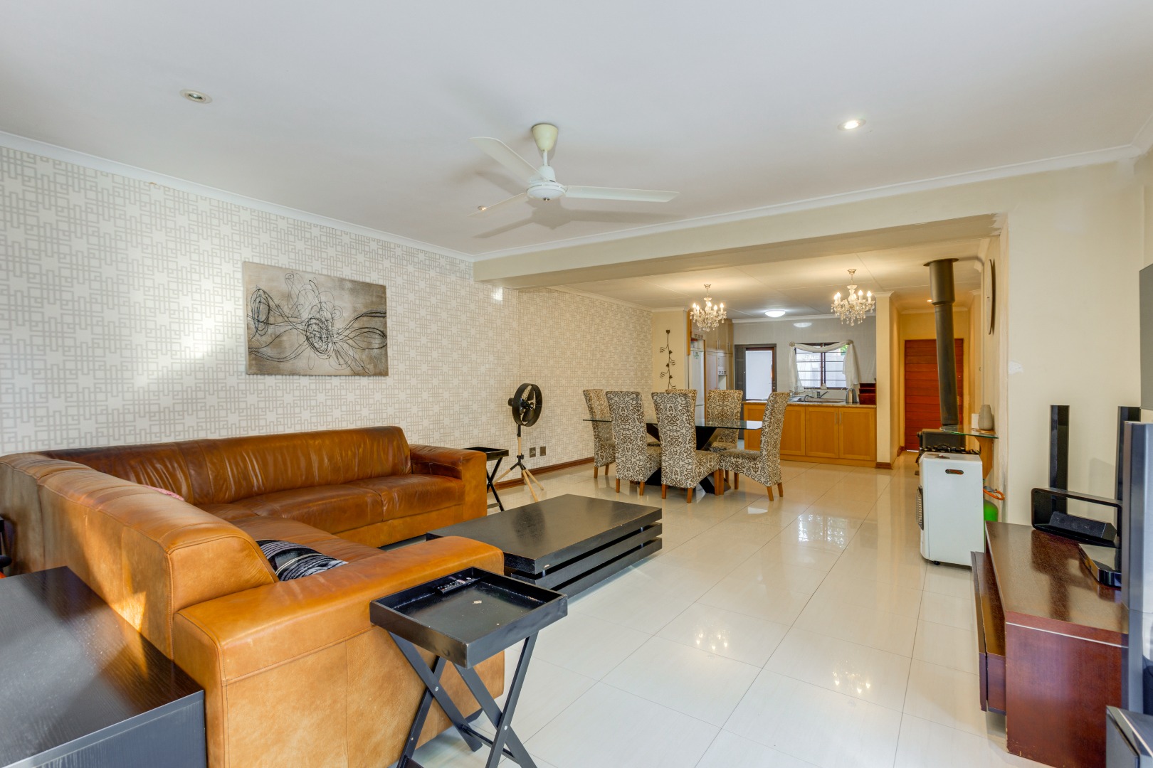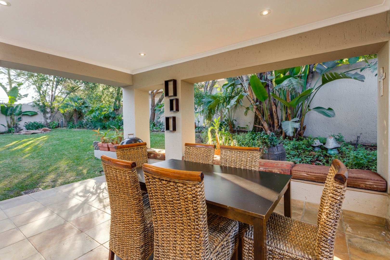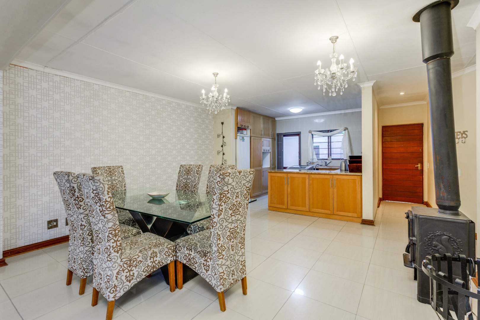 The open-plan lounge, dining, and kitchen area create a spacious, flowing environment for family life and entertaining. The large lounge opens through sliding glass doors onto a covered patio overlooking the expansive garden and pool — ideal for braais, children’s playtime, and quality family moments. A cozy wood-fired fireplace in the lounge and dining area adds