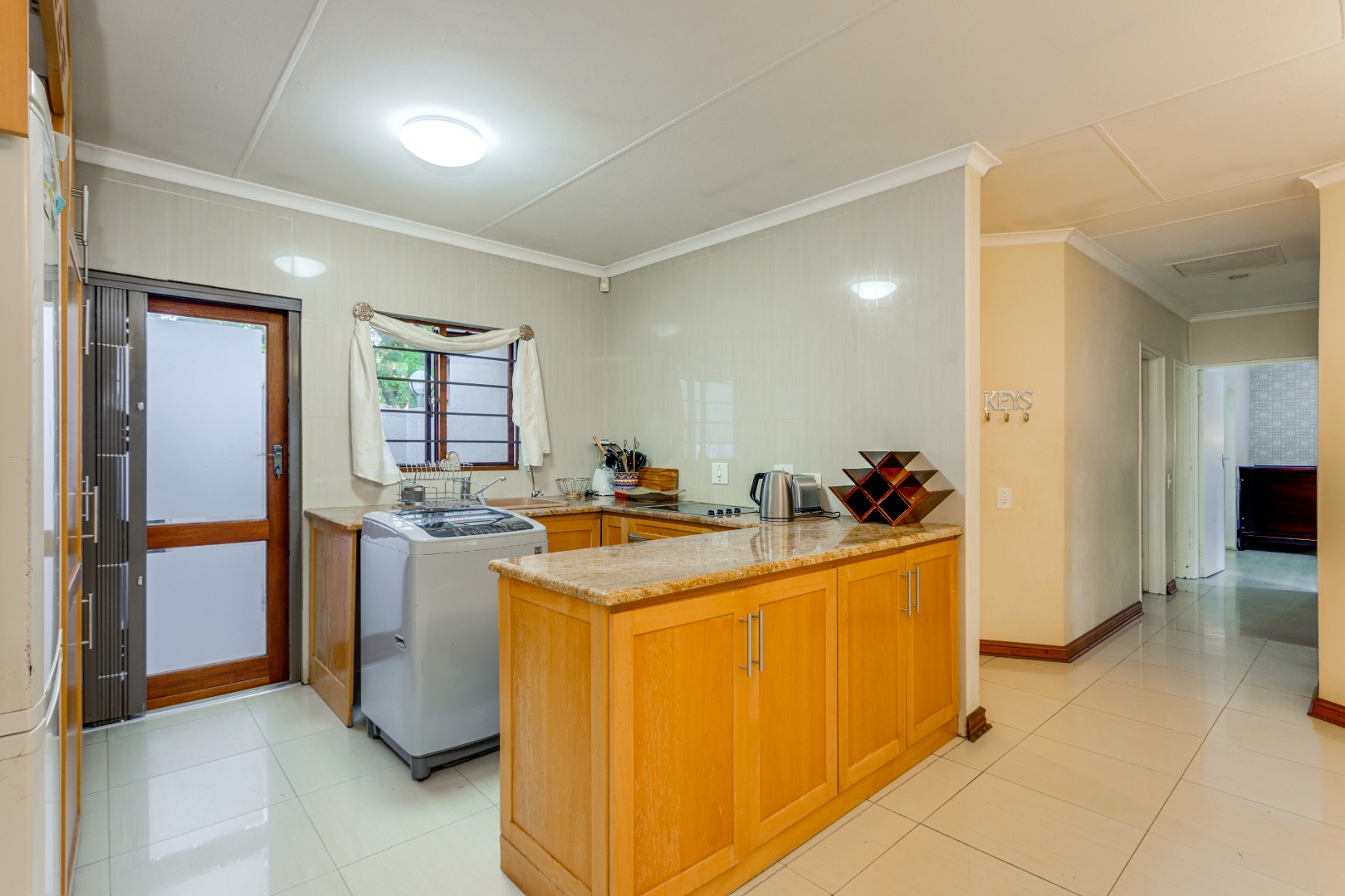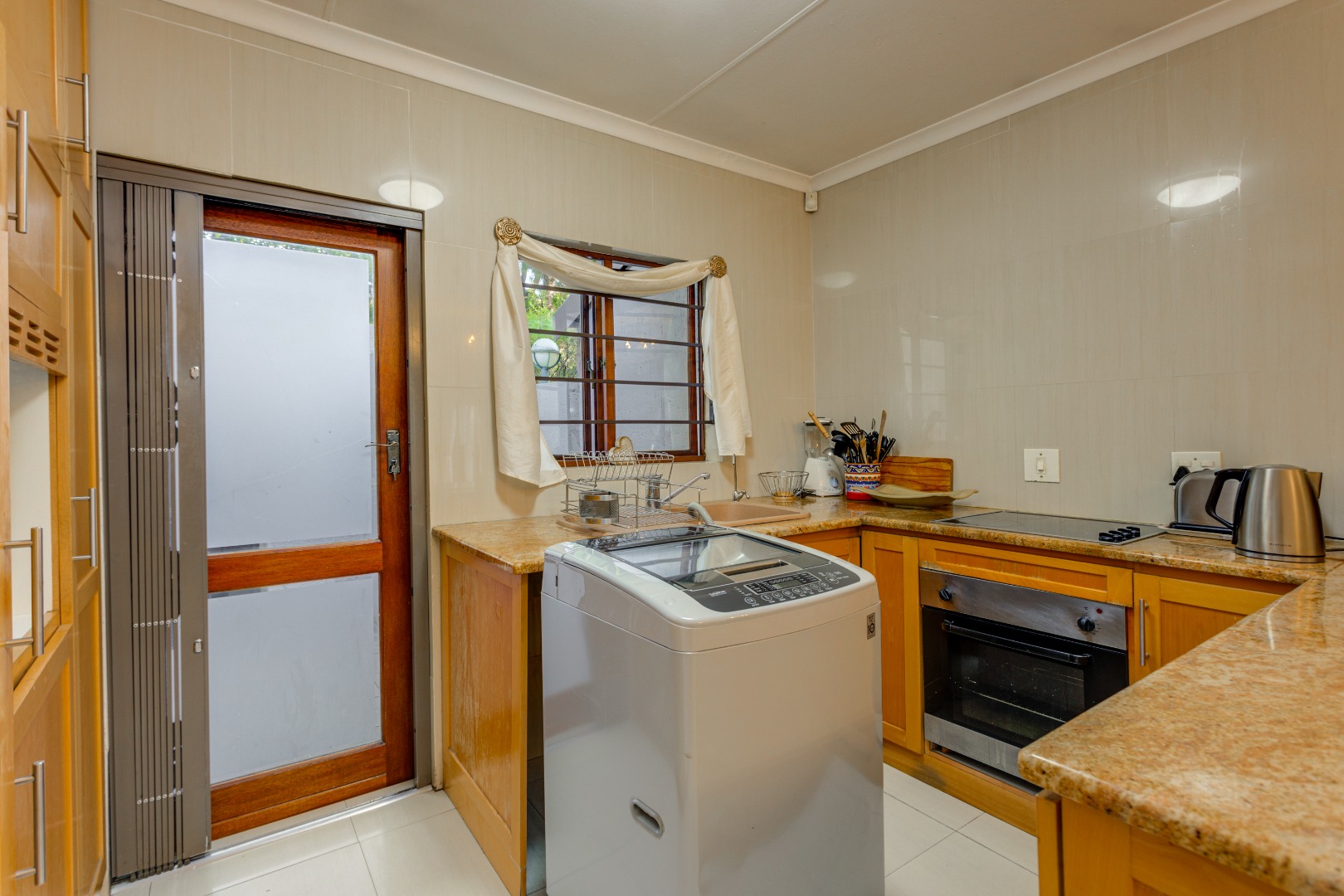 The kitchen boasts beautiful brown granite countertops, plenty of cupboard space, and a convenient spot for your washing machine under extra storage.