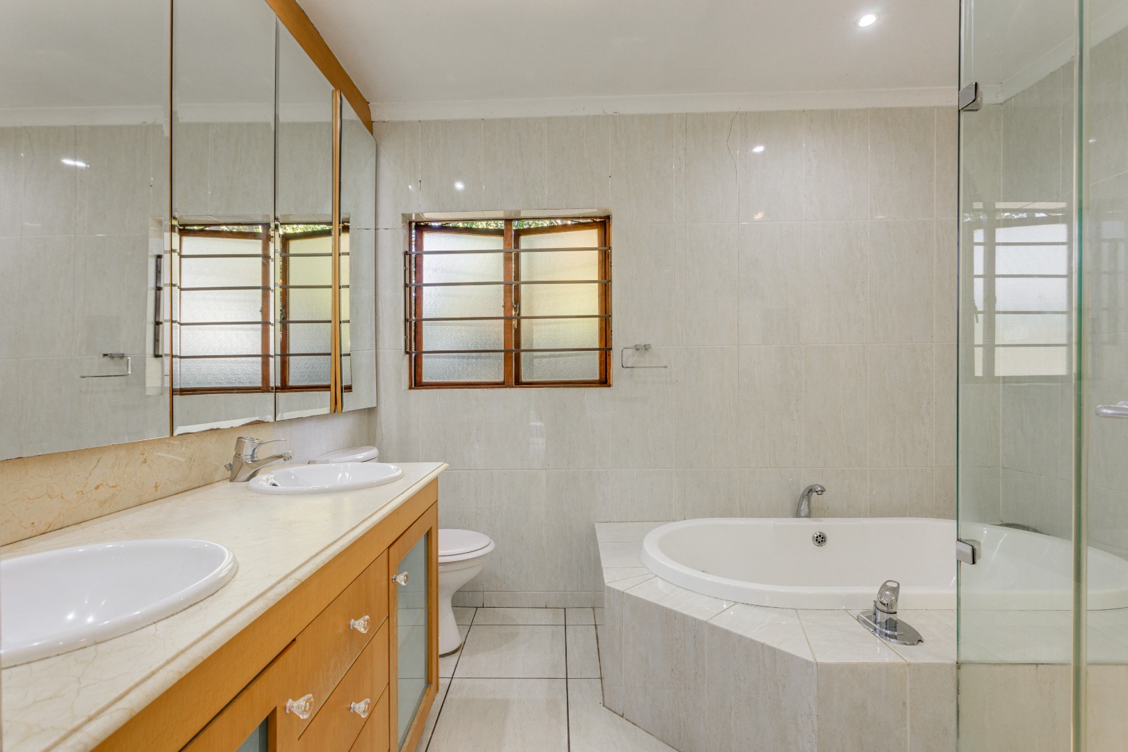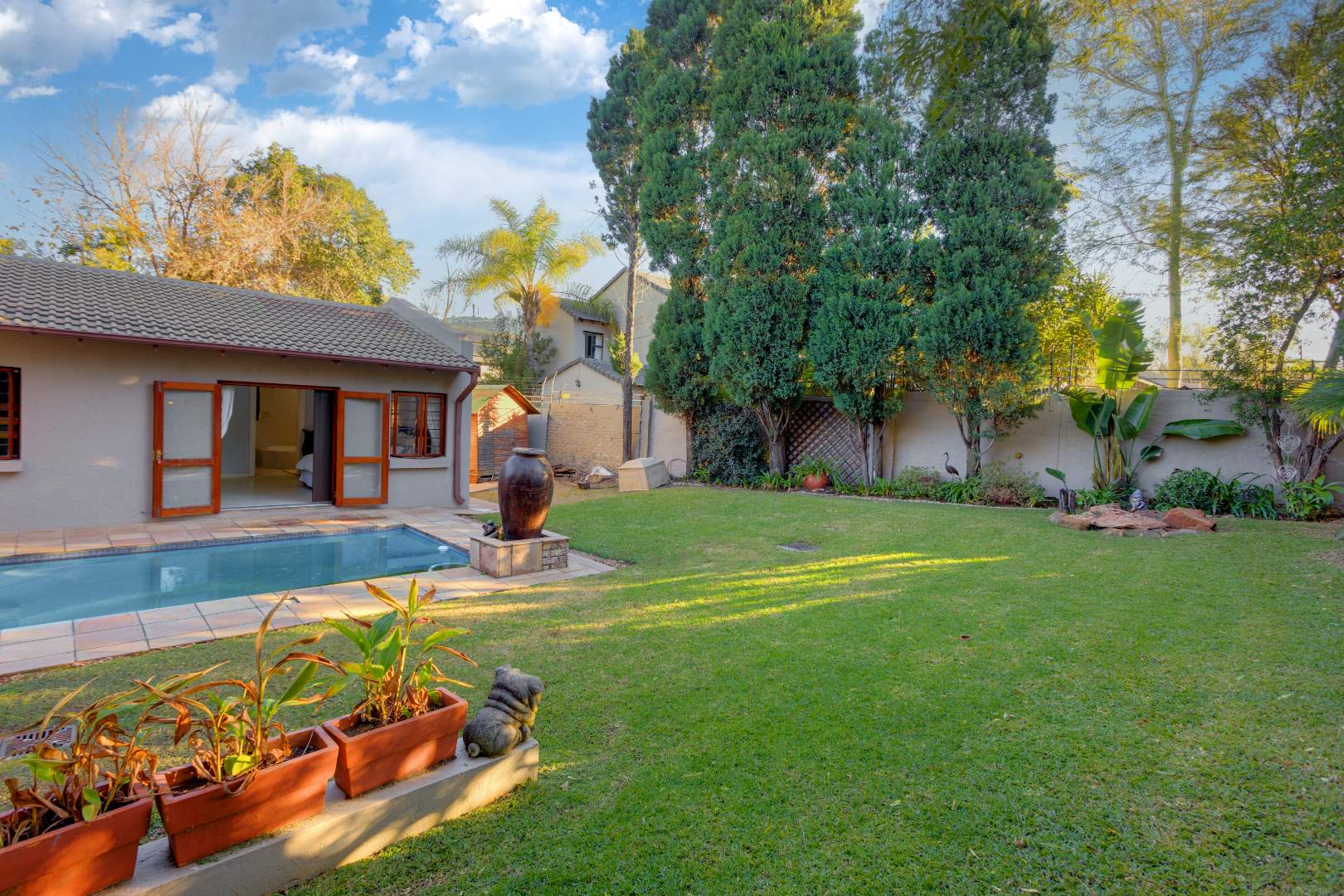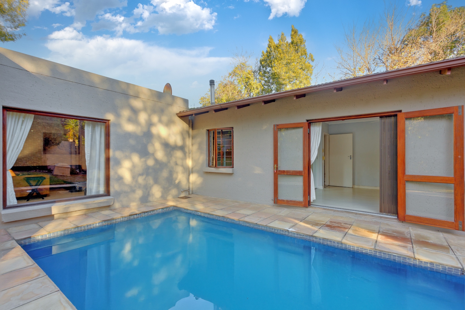 Step inside to discover three comfortable bedrooms designed with family living in mind. The spacious main bedroom features floor-to-ceiling wood and glass sliding doors that open directly onto a private patio beside the sparkling swimming pool — a perfect spot for morning coffees or relaxing evenings. Ample storage is provided by a full wall of cupboards, and the ensuite bathroom pampers you with double vanities, a large bathtub, and a separate shower.