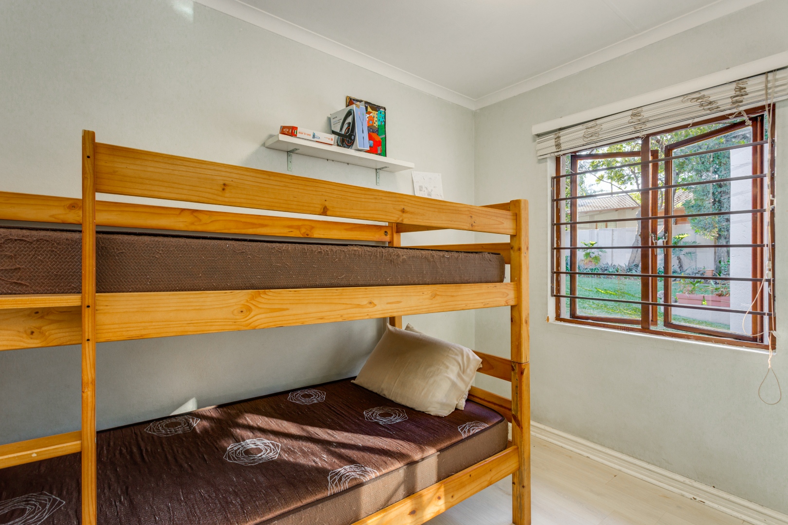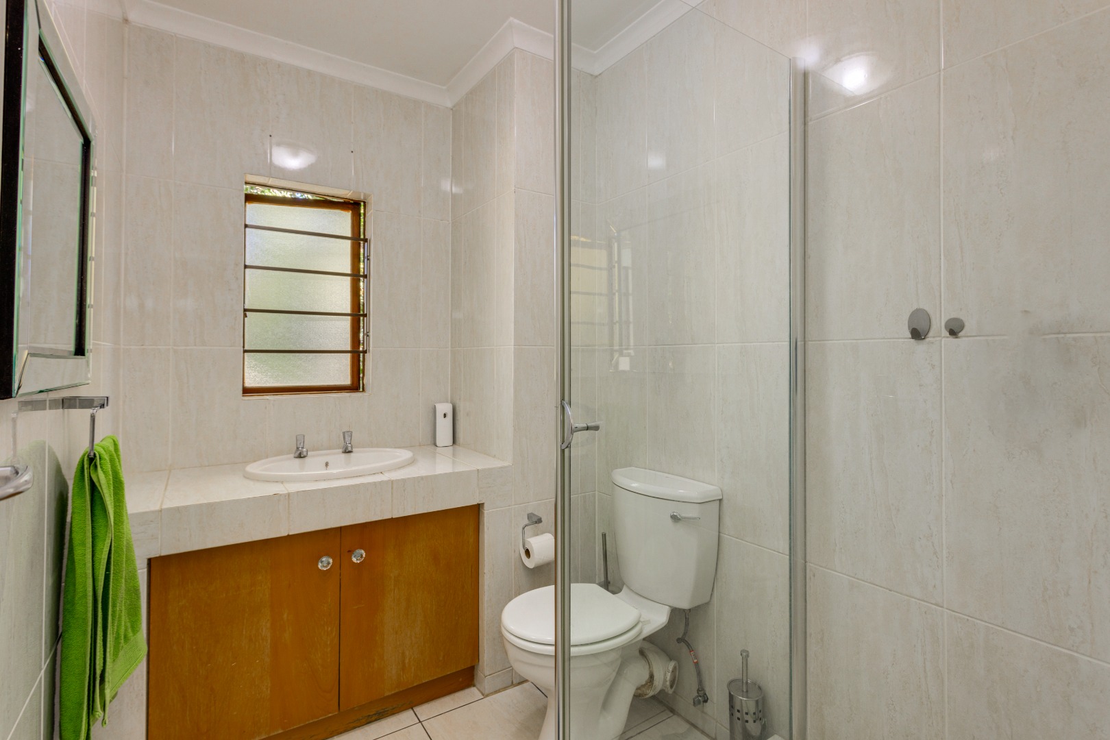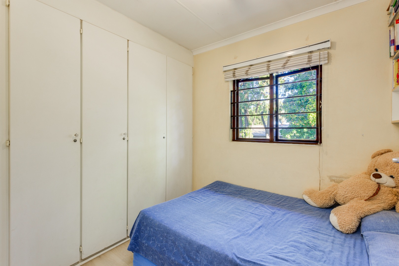 Bedrooms two and three also offer generous floor-to-ceiling cupboard space, with the third bedroom being perfect for a nursery, study, or guest room. These bedrooms share a well-appointed bathroom with a shower, toilet, and single wash hand basin.