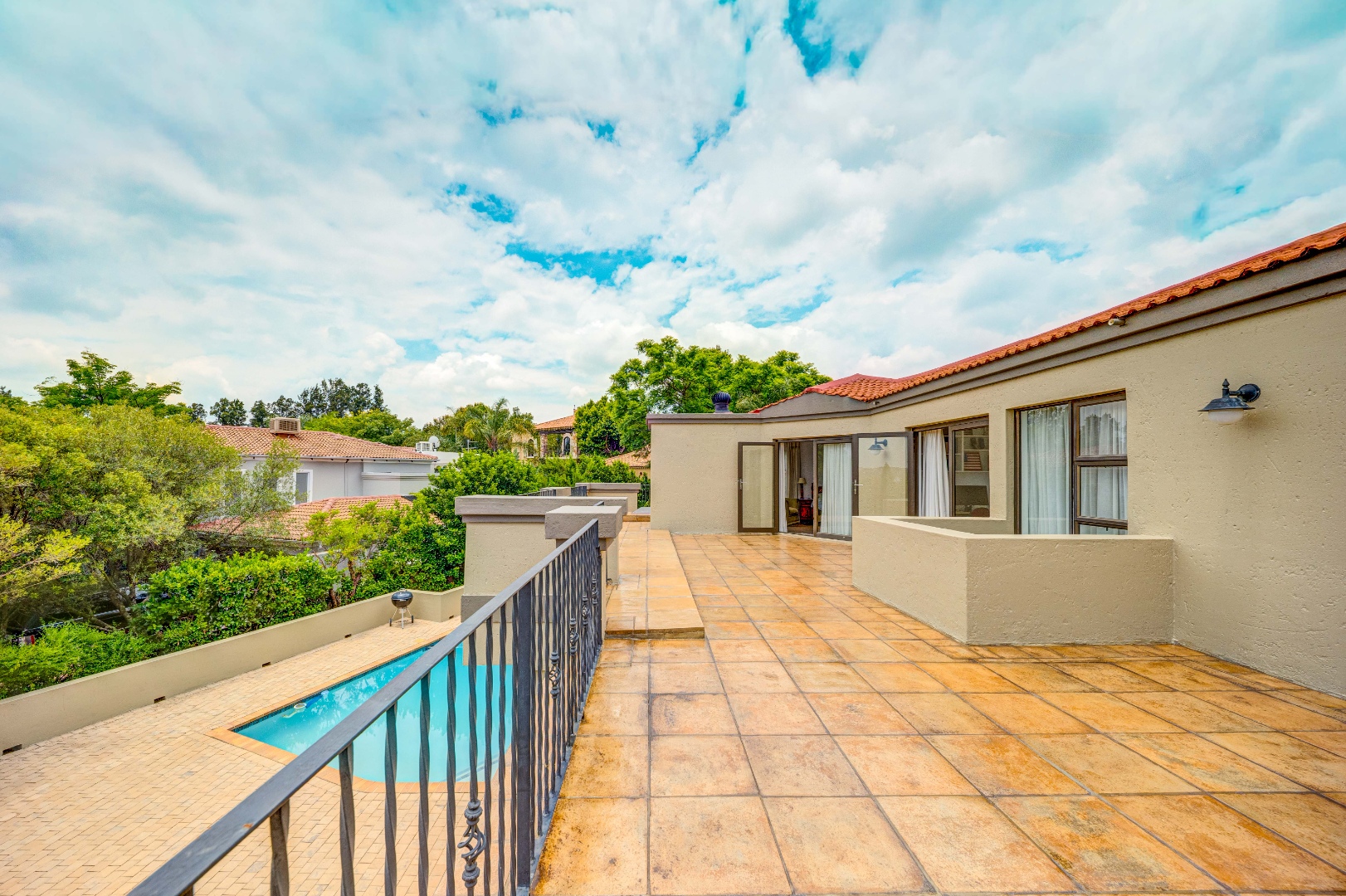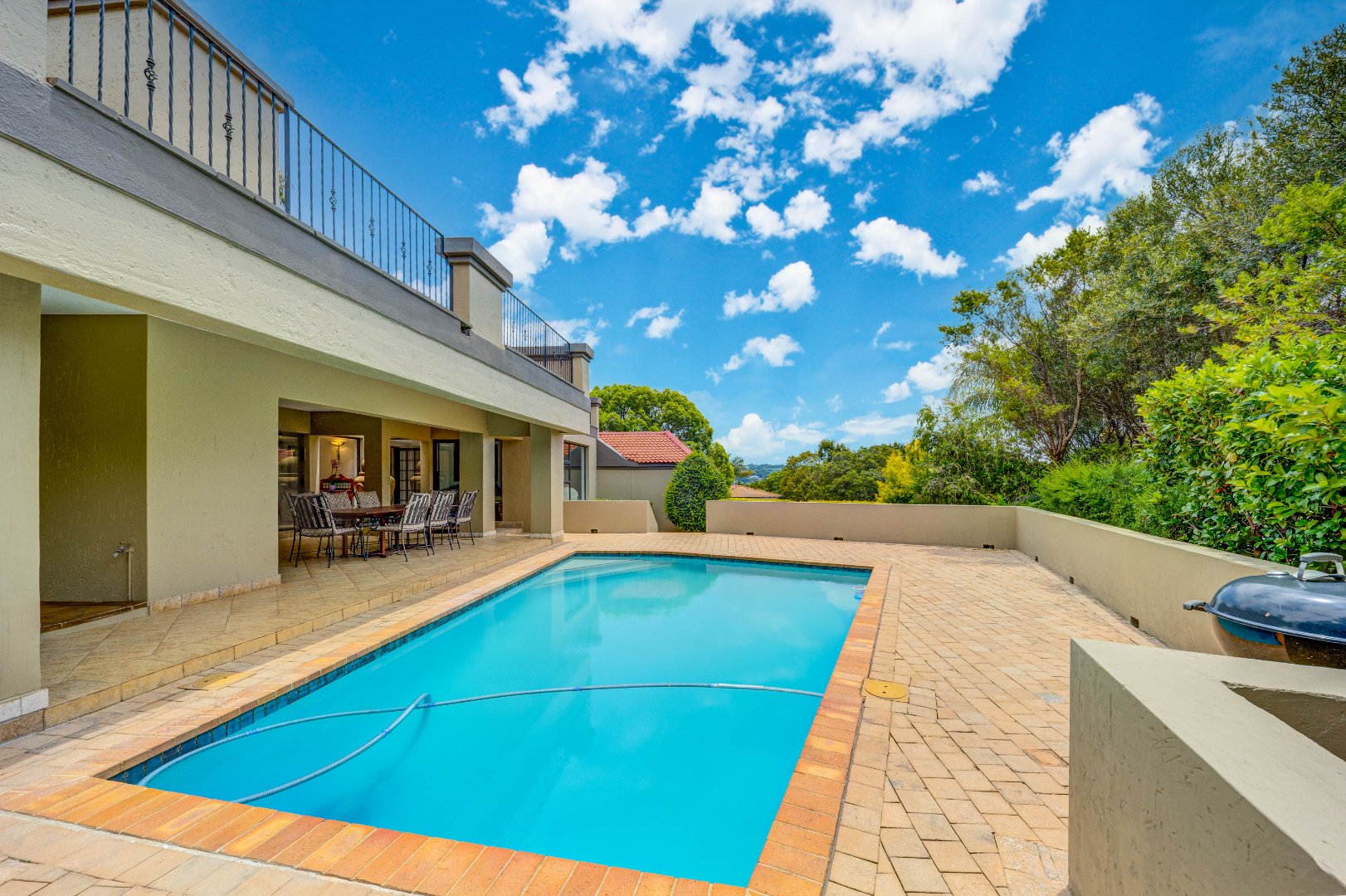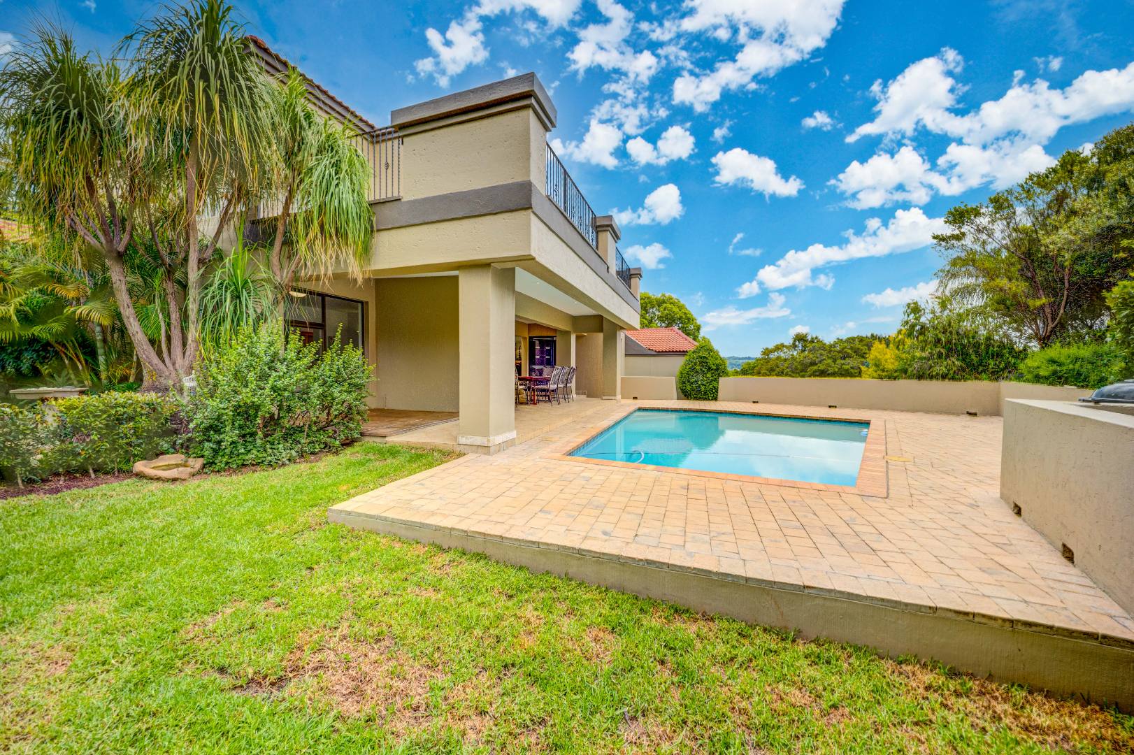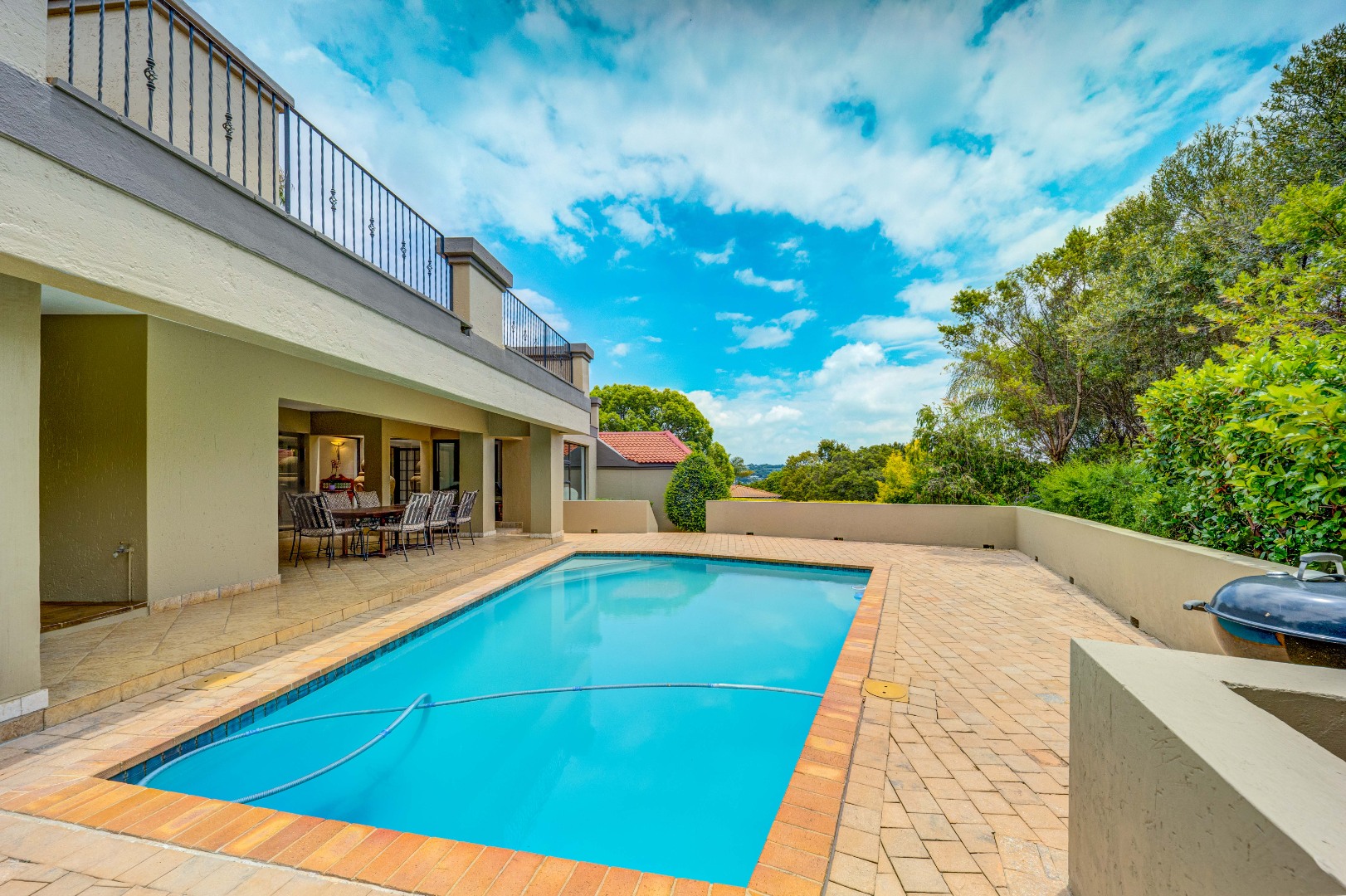 outdoor space, overlooking a good-sized swimming pool and a beautifully