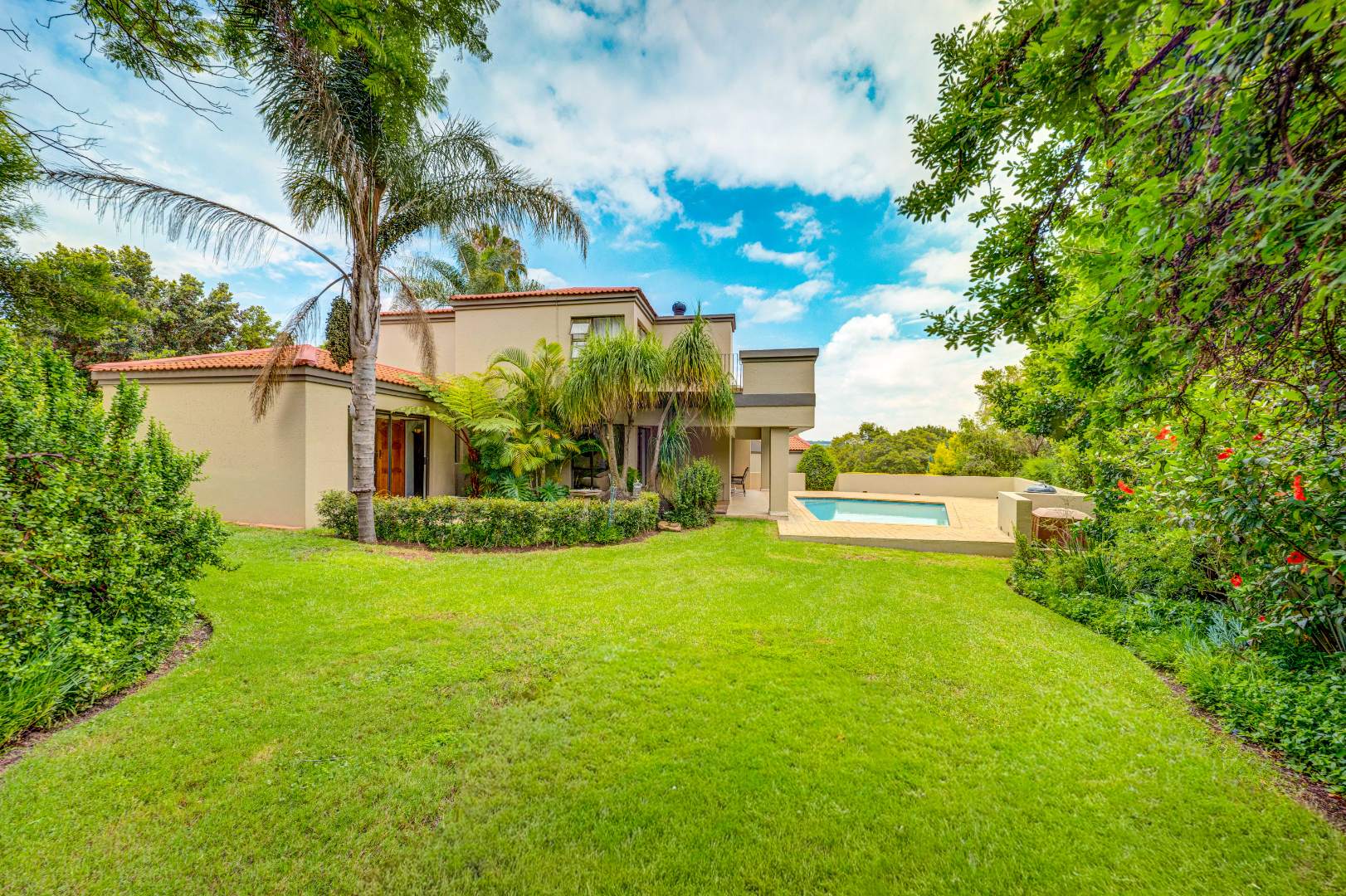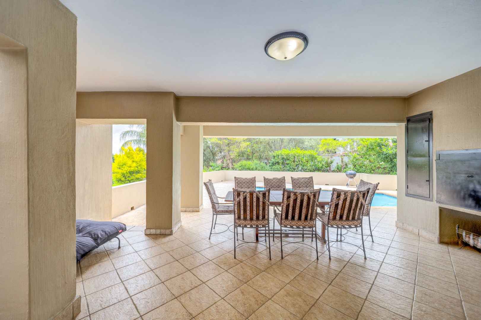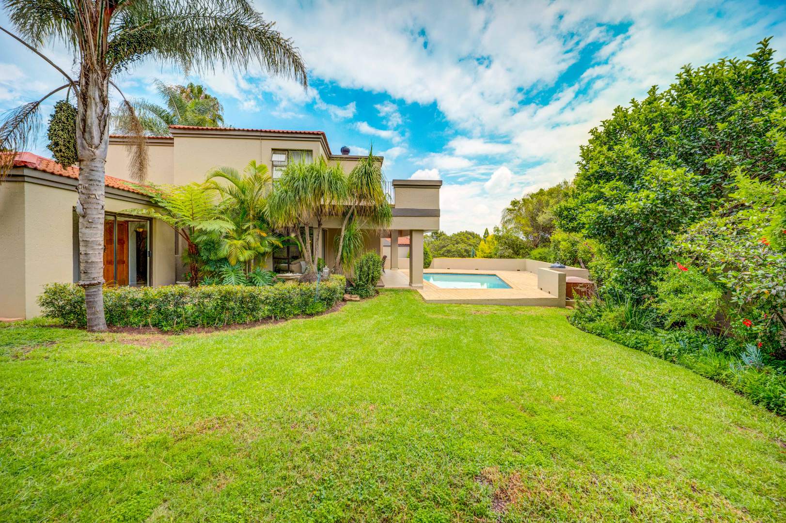 outdoor space, overlooking a good-sized swimming pool and a beautifully