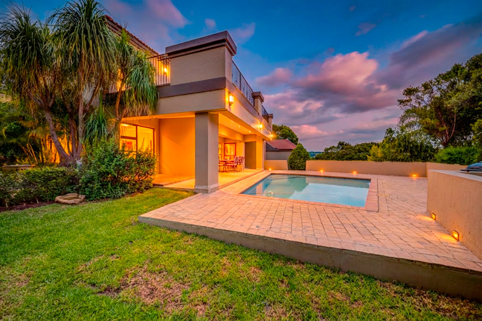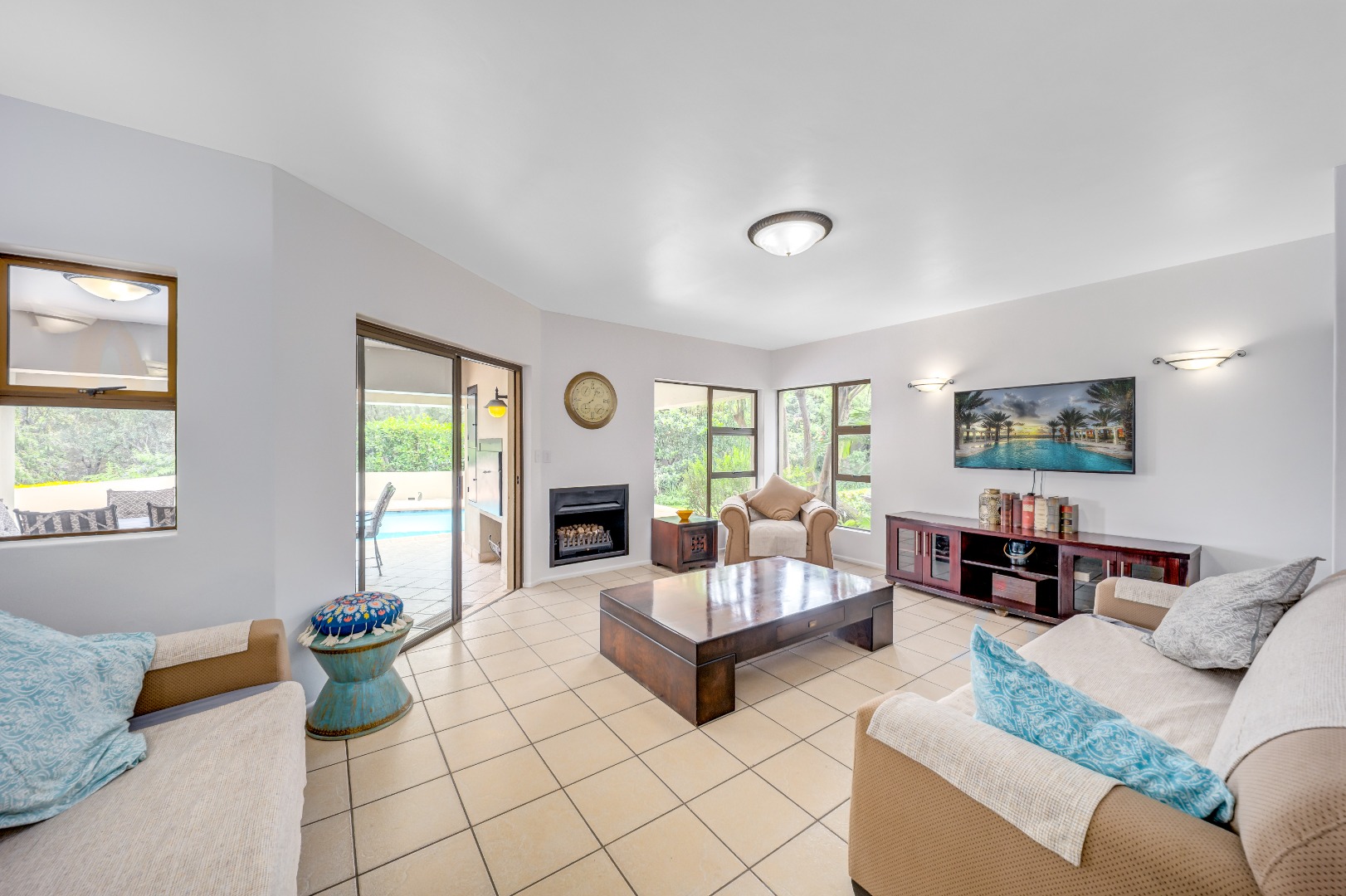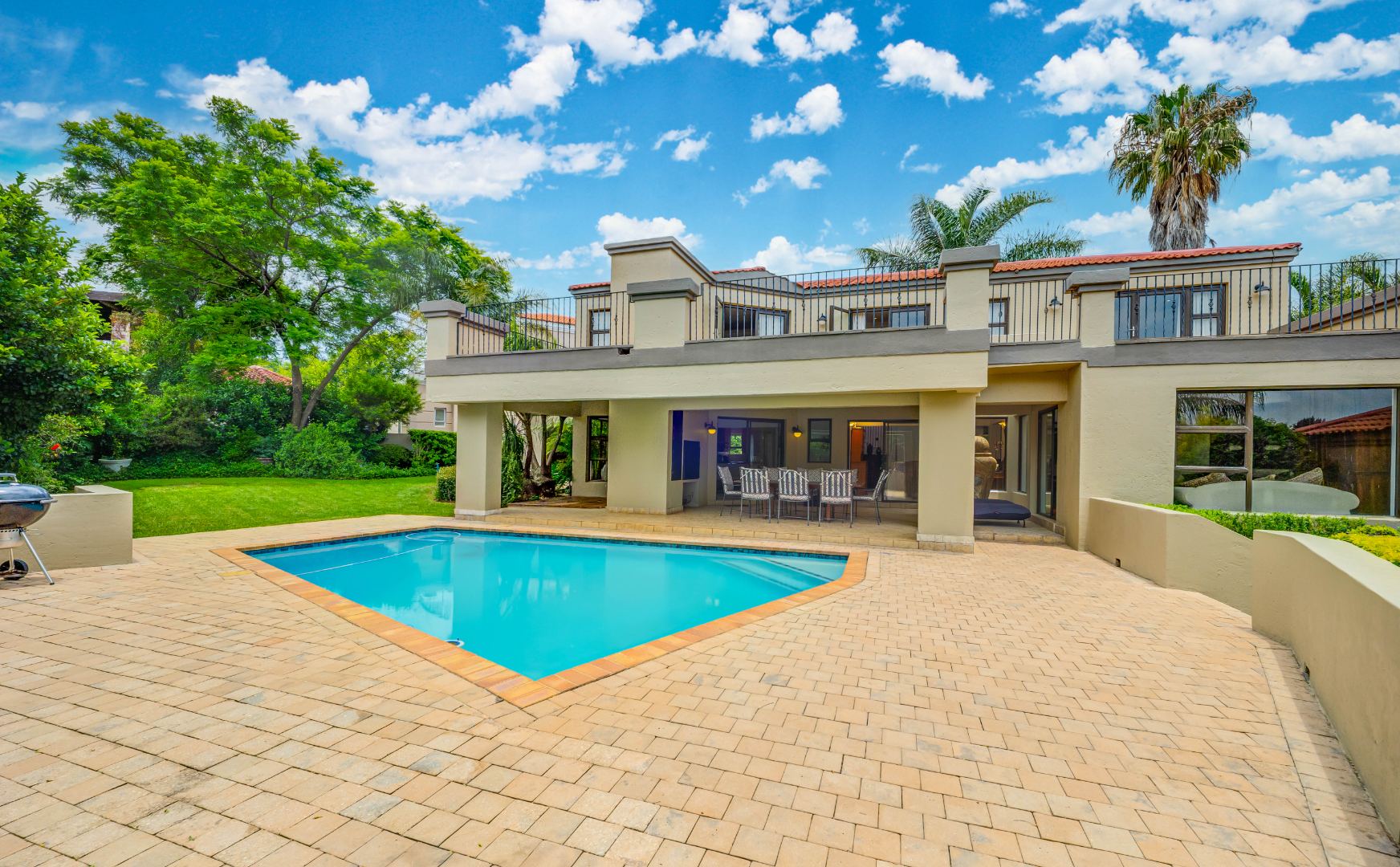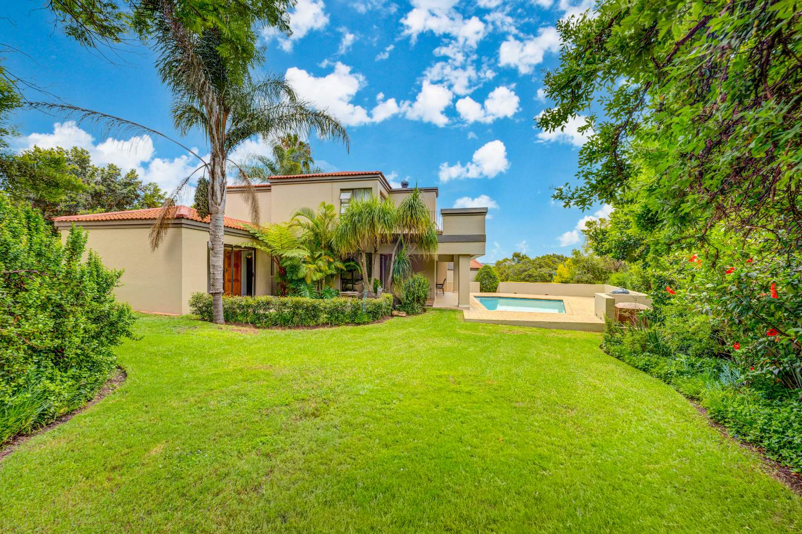 outdoor space, overlooking a good-sized swimming pool and a beautifully