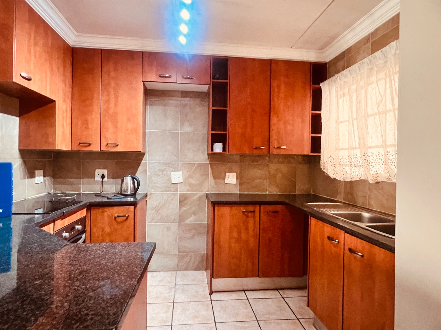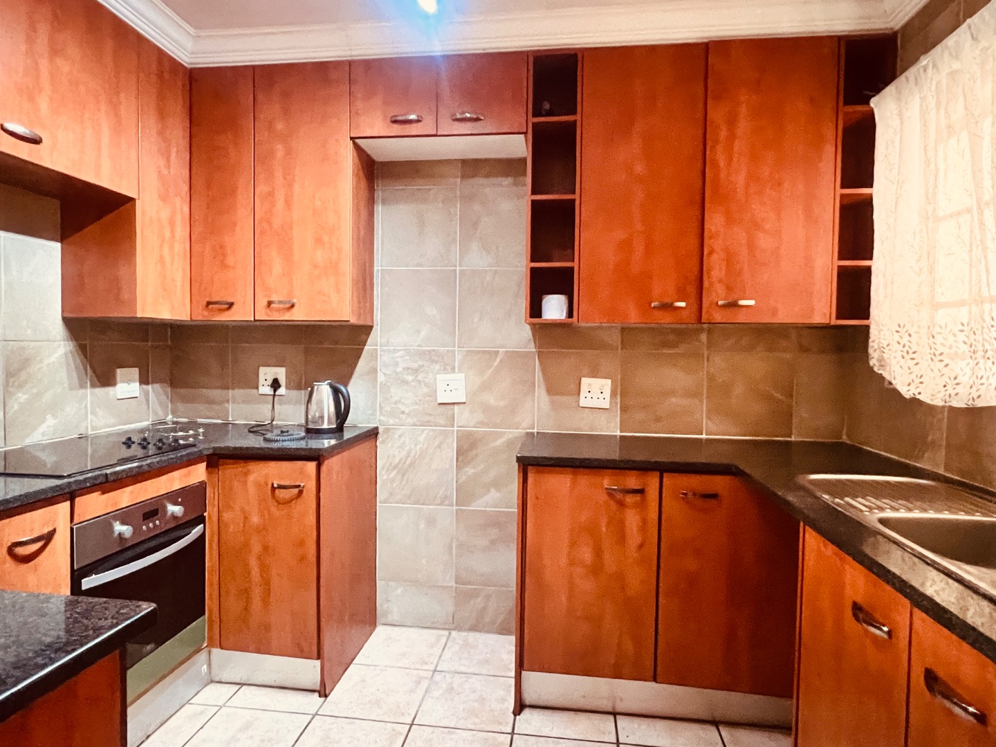 Step inside and you’ll find a bright and airy open-plan living and dining area, all decked out with clean, light-coloured tiled floors and neutral walls – super easy to decorate to your taste! The kitchen is a real winner, featuring wooden cabinets, sleek dark countertops, and an integrated hob and oven, plus plenty of storage space for all your cooking essentials. It’s designed for easy living and entertaining.