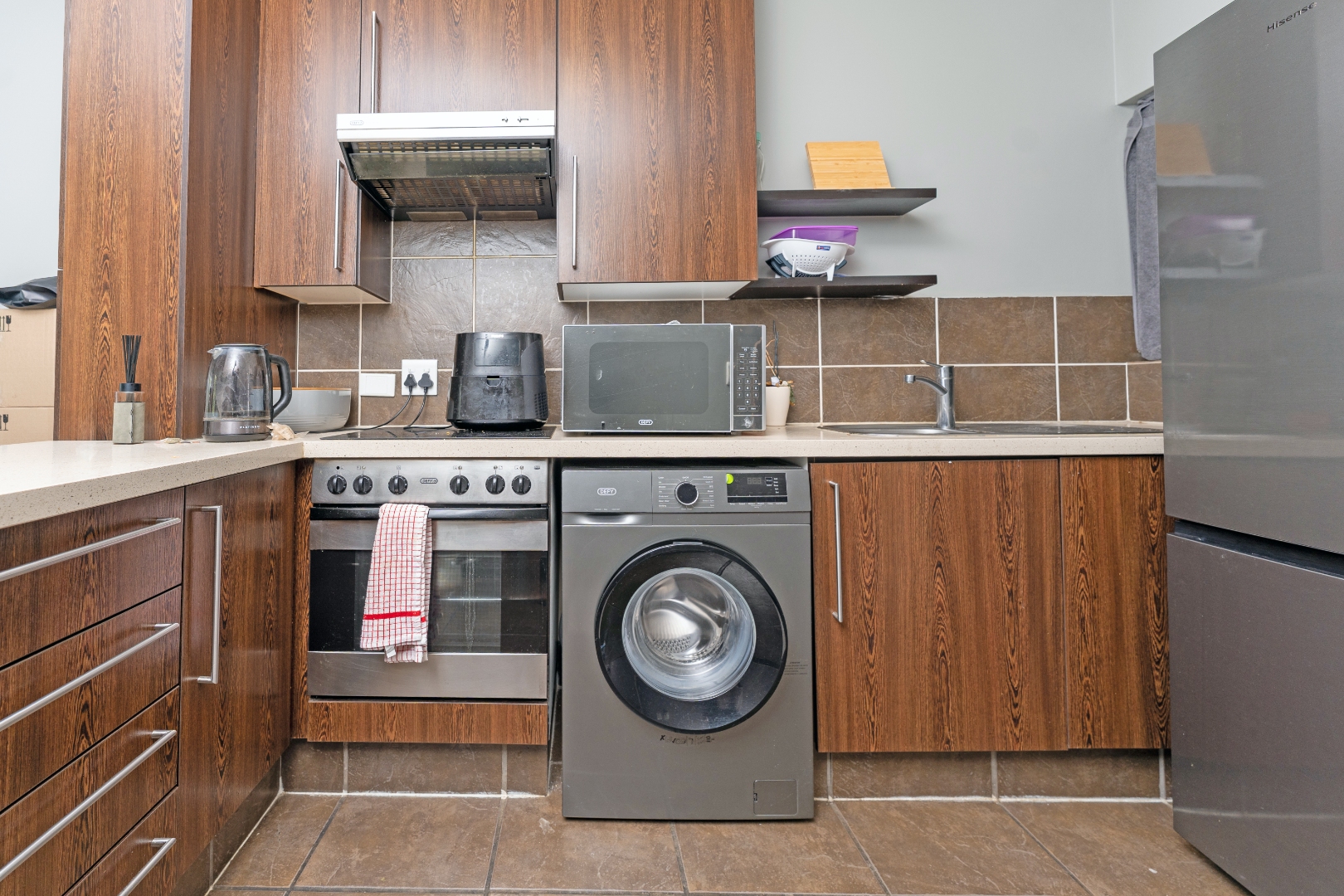 The interior features a functional layout. The kitchen is equipped for daily needs, seamlessly connecting to the main area, creating an open and inviting atmosphere. A private balcony extends the living space outdoors, providing a pleasant spot for relaxation or morning coffee. The design prioritises practicality and ease of maintenance, making it an attractive option for contemporary urban living.