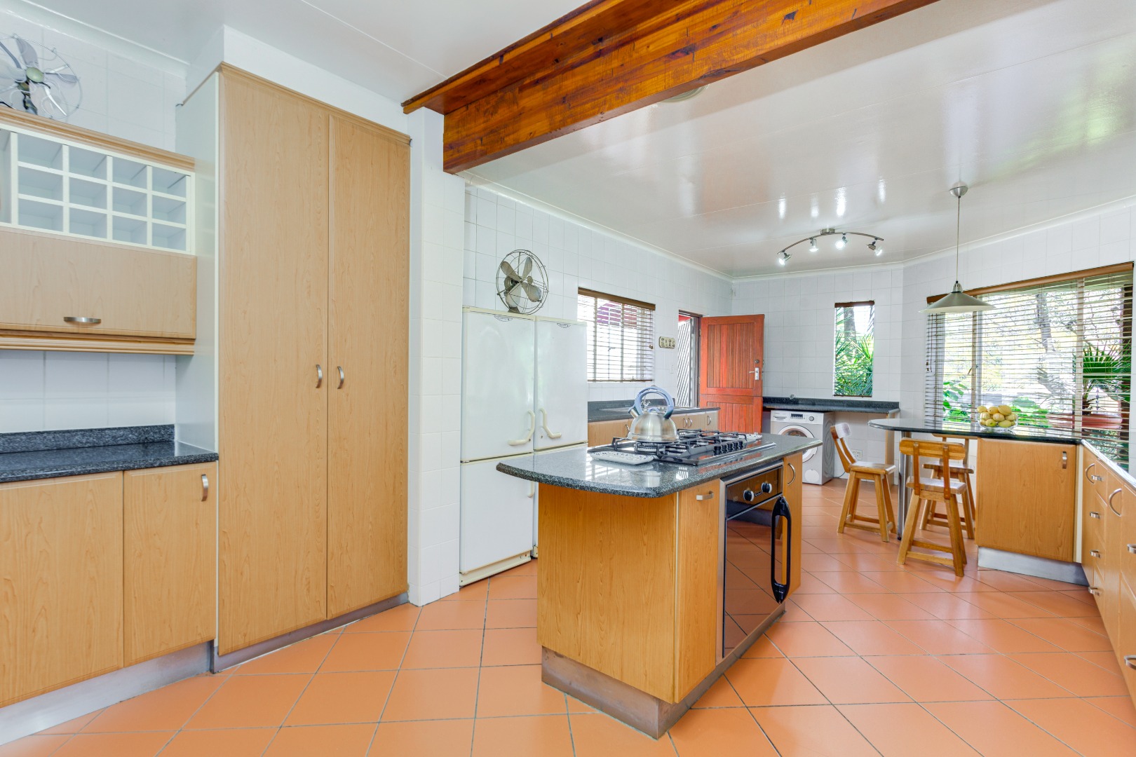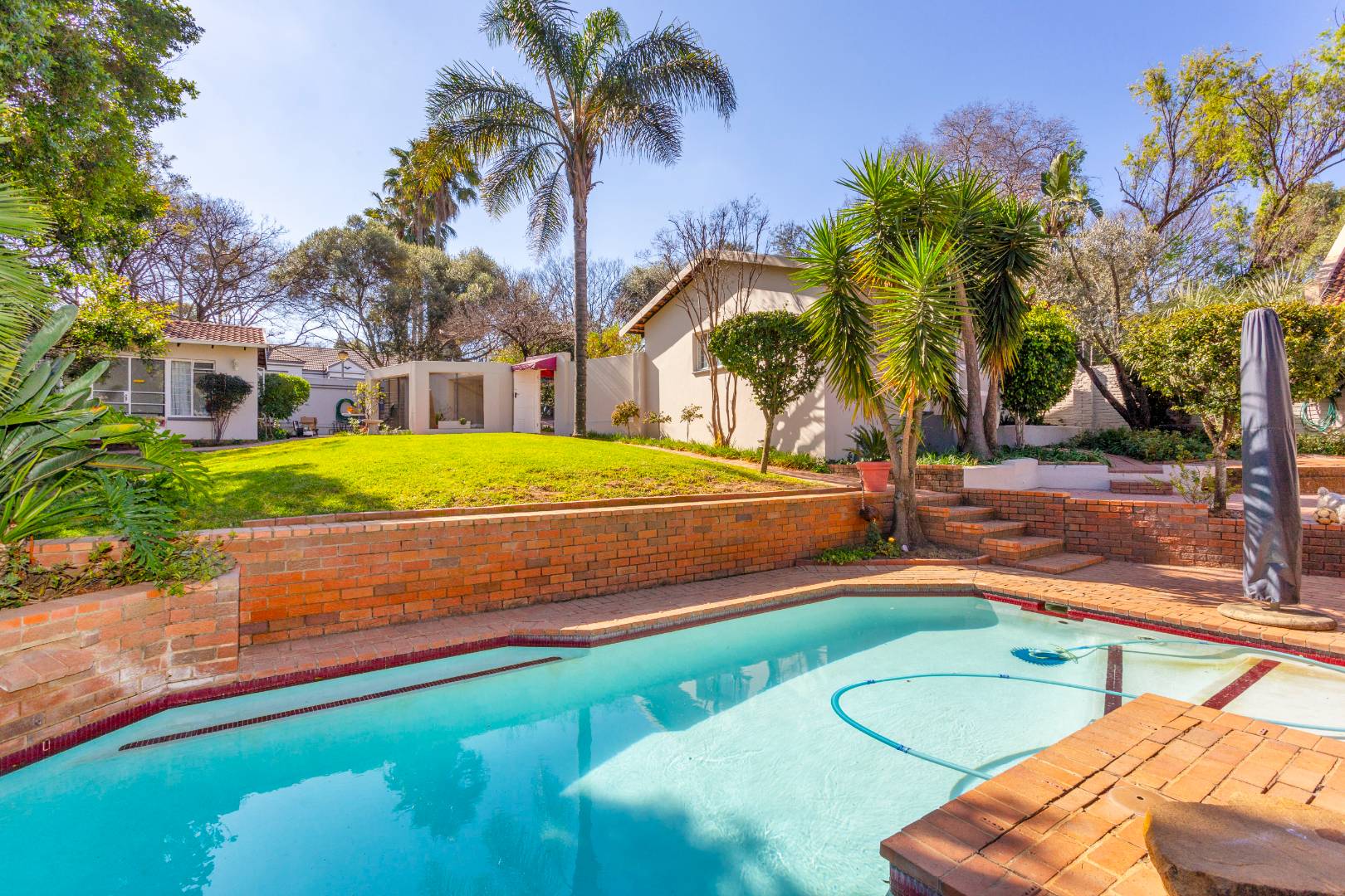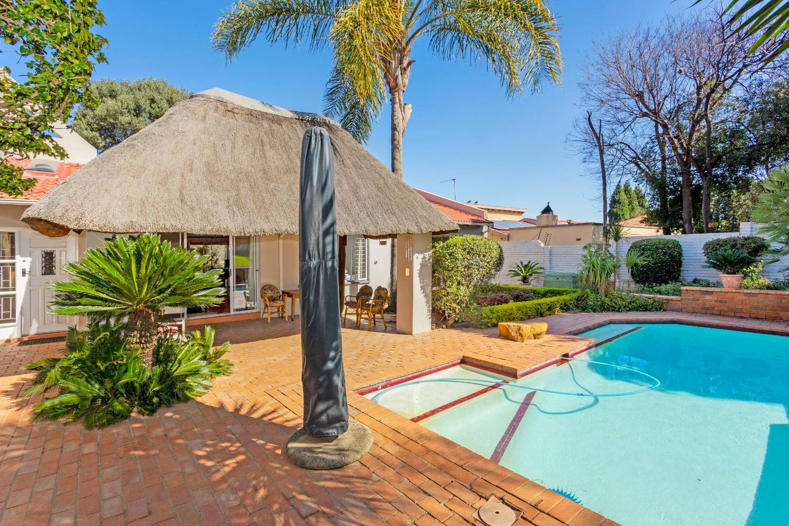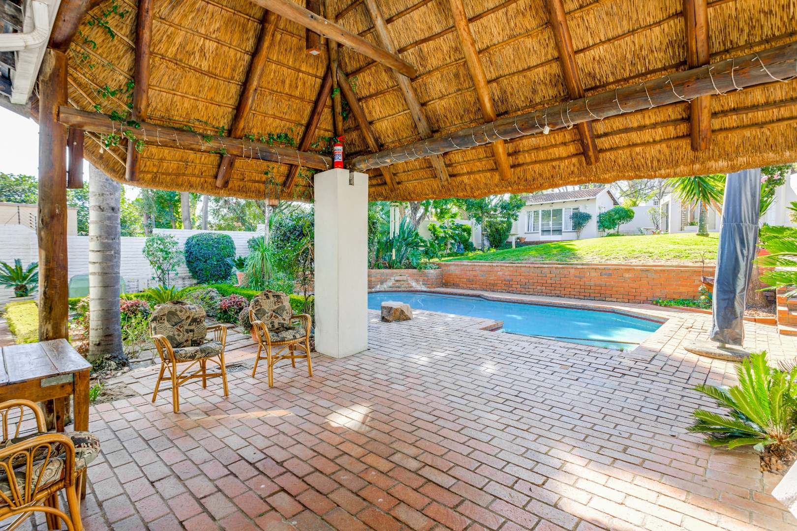 This home is designed for both relaxed living and effortless entertaining, featuring two covered patios, one with a built in braai, a sparkling pool, and three expansive reception areas. The largest reception area has a built in bar as well as a gas fireplace, perfect for entertaining! The heart of the home is a massive kitchen with granite tops, breakfast nook, centre island stove with a gas hob, and space for three undercounter appliances — ideal for families and keen entertainers alike.
