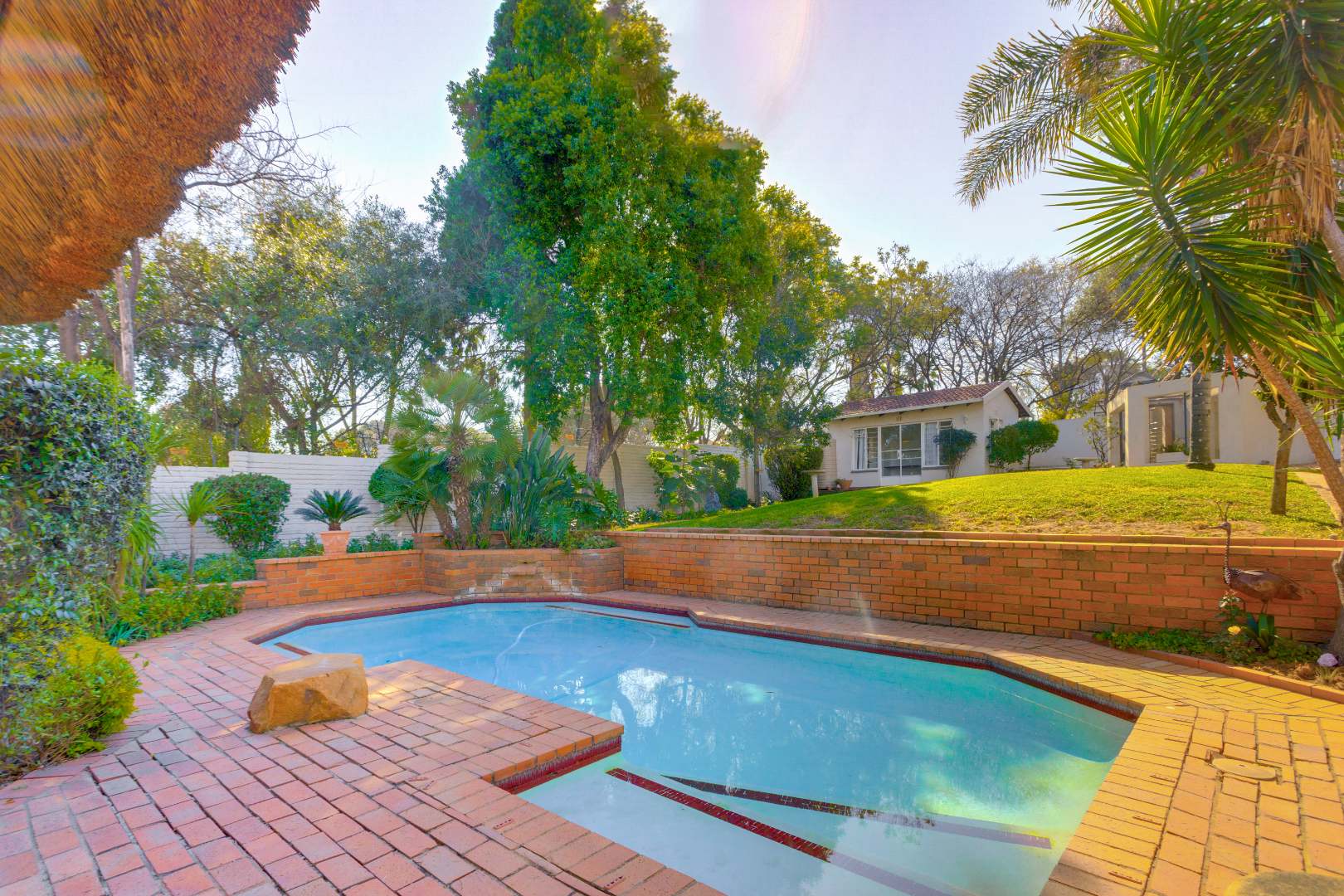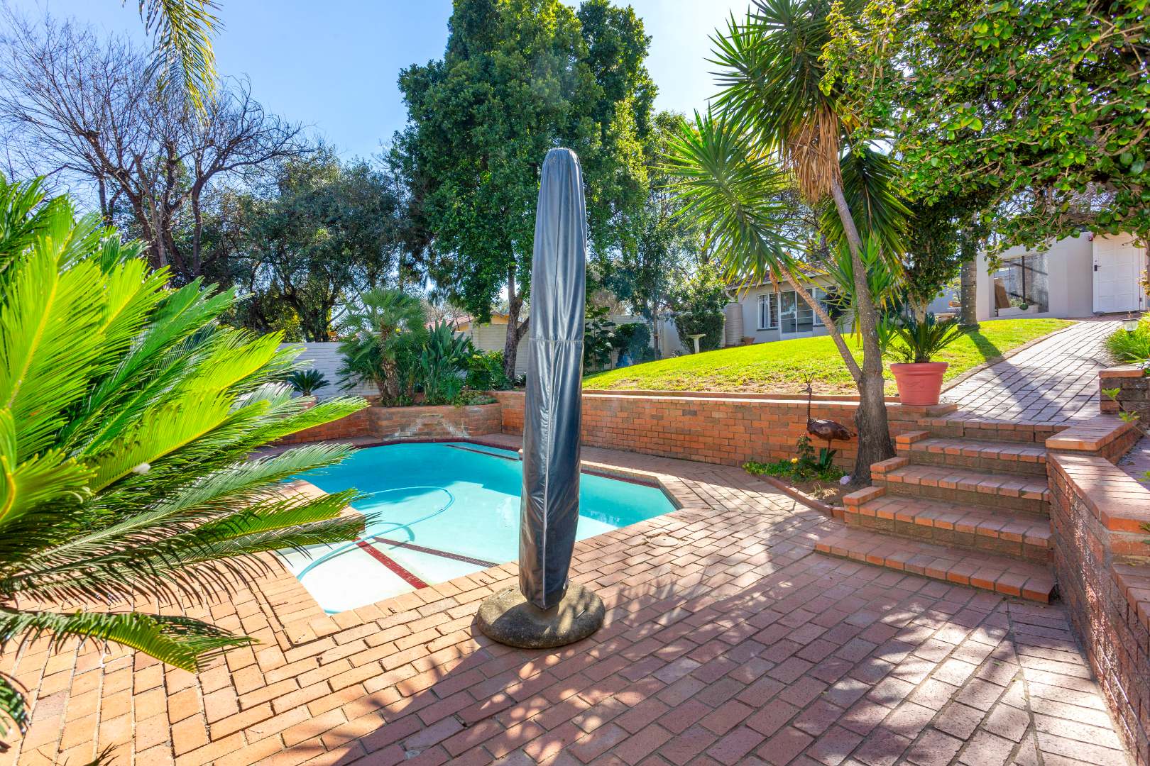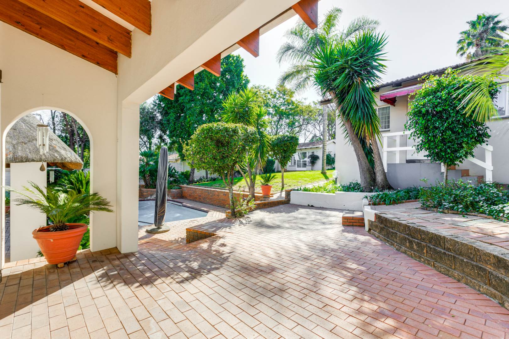 This home is designed for both relaxed living and effortless entertaining, featuring two covered patios, one with a built in braai, a sparkling pool, and three expansive reception areas. The largest reception area has a built in bar as well as a gas fireplace, perfect for entertaining! The heart of the home is a massive kitchen with granite tops, breakfast nook, centre island stove with a gas hob, and space for three undercounter appliances — ideal for families and keen entertainers alike.
