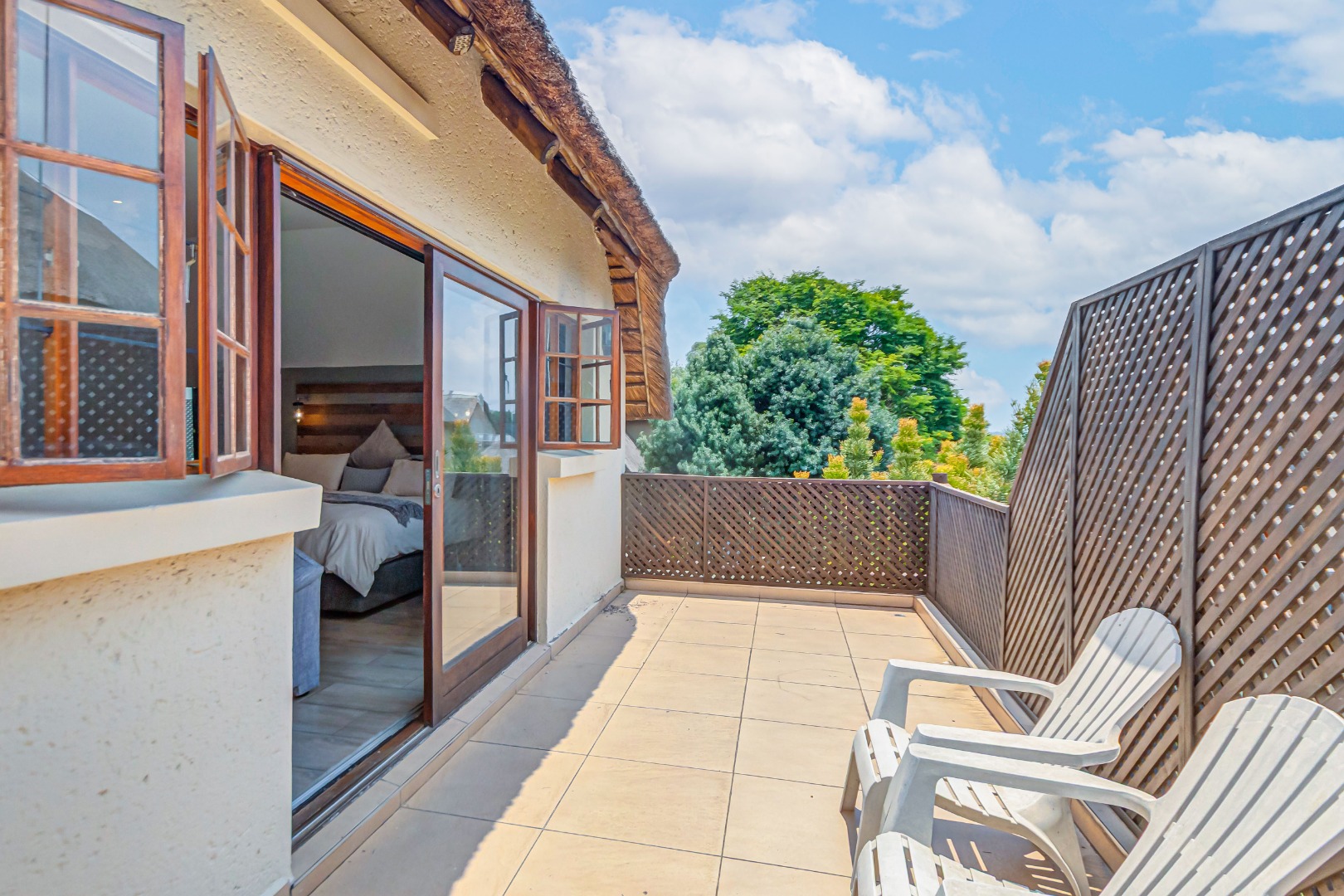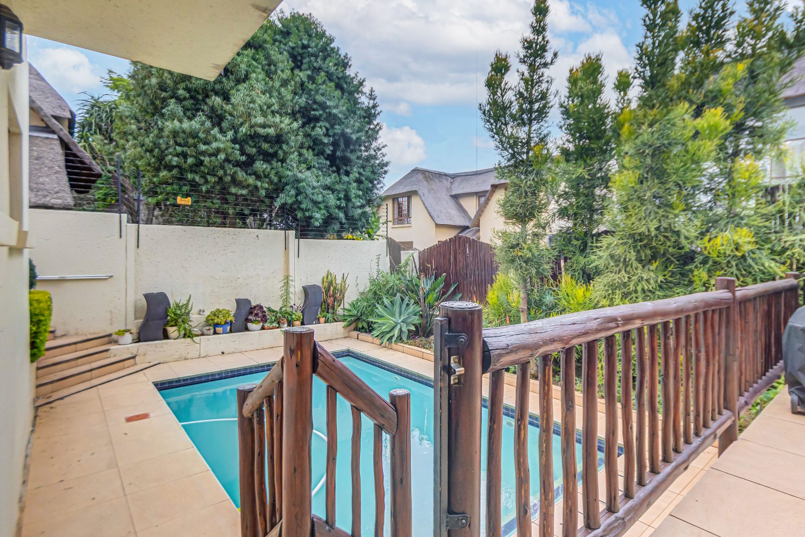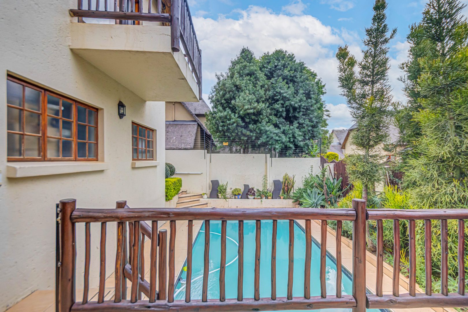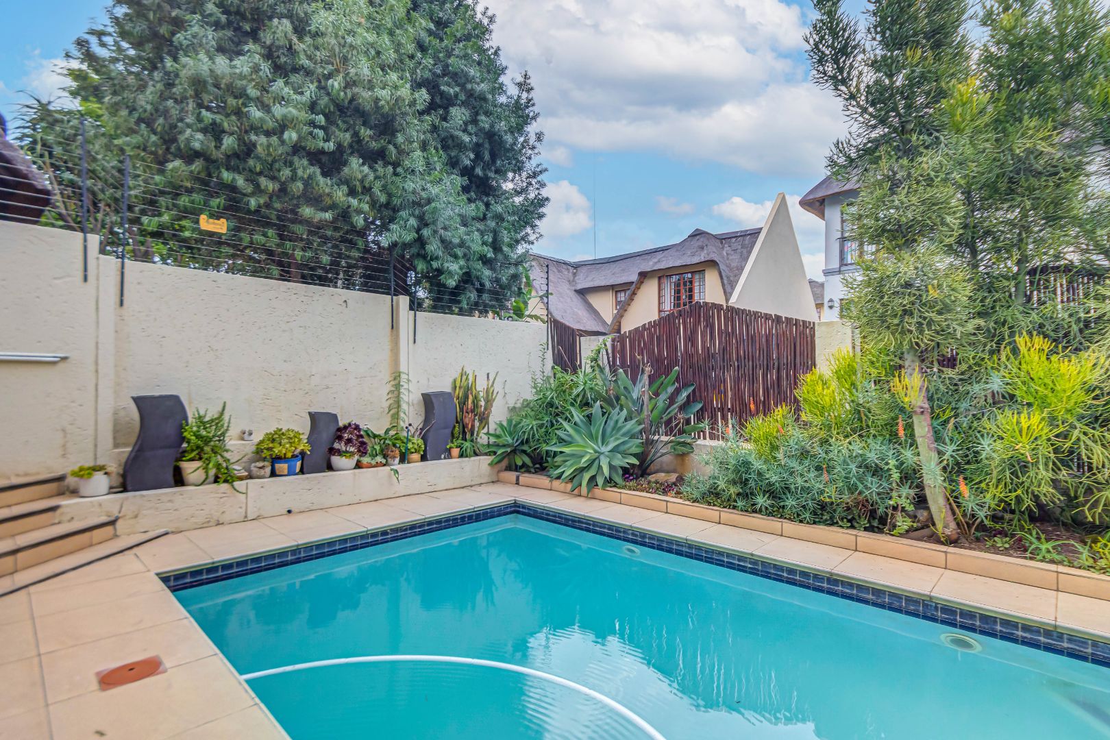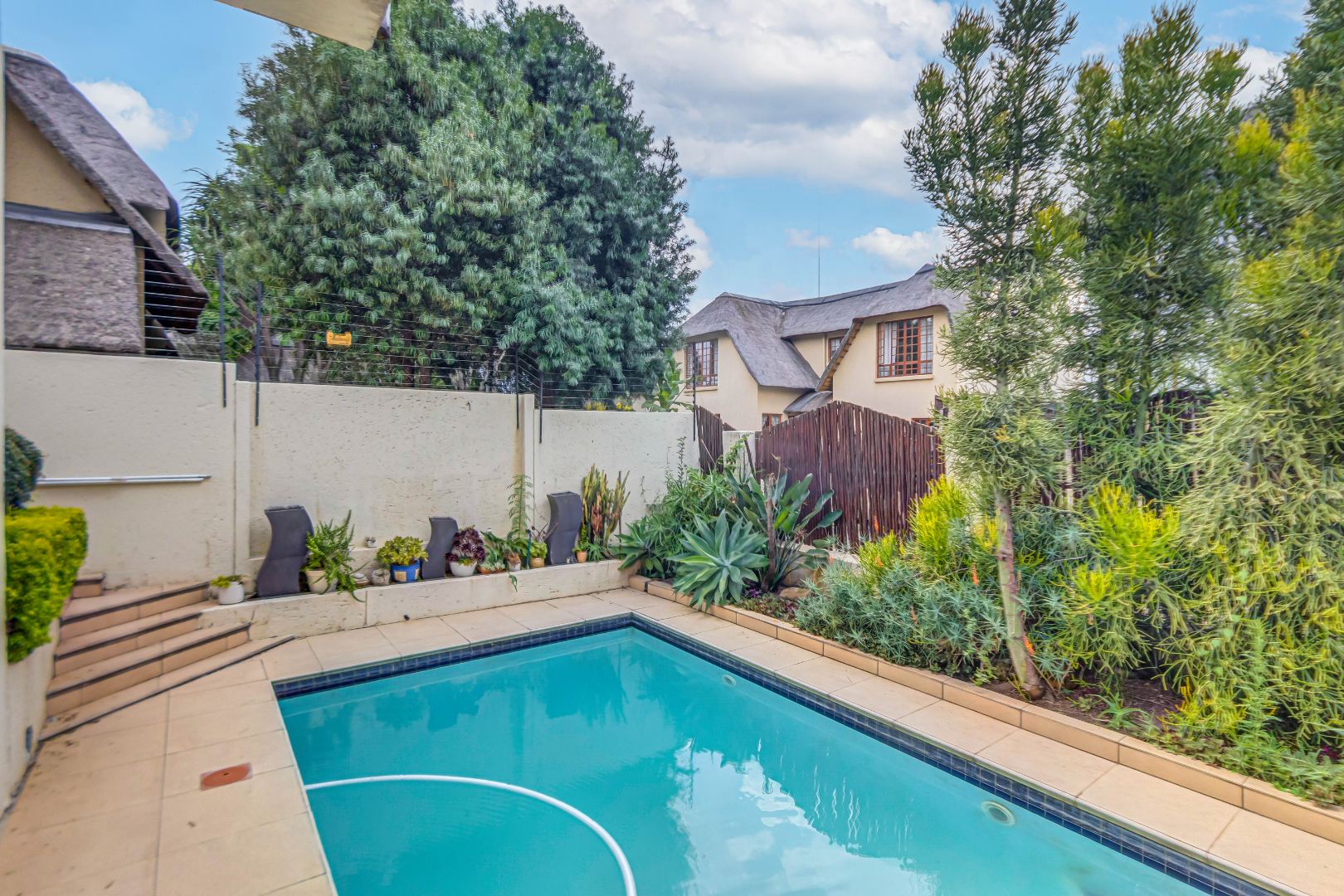 Discover luxury living in this exquisite 4 bedroom, 2.5 bathroom cluster FOR SALE situated in the prestigious Thanda Thula, Douglasdale. This beautiful and spacious, double story, thatched family home offers an expansive open-plan design that seamlessly connects the modern kitchen, living, and dining areas - ideal for effortless entertaining and everyday living. The downstairs area also features a guest toilet, scullery, clever under-stairs storage adding extra practicality, and convenient direct access to the double garage. Upstairs, the main bedroom is a private retreat complete with a large balcony, walk-in cupboard, and full en-suite bathroom. The second bedroom also enjoys its own balcony. All the bedrooms are generously sized. A spacious linen cupboard on the landing adds to the home’s thoughtful design. Stepping outside, there is a large covered patio overlooking a sparkling swimming pool and a low-maintenance garden - perfect for relaxed weekends and hosting friends. The property is fibre ready, pet friendly and located within a secure complex with 24hr security, offering peace of mind and a lock-up-and-go lifestyle without compromising on space or comfort.