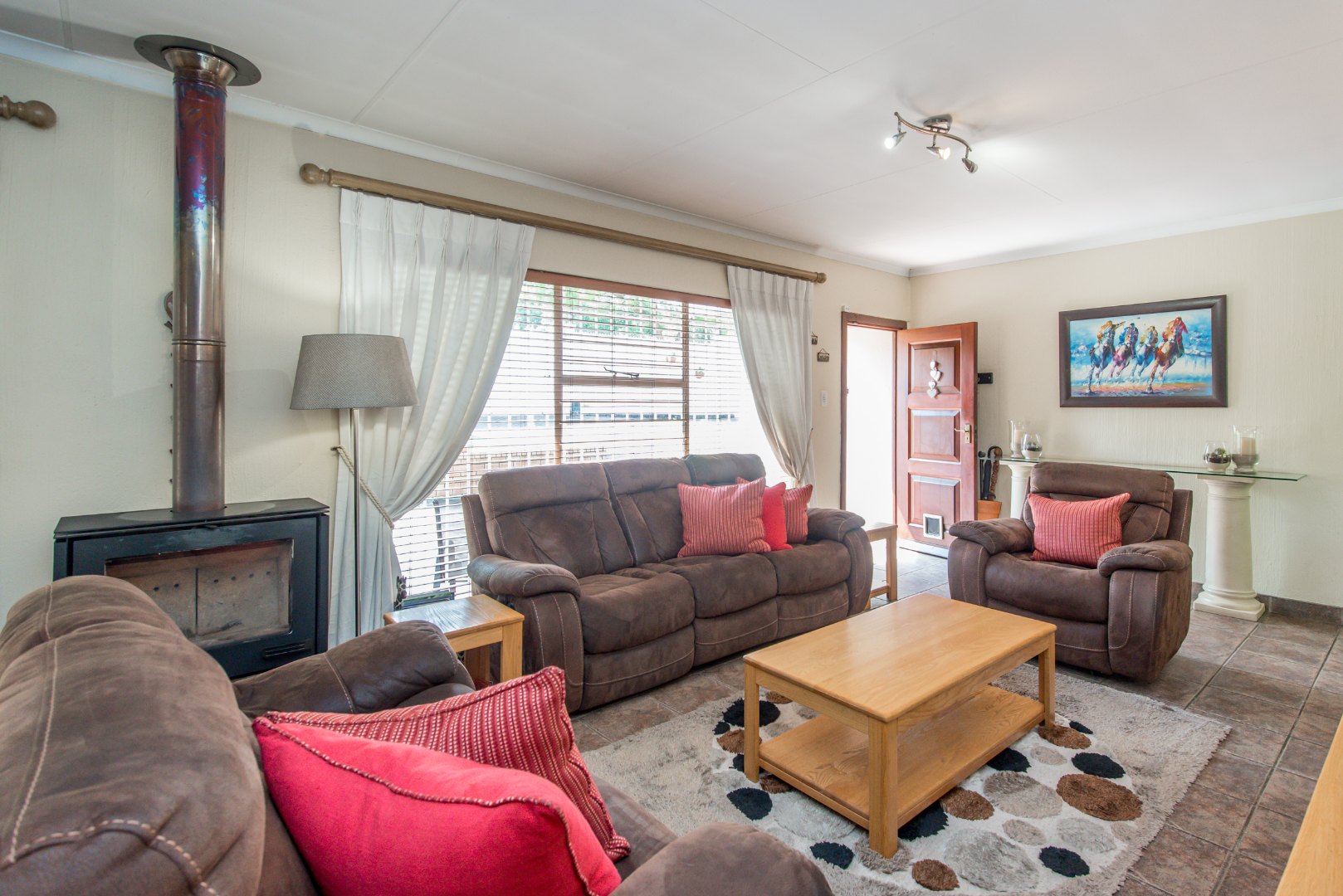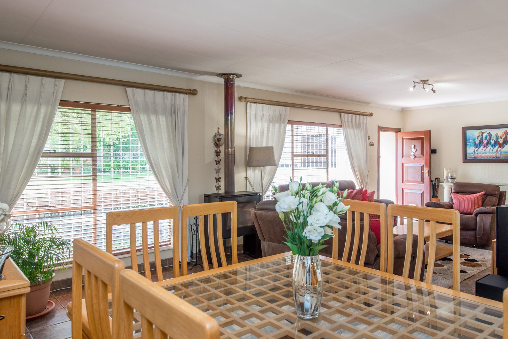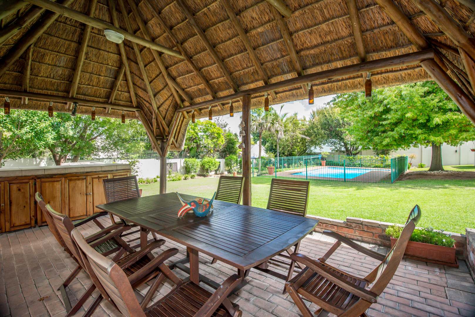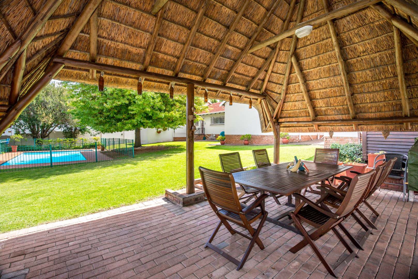 Inside this property, you'll find plenty of light and airy rooms with a massive separate fully equipped cottage, a separate entrance to a fairly large office space/study, a charming lapa, a massive sparkling swimming pool, a magnificent garden where tall lush trees surround the boundary walls, a boma tucked away in a peaceful corner of the garden, an open plan dinning room and lounge with a combustion fireplace in the centre – The two kitchens mean you'll never run out of cooking space, whether you're whipping up a quick snack in the cottage or hosting a big dinner party in the main house. Plus, it's got that lovely outdoor lifestyle vibe in the garden for the ones that enjoy entertaining family, friends, playdates for kids, your furry friends will love it too! and has the space for lots of celebrations/functions/parties to be held throughout the year.