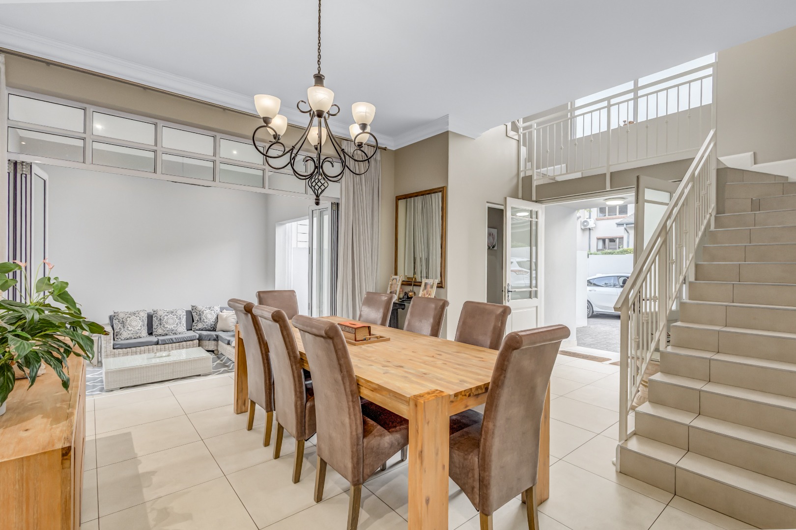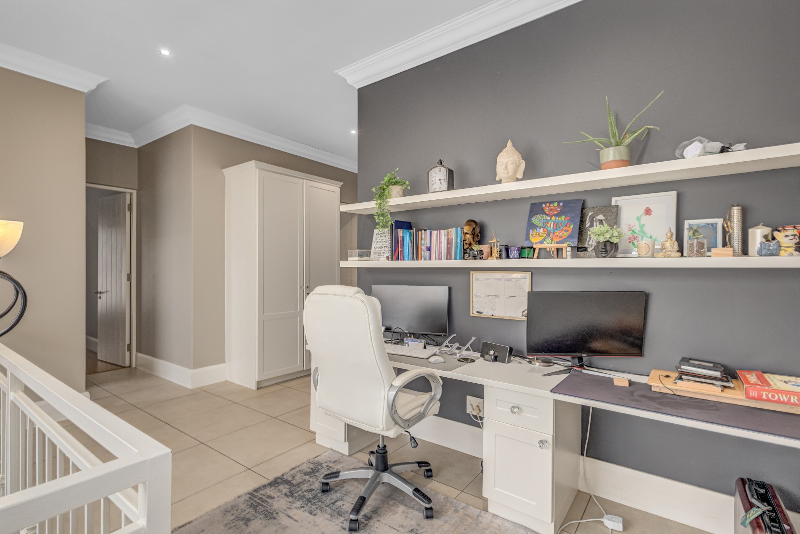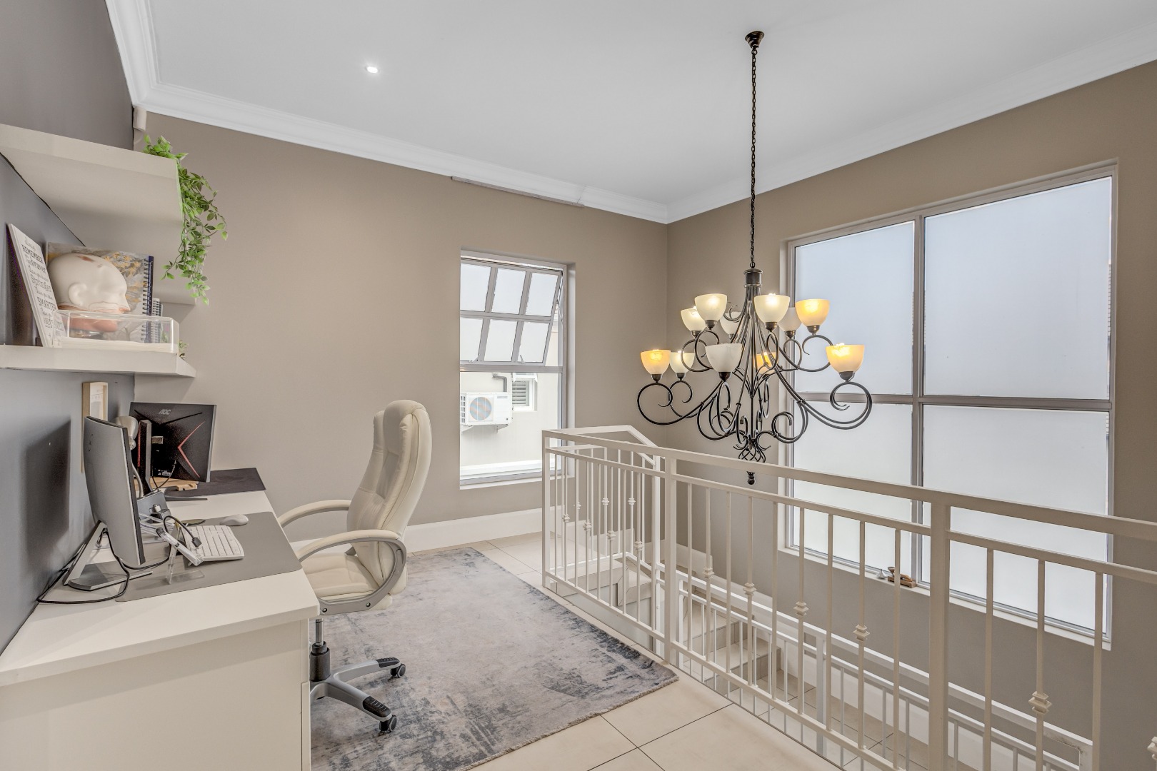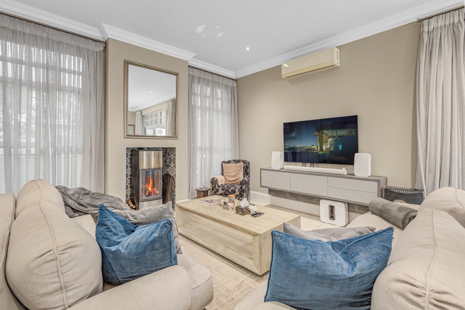 Nestled in the heart of the sought-after Hawthorn Village Estate, this beautifully maintained 4 bedroom, 3.5 bathroom family home offers the perfect blend of elegance, space, and functionality. Designed for modern living, all four bedrooms are located upstairs, each featuring laminate wooden flooring and built-in cupboards. The main bedroom is a true retreat with its walk-in cupboards, luxurious en-suite bathroom boasting a ball-and-claw bath and double vanity, and a private balcony ideal for enjoying your morning coffee. The second and third bedrooms are ideal for children and share easy access to a modern bathroom with a shower, while the fourth bedroom serves perfectly as a guest suite with a full bathroom nearby. A study nook on the landing creates the ideal work-from-home or homework space. Downstairs, you’re welcomed into a large, light-filled open-plan living area that seamlessly combines the lounge, dining room, and kitchen. The living area is enhanced by double-volume ceilings, an inviting fireplace, and air conditioning for year-round comfort. The spacious kitchen offers ample storage, workspace, and modern finishes, making it the perfect hub for family gatherings. Stacking doors open onto an entertainment patio that overlooks a beautifully manicured garden, creating the perfect indoor-outdoor flow for entertaining or simply relaxing in peace. The home also includes a double automated garage with extra storage, battery backup power, aluminum window and door frames and excellent security, making it the ideal family sanctuary in a premium estate setting.